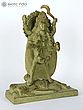 In statues in which Kali overwhelms Shiva and tramples him under her feet Shiva is usually represented : prone or upright, as completely inactive, as in this statue. Though her nudity is covered by her ornaments, usually the girdle of severed arms, Kali in any form is traditionally unclad. The goddess stands on the body of Shiva who lies upright on a rectangular pedestal. Lord Shiva is in his usual iconographic aspect : ‘jata-juta’ – matted hair, ‘tri-netra’ – third eye, ‘tri-punda’, the auspicious mark on the forehead, the tiger-skin’s loincloth and a snake in hand.