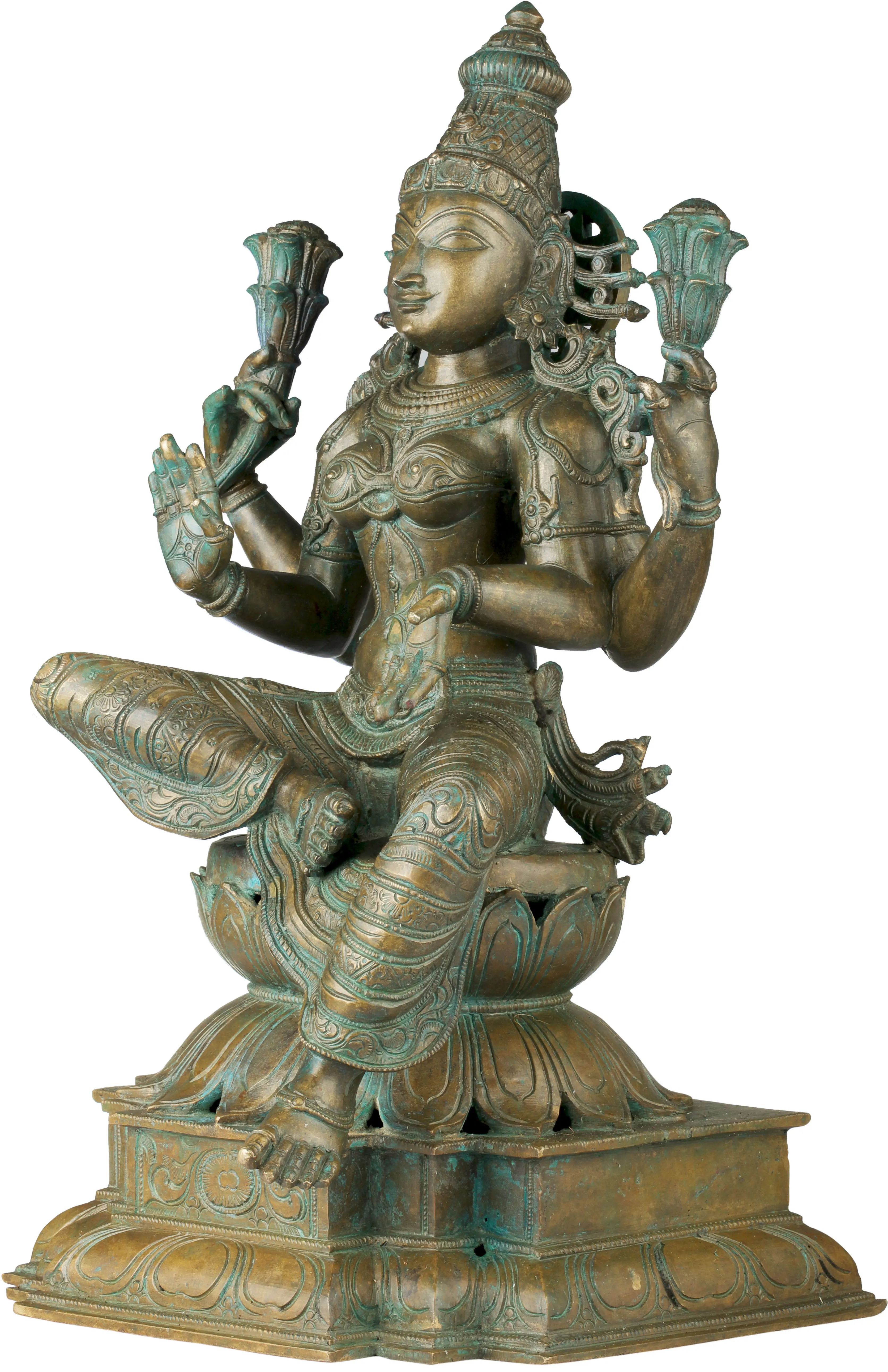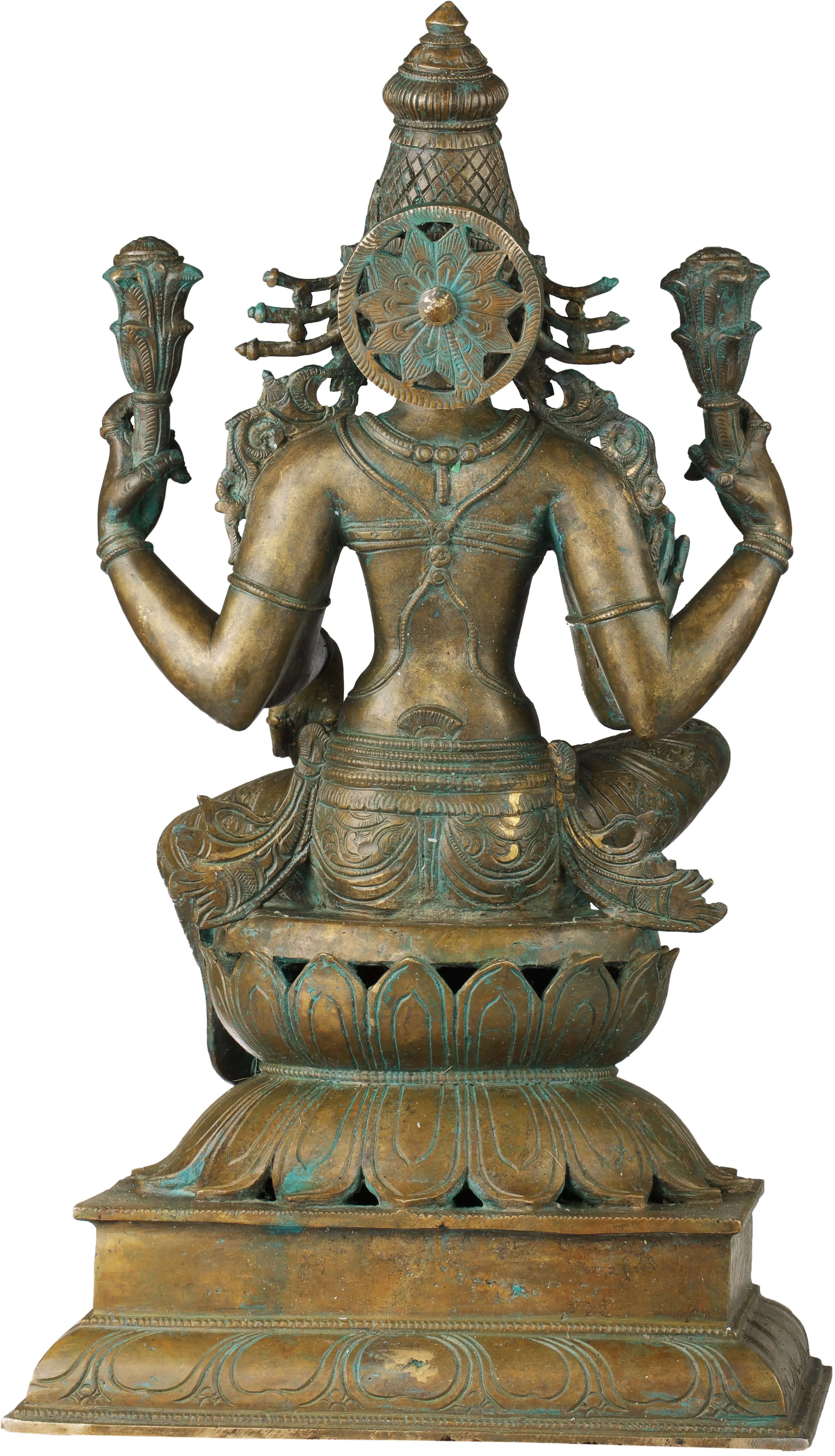 Note how graceful Her stance is, portrayed with a skill that is practically endemic to Southern India. She is seated in lalitasana on a gigantic lotus, beneath which is another inverted lotus. The two-tiered pedestal that the lotuses are on are engraved with lotus petals (the bottom-most tier) and a wave-like silhouette that refer to the story of Her birth. She was born as Vishnu's wife, complete with mangal-sutra and toe-rings and kamalasana, from the oceans that the devas and asuras were churning with all their respective strength and vigour (samudramanthan). What make this a highly characteristic Indian bronze are the towering crown, the superbly defined features and limbs, and the inimitable composure of countenance.