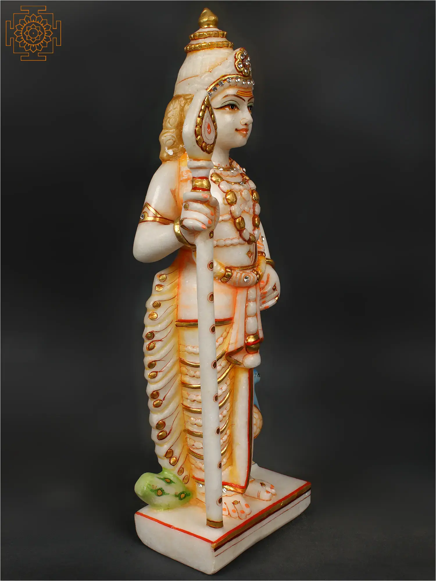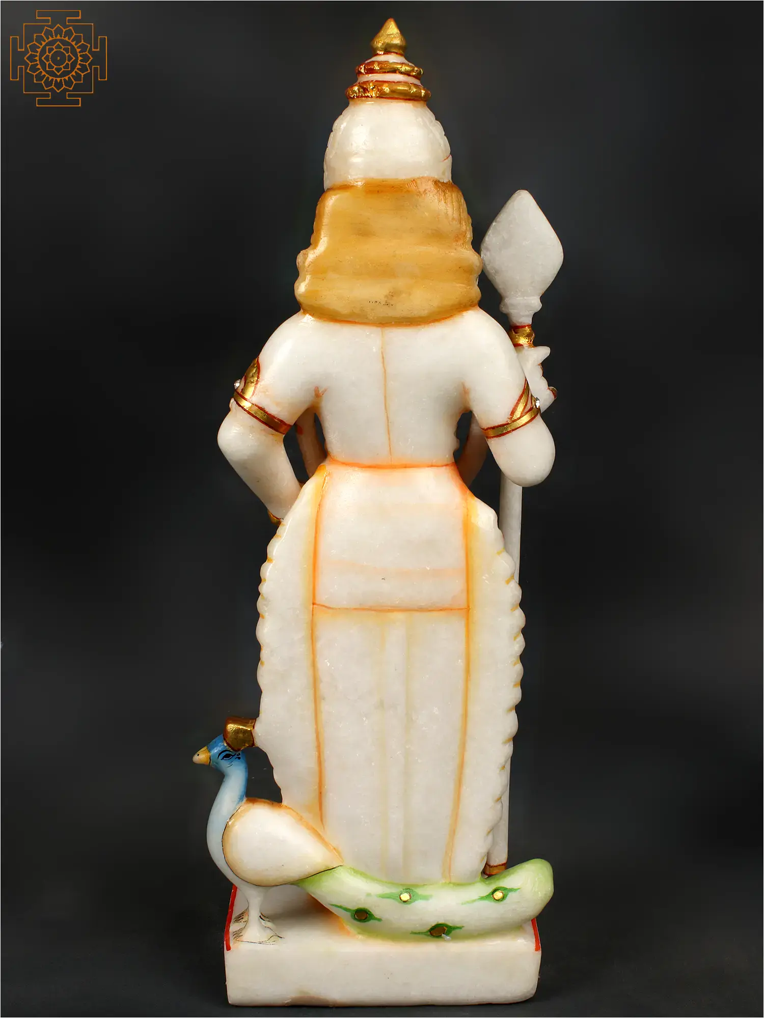 Lord Kartikeya is an ancient Hindu god of war also named as Murugan, Skanda popularly worshipped in South India, Sri Lanka and Malaysia. He is an embodiment of perfection, commander-in-chief of the celestials and the one created to destroy demons and negative traits in human beings. This Kartikeya marble statue stands in his iconographic standing posture on a pedestal; although carved in usual figurine but its beauty is enhanced by the way it is sculpted in out of a single piece of marble in pure white unfurling an aura of purity, love, divinity and immeasurable charm.