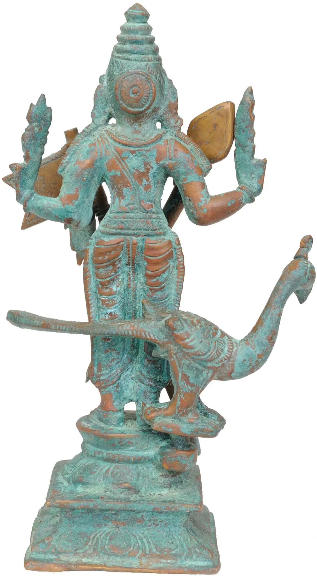 This exquisite bronze statue captures the majestic presence of Kartikeya, the Hindu god of war, victory, and wisdom. Revered as the commander of the celestial armies, Kartikeya is a figure of immense power and strategic brilliance, embodying the spirit of courage and the triumph over adversity. This intricately crafted piece, with its rich patina hinting at antiquity, is a testament to the enduring artistry and deep spiritual heritage of Indian iconography. The deity is depicted with his characteristic multiple arms, each holding symbolic weapons and emblems that represent his divine attributes. His posture is one of readiness and strength, a perpetual guardian against demonic forces and the embodiment of righteous victory. The detailed ornamentation on his attire and crown speaks to the grandeur associated with his celestial status. The presence of the peacock, Kartikeya's divine mount, signifies his swiftness, vigilance, and mastery over ego. The peacock, often seen as a symbol of royalty and beauty, also represents the ability to rise above the mundane and to tread on the venom of worldly desires. ––––––––––