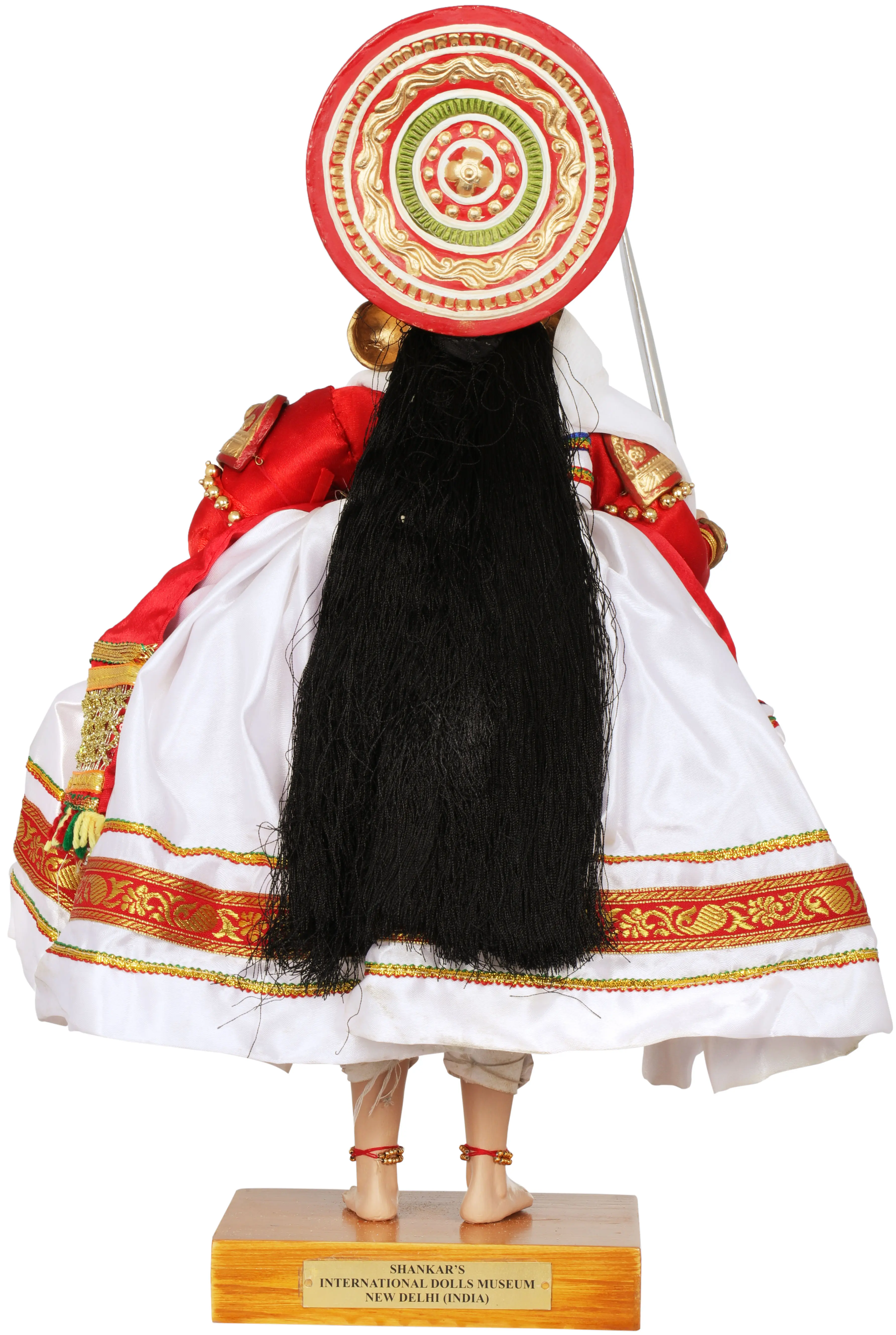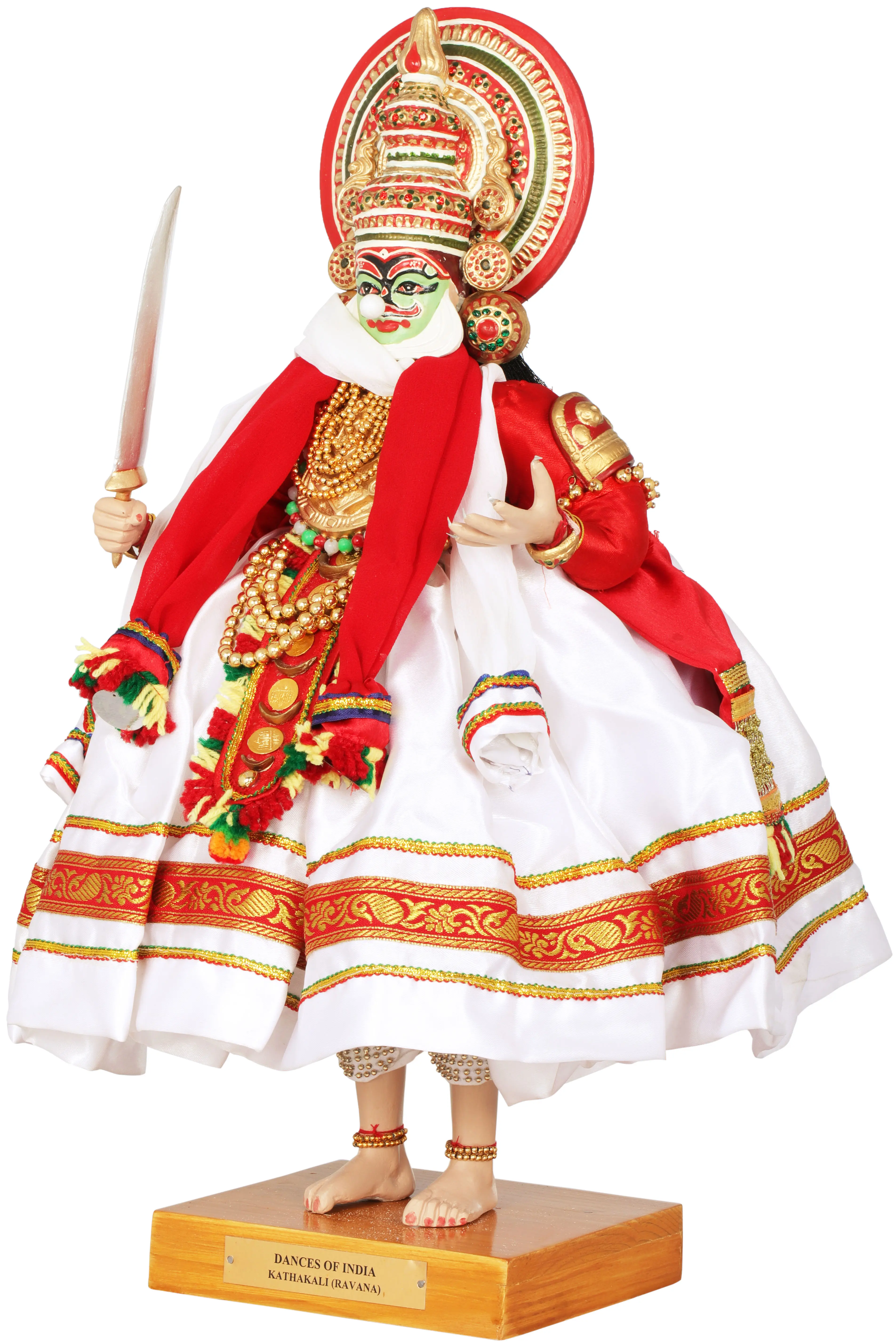 This green colored face (pachcha makeup) represents the excellence or heroism of a warrior; vibrant red lips portray the noble characters like, Rama, Krishna, Shiva etc. Red moustache and black heavy eye makeup indicates the evil nature such as that of Ravana, therefore it is also called the Ravana form. White colored beard shows the divine being such as Hanuman. Face masks, head gears, big and vibrant costumes with enormous jewels accentuate the inner natures of the characters being played. There is a big charming multi layered and multi colored aureole at the back of a three layered big temple like crown. This doll wears a white colored dress with red and white stole wrapped around its neck. Long and open hairs represent their freedom and fierceness; holds a sword in the right hand and left hand has big nails symbolizing power and strength.