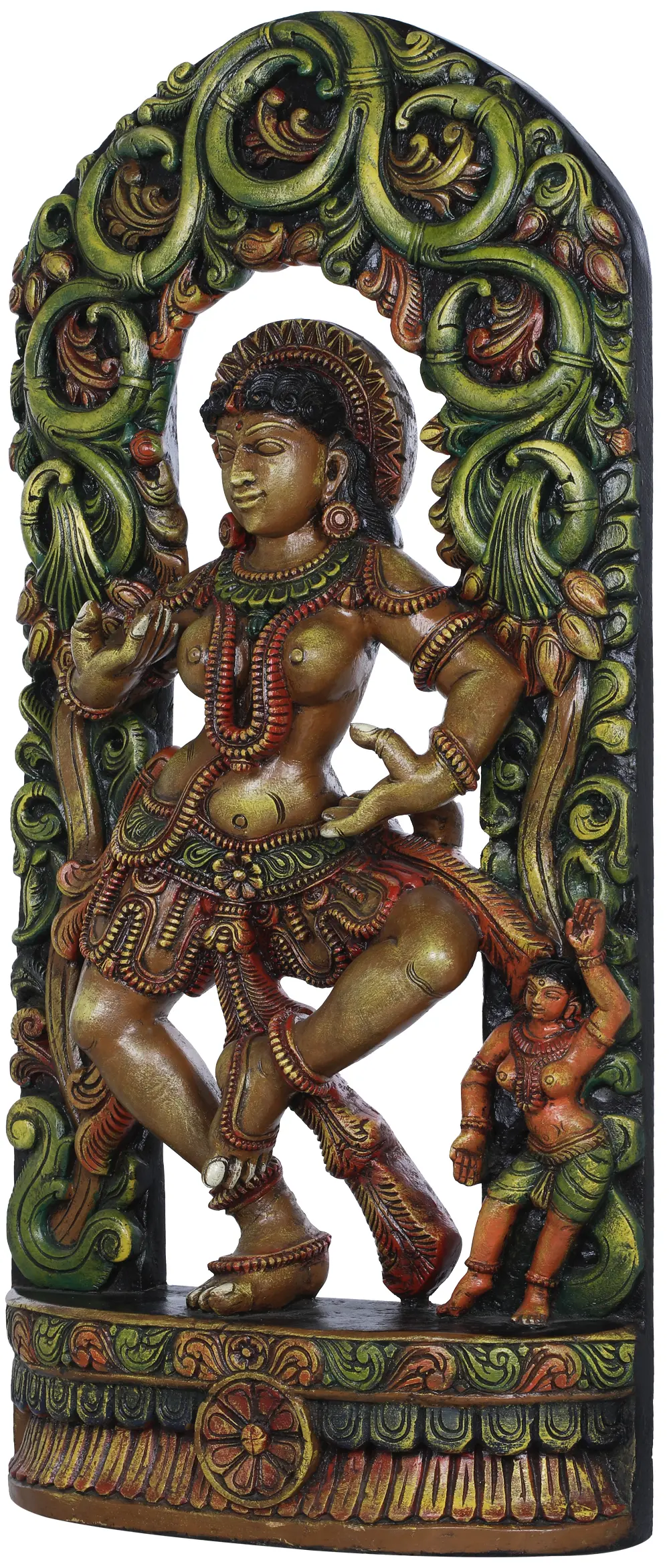 The simple colour palette complements the organic medium of this Khajuraho-style composition. Green and red and the occasional bit of ochre, in cool pastel tones. The base colour is a deep brown that is washed out in places, and is to be found on the woman’s skin as well as on the pedestal upon which she dances. The same is superimposed with colourful shringar on her person and luxuriant vines on the surface of the aureole. A row of similarly gorgeously coloured lotus petals is to be found on the ornate pedestal beneath the feet of the nymph.