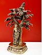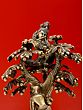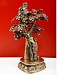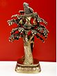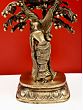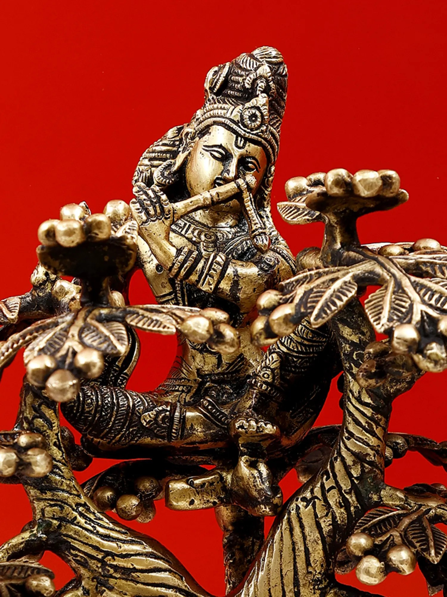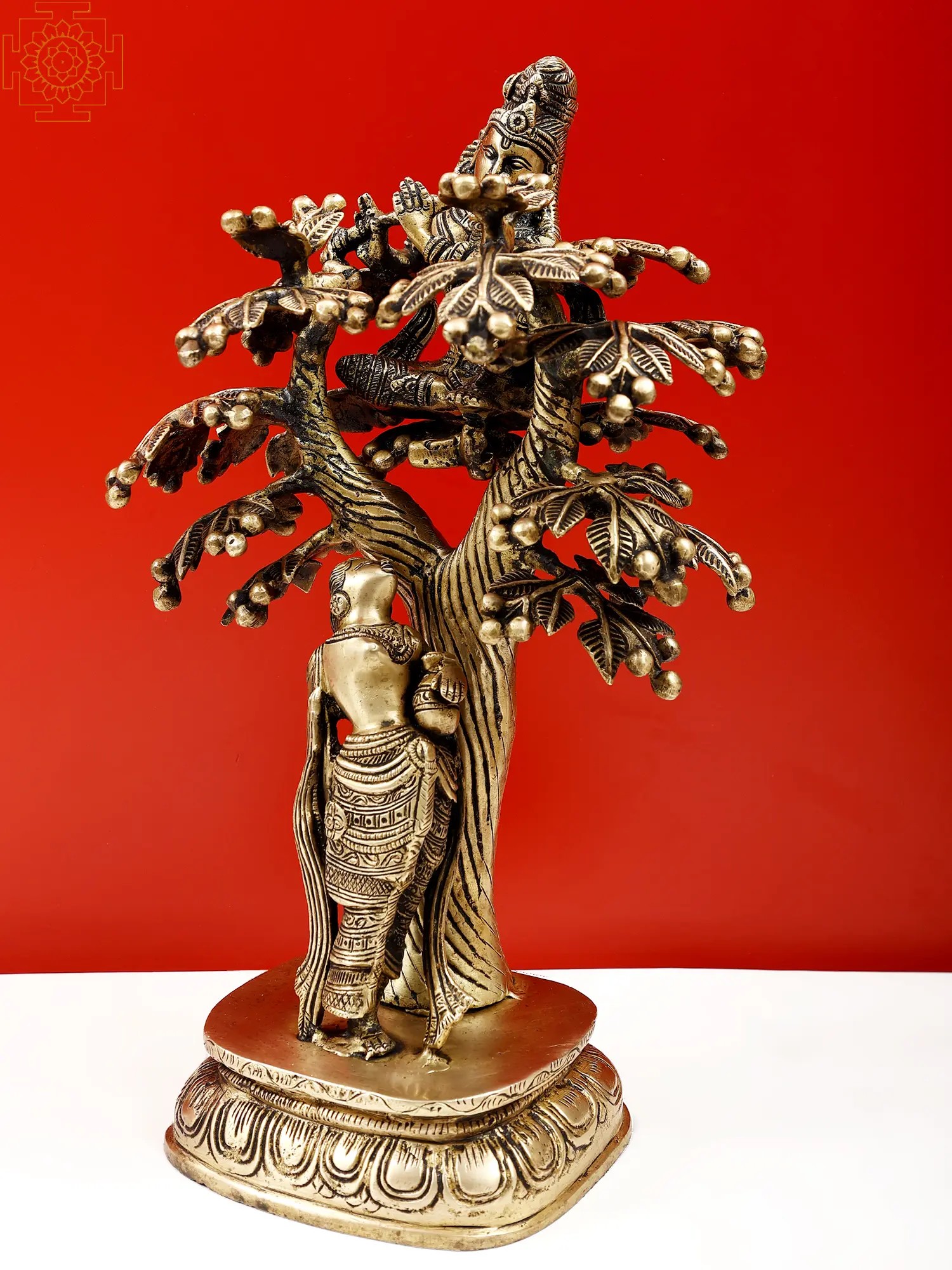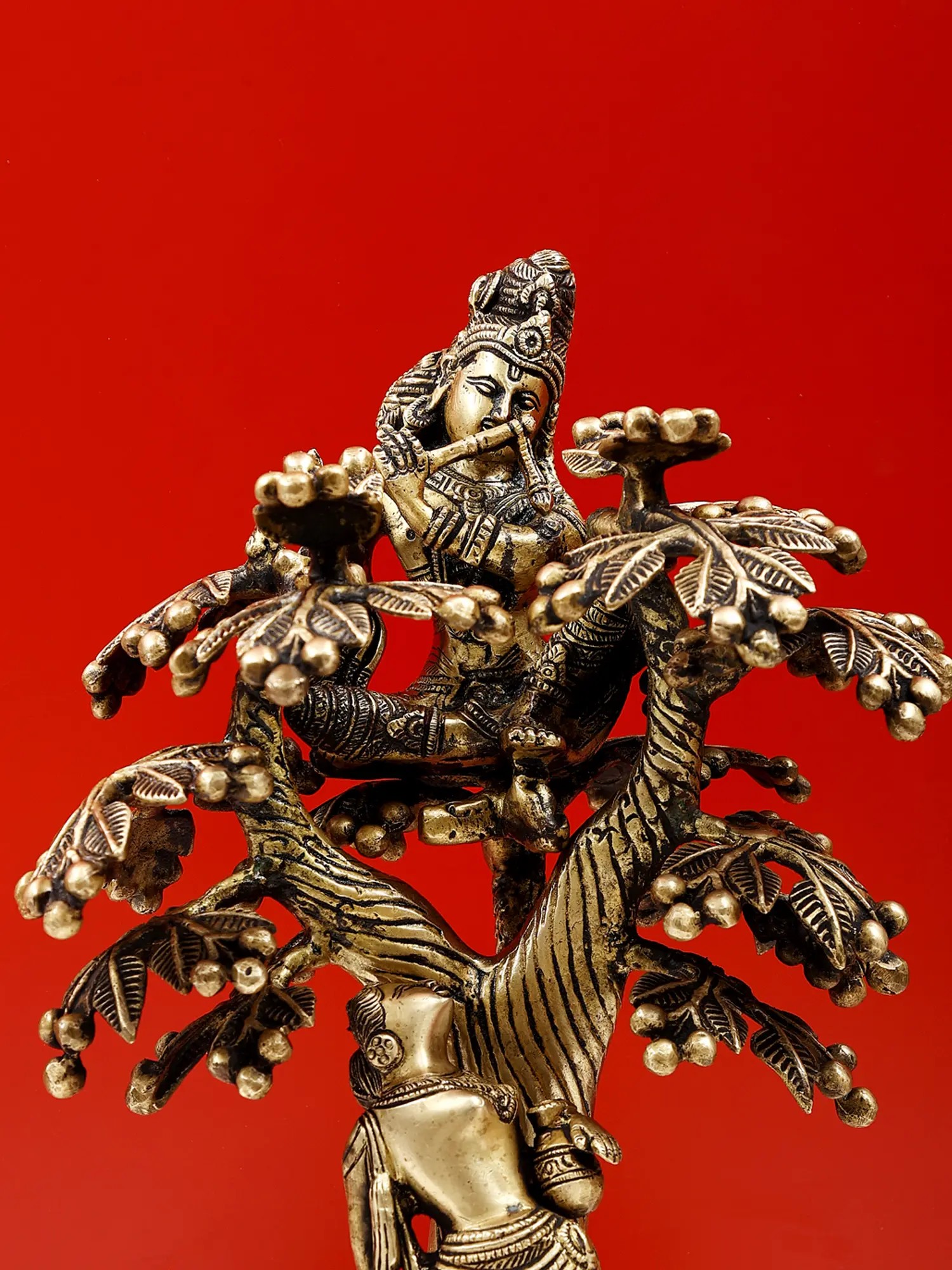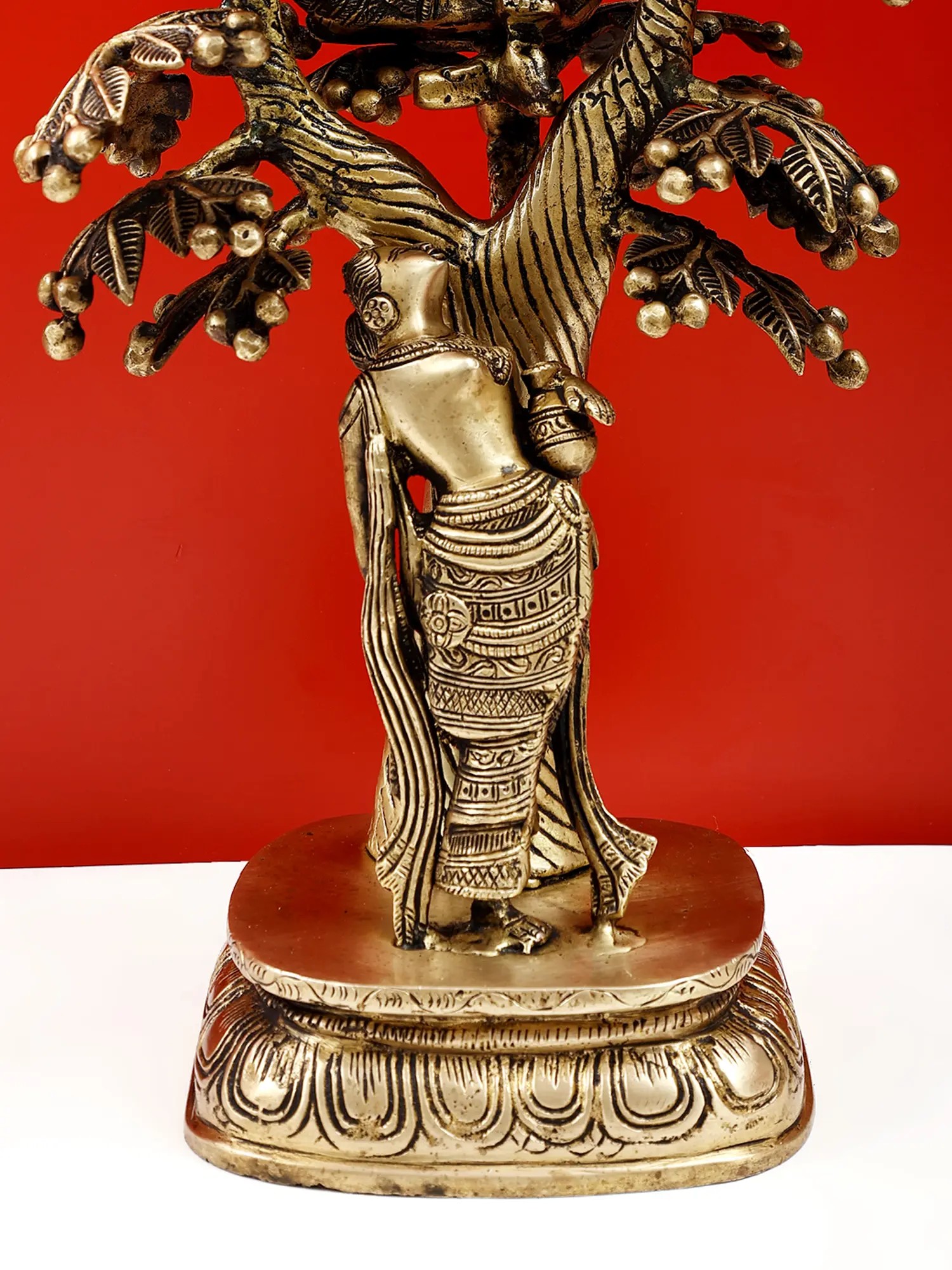 In this gorgeous brass statue, a fluting Krishna sits atop the Kadamba tree, while an enchantingly adorned Radha tries to take a glimpse. The Kadamba tree is covered in fruits, acting as the asana for Murlidhar. A youthful Krishna sits comfortably on the top of the tree, decorated in jewels. Radha's figure under the tree is smoothly polished, with a bare upper body. Her dhoti is profusely decorated with natural and geometrical designs. A small pot of water rests on the slender waist of Sri Radha. The message contained in this image is as beautiful as the idol itself. The Lord guides his beloved human soul through the divine music of his flute. It is up to the aatman to look past the Maya or illusion and reach out to the Paramatma.