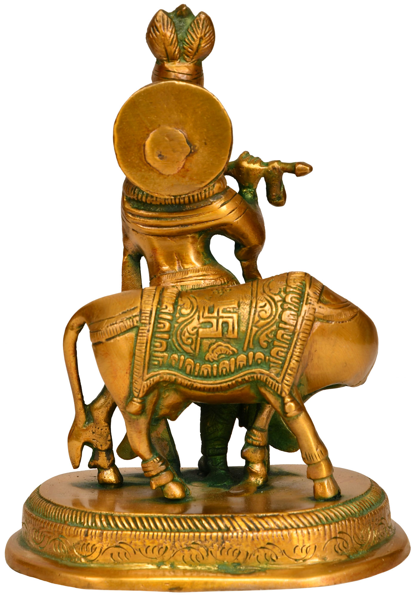 Meticulously cast in brass, this statue showcases the artistry and dedication of skilled craftspeople. The warm, golden hue of the brass is beautifully complemented by subtle hints of verdigris, adding a vintage charm and depth to the piece. The intricate carvings and patterns on Krishna's garments and the cow's adornments are rendered with precision, bringing the figures to life. The sturdy, ornamented base provides a stable foundation, allowing this divine artwork to be proudly displayed in any sacred space, home, or office. This statue is more than just a decorative item; it is a conduit to spirituality, a reminder of the divine presence that pervades the world and a piece that can bring peace and blessings to its surroundings. It is a beautiful embodiment of devotion and a timeless piece of art that resonates with centuries of spiritual tradition.
