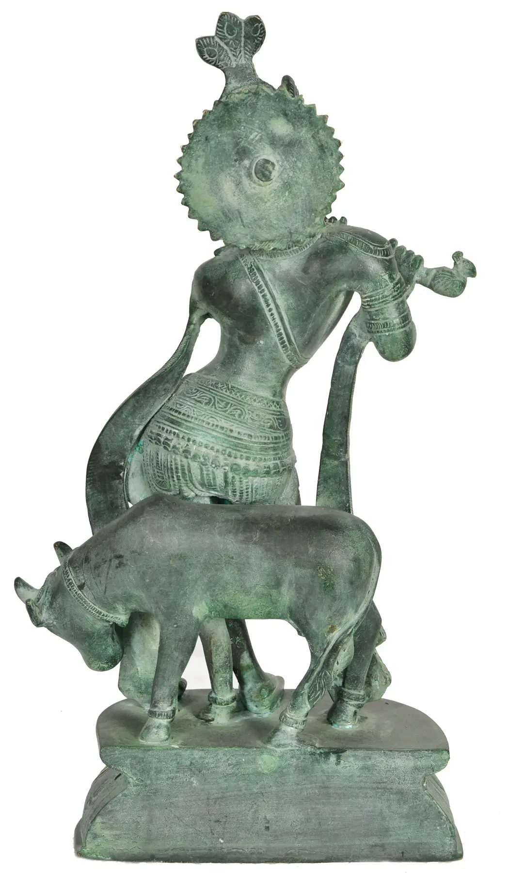 Standing beside the lord is a gentle cow, a symbol of abundance, nourishment, and the pastoral charm of Vrindavan. In Hindu mythology, cows are revered as sacred creatures, often associated with the divine mother and the sustenance of life. Lord Krishna's deep connection with the cows is a cornerstone of his tales. He was a cowherd in his youth, tending to the herds with unwavering affection. The melodious tunes from his flute were said to mesmerize not only the Gopis (cowherd maidens) but also the cows, the birds, and even the trees, creating an atmosphere of unparalleled peace and joy in the forests of Vrindavan. This statue beautifully encapsulates this harmonious relationship, a testament to Krishna's loving guardianship over all living beings. ––––––––––