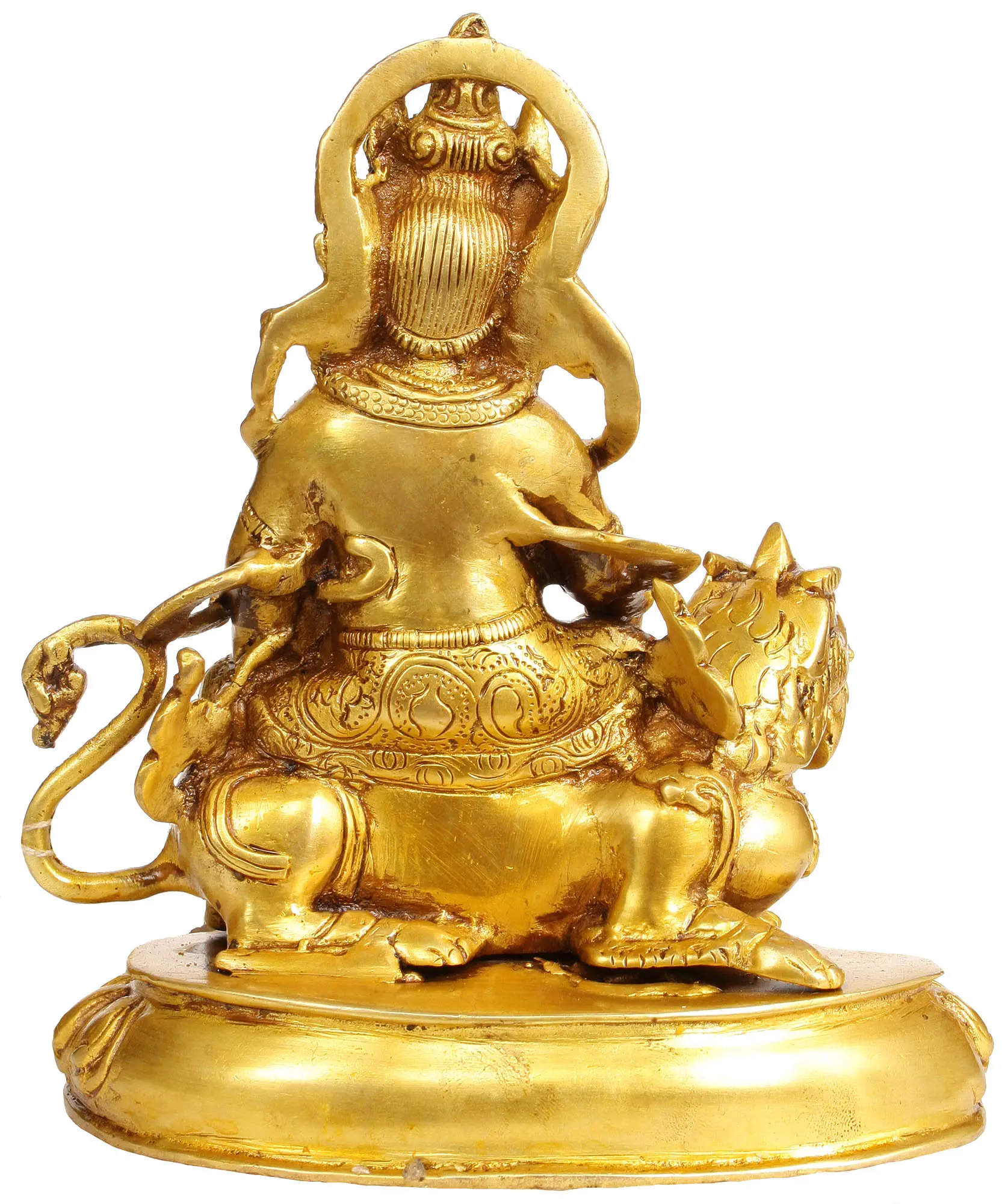 Each statue is a testament to the skill and dedication of master artisans. Crafted from high-quality brass, this piece exhibits remarkable detail and a rich, golden sheen. The sculptor has masterfully captured the divine aura of Kubera, from the serene yet commanding expression on his face to the ornate jewelry and flowing garments. The powerful depiction of the lion, with its muscular build and fierce countenance, adds to the statue's dynamic presence. The base of the statue, adorned with intricate patterns, further enhances its aesthetic appeal and spiritual significance. This brass statue is not just an object of worship but a piece of art that will be cherished for generations, radiating an aura of divine grace and material prosperity.