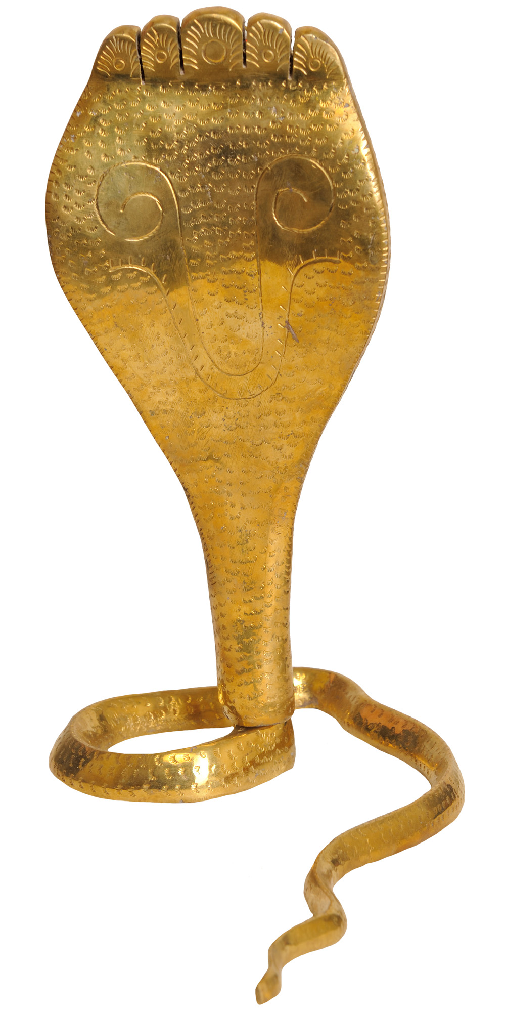 Originating from the rich artistic heritage of South India, this bronze statue showcases the region's long-standing tradition of metal casting. The meticulous craftsmanship involved in creating such a detailed and lifelike representation of a cobra is a testament to the enduring legacy of these artistic practices. Each curve and contour of the serpent has been carefully shaped, bringing forth a sense of movement and vitality. This piece is not merely an object of decoration but a conduit to centuries of cultural and spiritual narrative, a tangible connection to the ancestral wisdom and artistic prowess of South India.