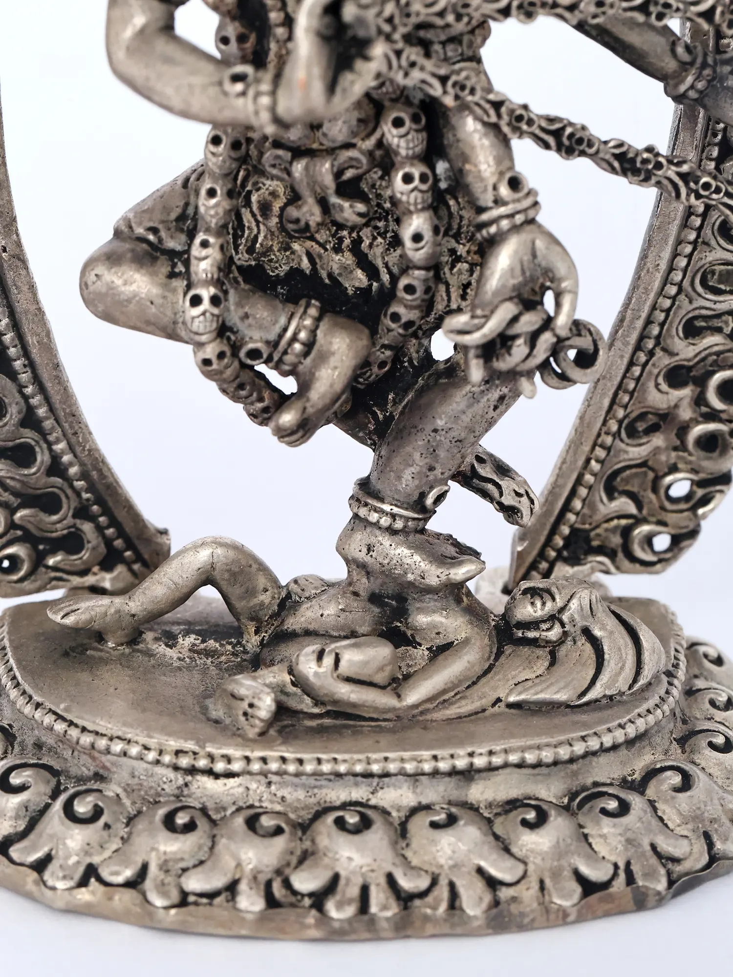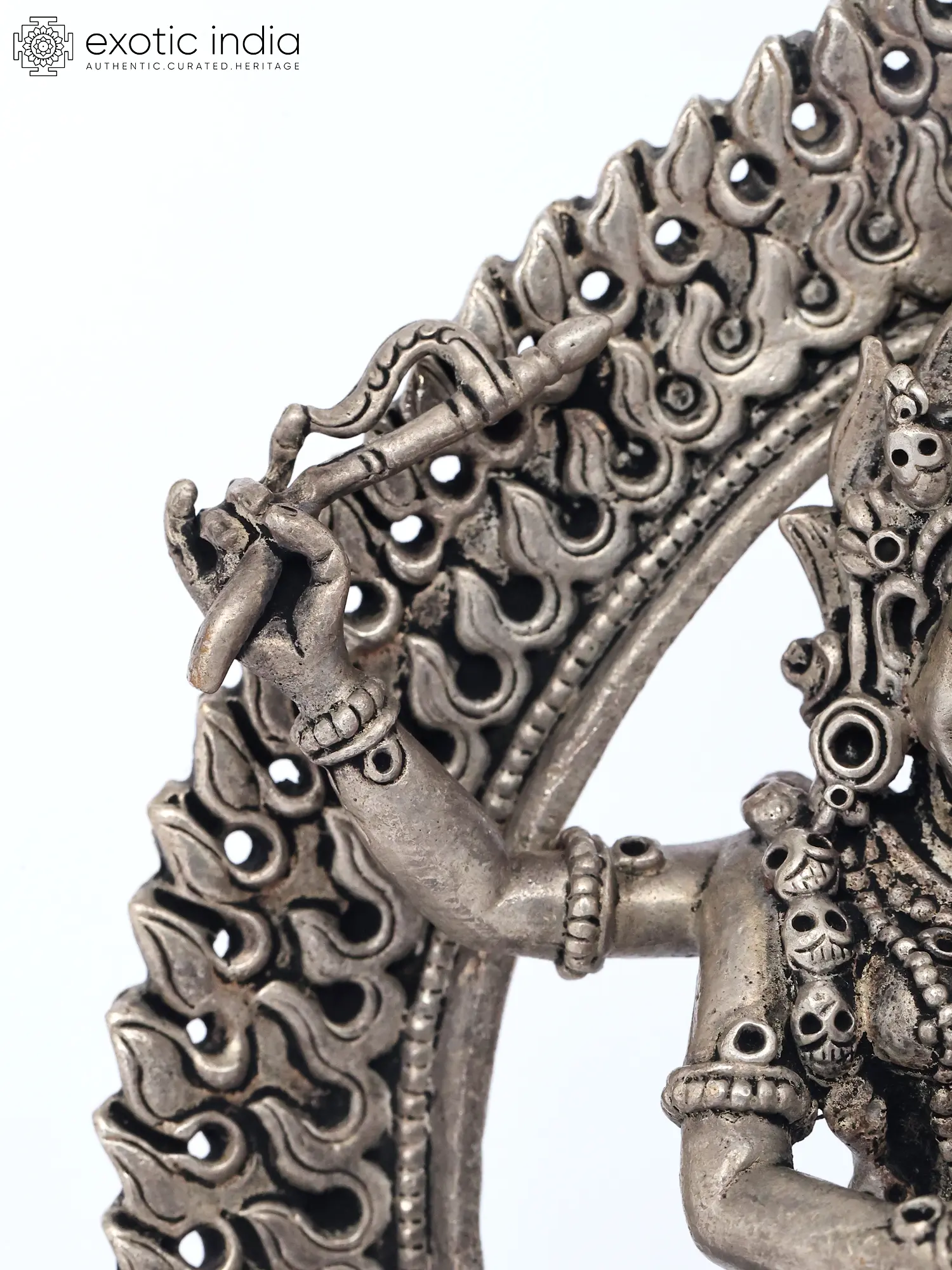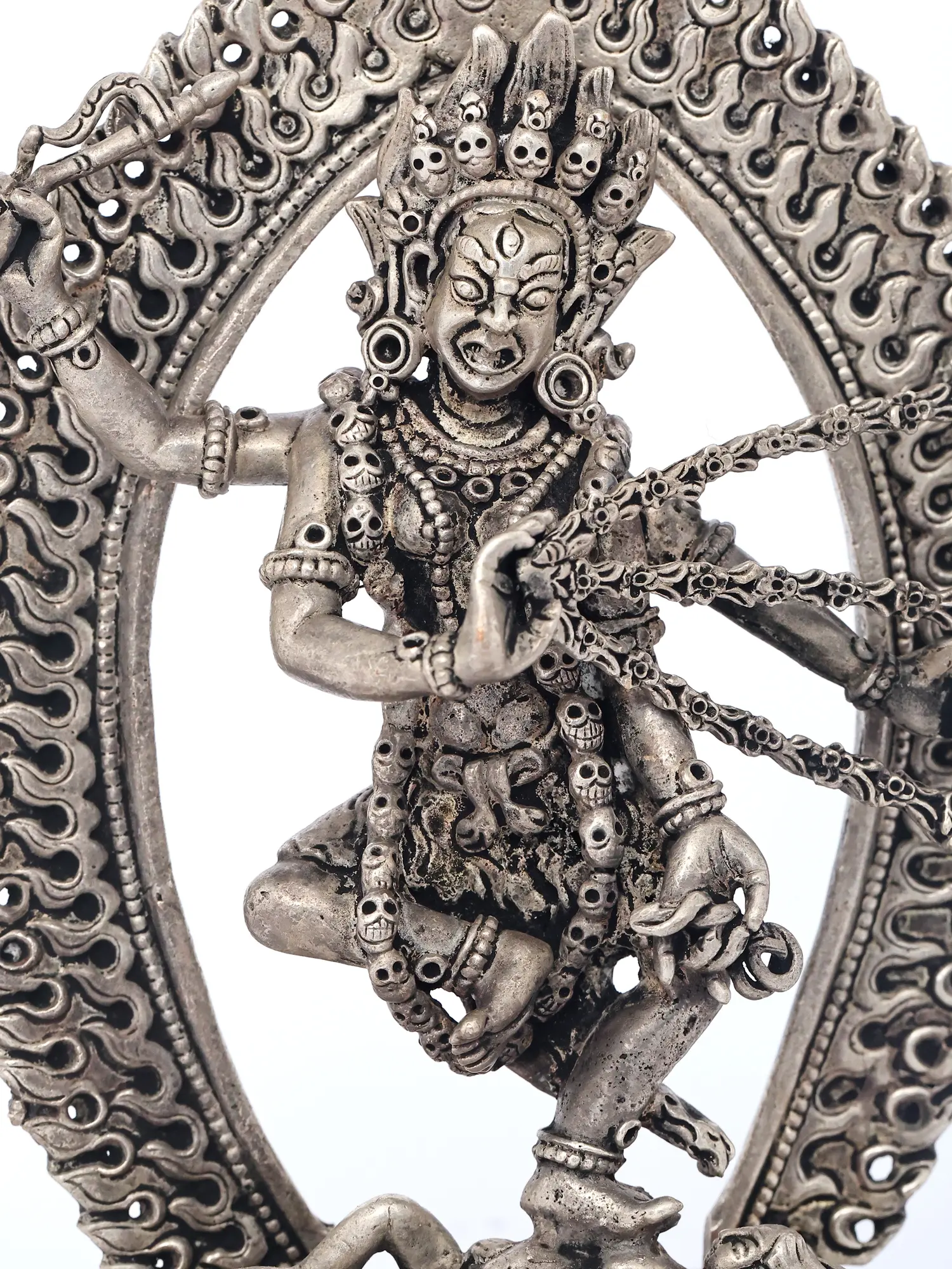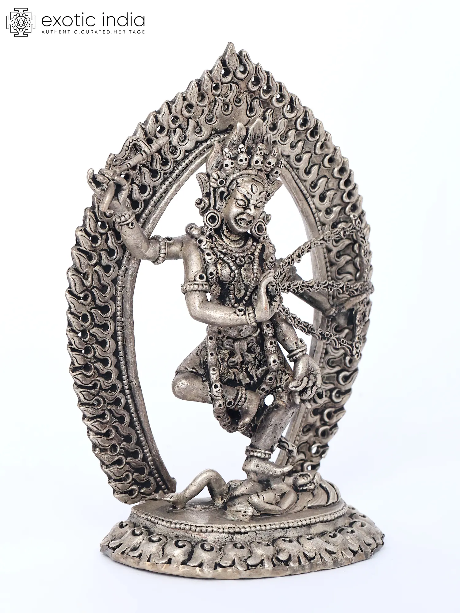 The dynamic posture and commanding presence are central to its appeal, conveying a sense of movement and spiritual dynamism. The surrounding halo of flames signifies purification and the transcendence of worldly illusions. You will notice the symbolic adornments, each carrying deep meaning within the tantric tradition, underscoring the profound narrative woven into this visual masterpiece. Its carefully balanced composition, approximately 5.5 inches tall, ensures it commands attention without overwhelming its surroundings.