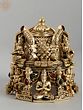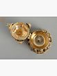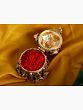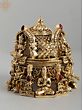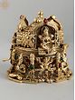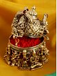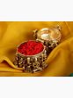 The presence of Lakshmi, Ganesha, and Saraswati in one place is a significant occurrence that confirms the inflow of wisdom, wealth, and prosperity. Goddess Saraswati is the patron of knowledge, thus guiding people towards intellectual progress. Goddess Lakshmi is the patron of wealth, thus blessing people with money, and Lord Ganesha is the remover of obstacles; hence, he promotes unhinged growth. This sindoor box with all three sacred images on the lid and a picture of a meditating yogi on the body enables the devotees to enrich their lives with the blessed dot of vermillion or sindoor on their forehead. The box is made of brass and exquisitely decorated with carvings and ornamented with semi-precious stones, making it a regal object. This box not only stores the sindoor but also improves it with the sacredness of the deities.