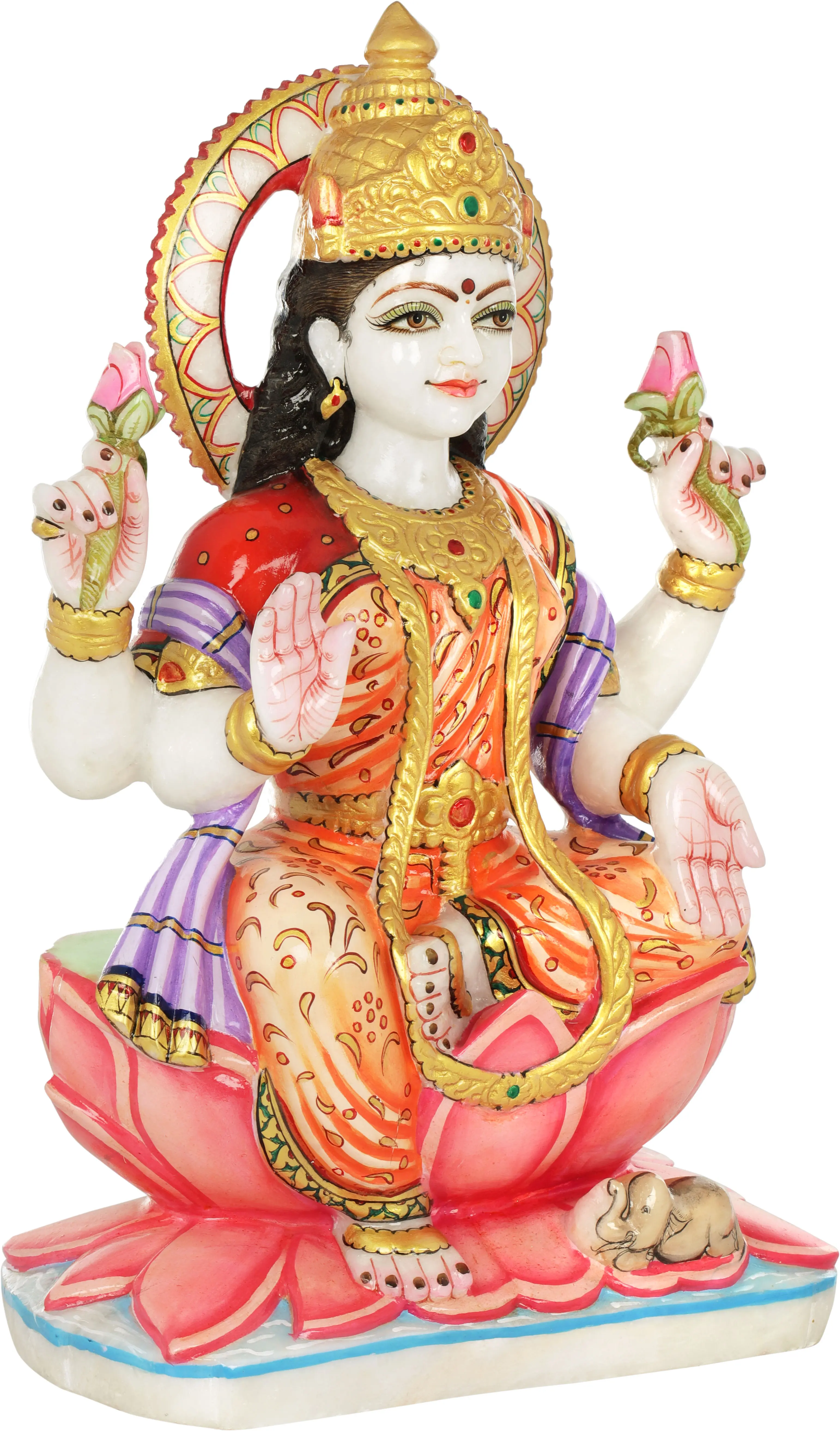 This statue is meticulously carved from high-quality white marble, ensuring both its durability and its inherent beauty. The smooth, cool touch of the marble, combined with the vibrant, hand-painted details, creates a piece that is both visually stunning and spiritually resonant. The traditional colors used in the painting – rich oranges, vibrant reds, and royal purples, accented with shimmering gold – are carefully applied to highlight the divine attire and ornamentation of the goddess, making each element stand out with luminous clarity. The delicate brushstrokes on her eyes, lips, and the subtle blush on her cheeks lend a lifelike quality, inviting a sense of connection and devotion. Whether placed in a home altar, a place of worship, or as a statement piece in your living space, this statue of Lakshmi Ji promises to be a source of inspiration, peace, and a beacon of prosperity for years to come.