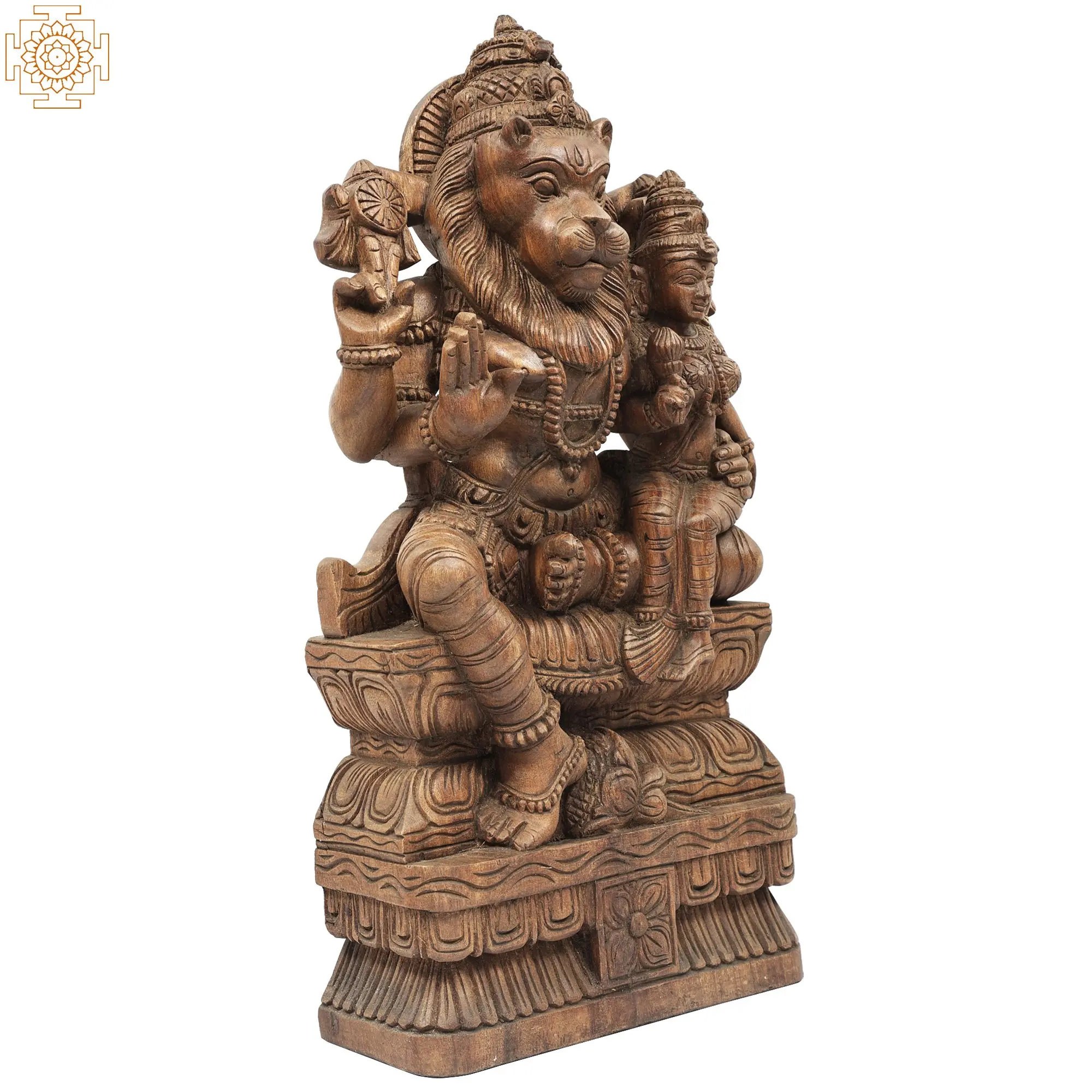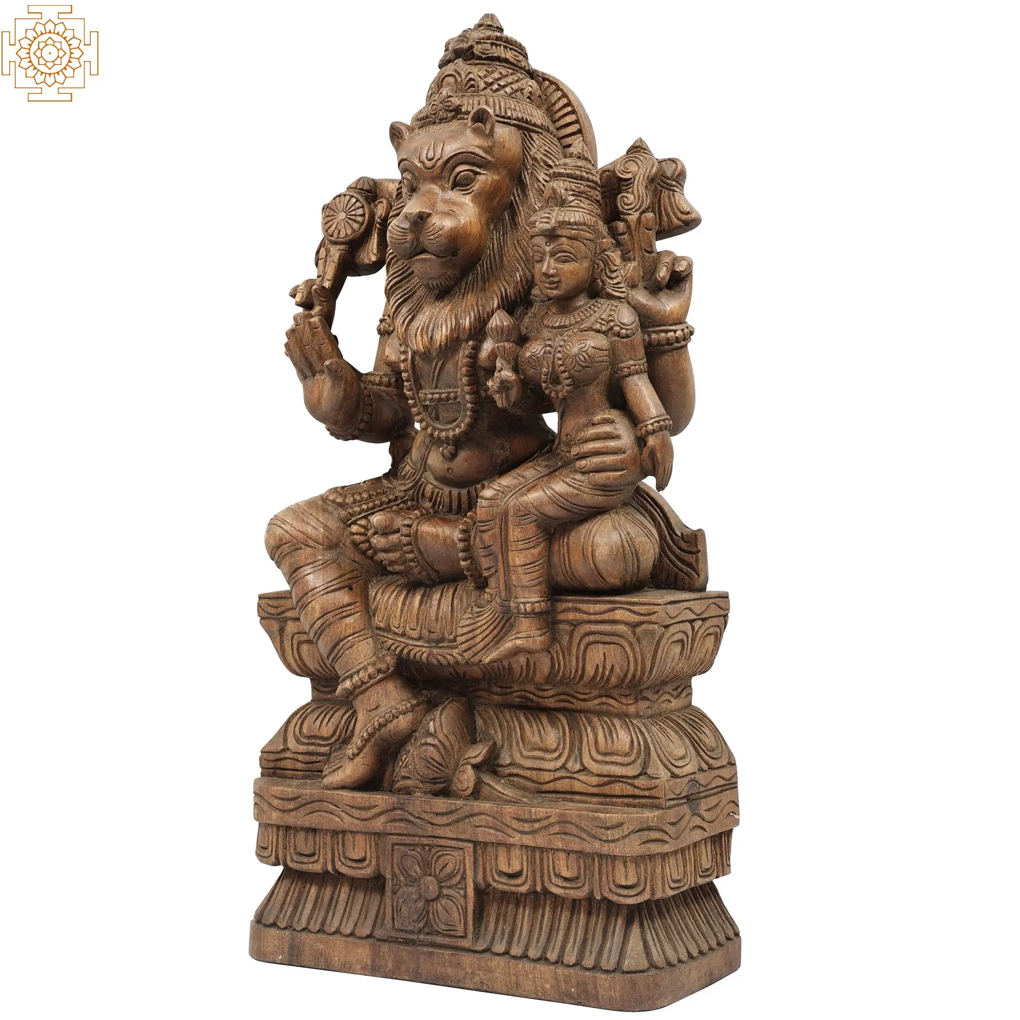 In the wooden sculpture that you see on this page, the togetherness of Lakshmi-Narasimha has been captured in perfect harmony. The fiercest and the most merciless of all the Vishnu-avataras, the half-nara (man) and half-simha (lion or beast) Lord Narasimha is uncontainable. No wonder the great daitya King Hiranyakashipu met his end in the hands of this relentless and unforgiving incarnation (‘avatara’).