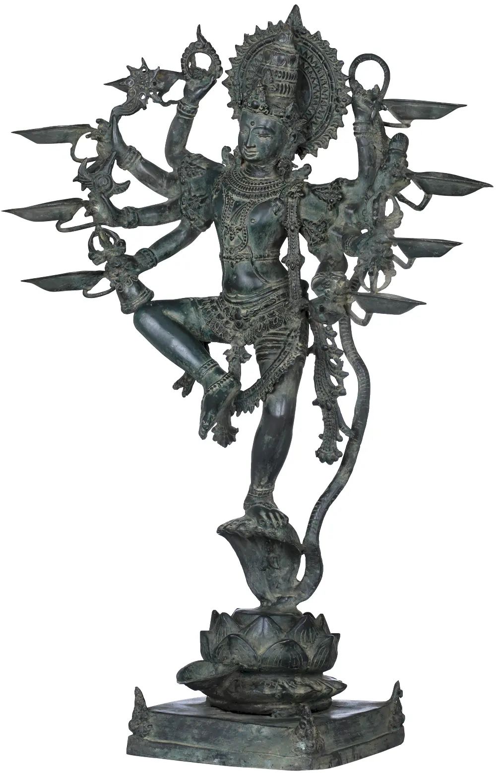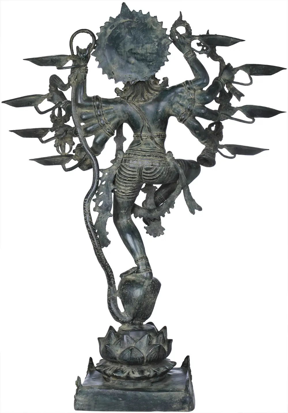 The charcoal-coloured complexion with inky blue undertones conveys the sattva of Lord Shiva’s being. Fashioned from superior-quality brass and coated with oxidised colour, this murti is an expressive work of art. An integral component is the dynamism pervading the subject - clearly, Mahadeva is in the midst of the all-annihilating tandava. From the angles at which His torso curves at multiple junctures to the undulations of the muscles of His limbs, the artisan has finished each aspect of the Nataraja with lifelike detail.