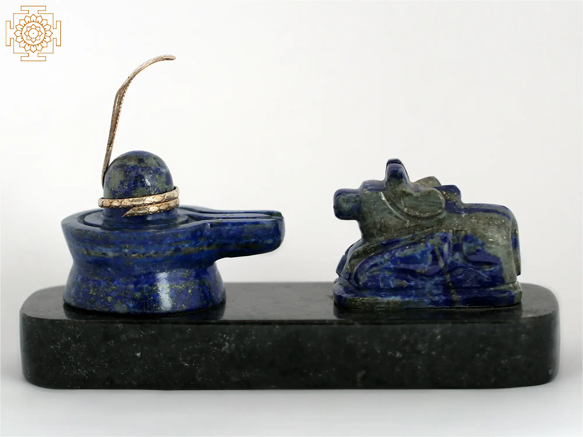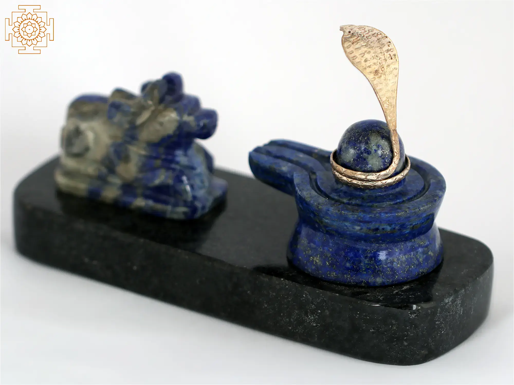 Lapis Lazuli Shivalinga and Nandi with Silver Sheshnaag is a divine ensemble of Shiva's sacred symbols. The Shivalinga, carved from lapis lazuli, embodies infinite cosmic energy, while Nandi, the loyal bull, symbolizes unwavering devotion. Silver Sheshnaag, the cosmic serpent, signifies the cycle of creation and destruction. Together, they create a powerful tableau of spirituality. This masterpiece is a decent reminder of the transformative power of Lord Shiva and the unwavering faith of Nandi, guiding you through the cycles of life.