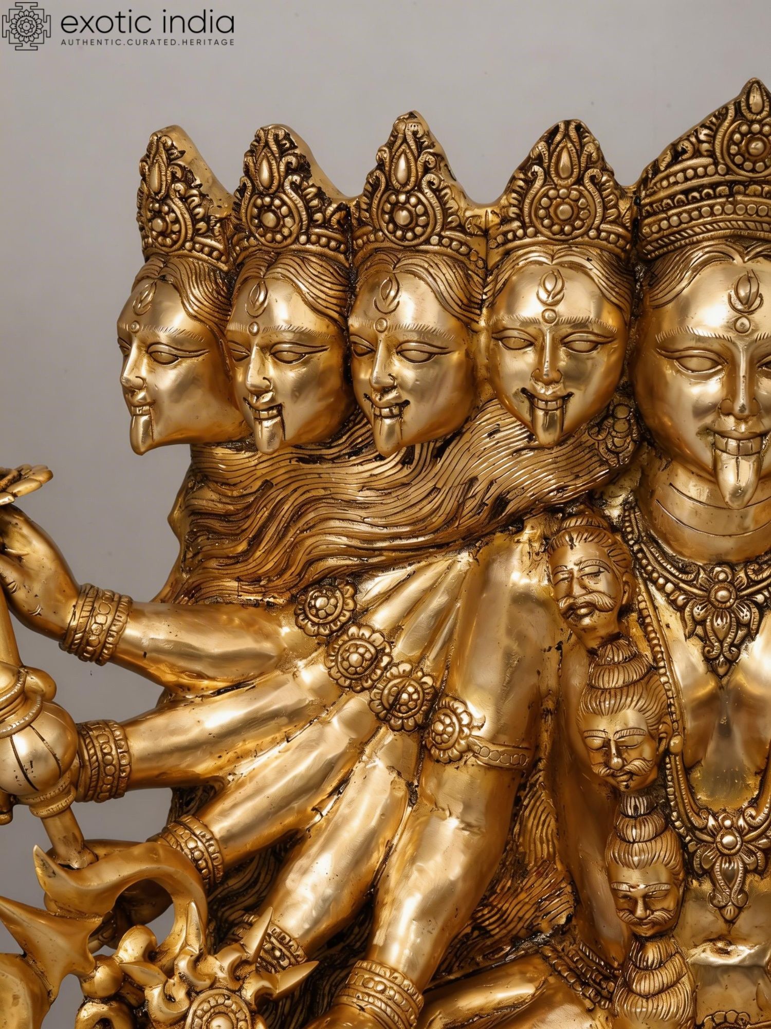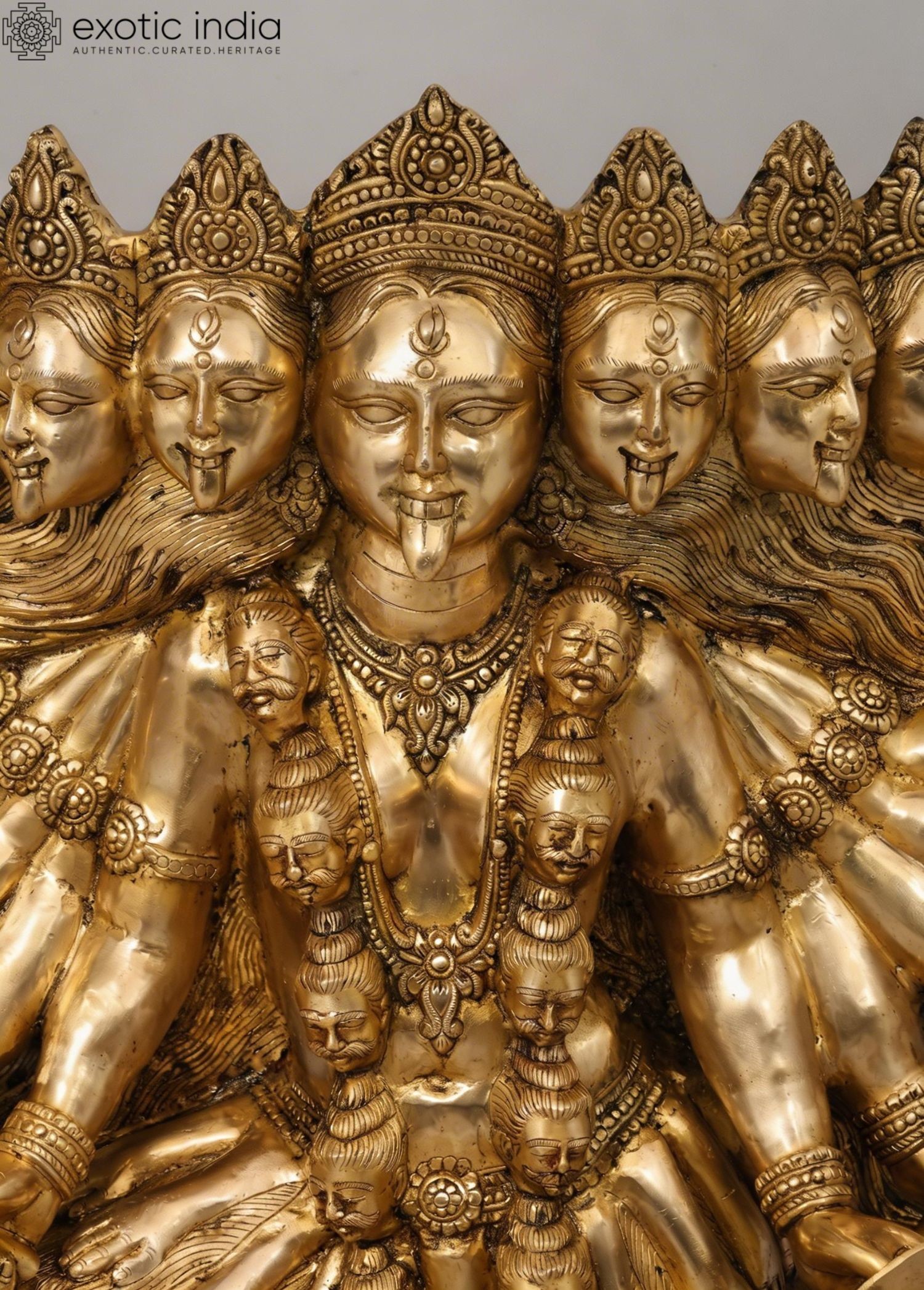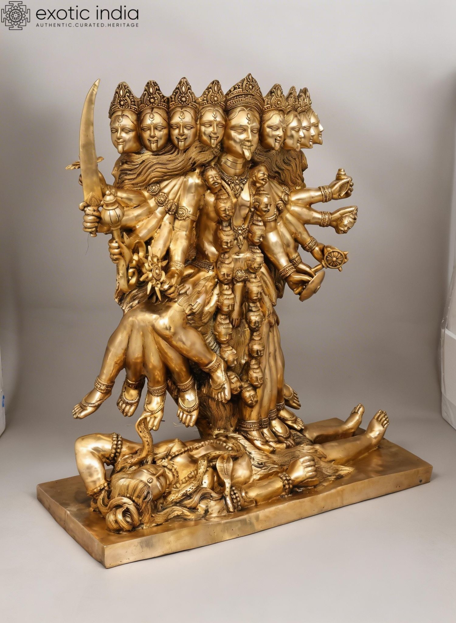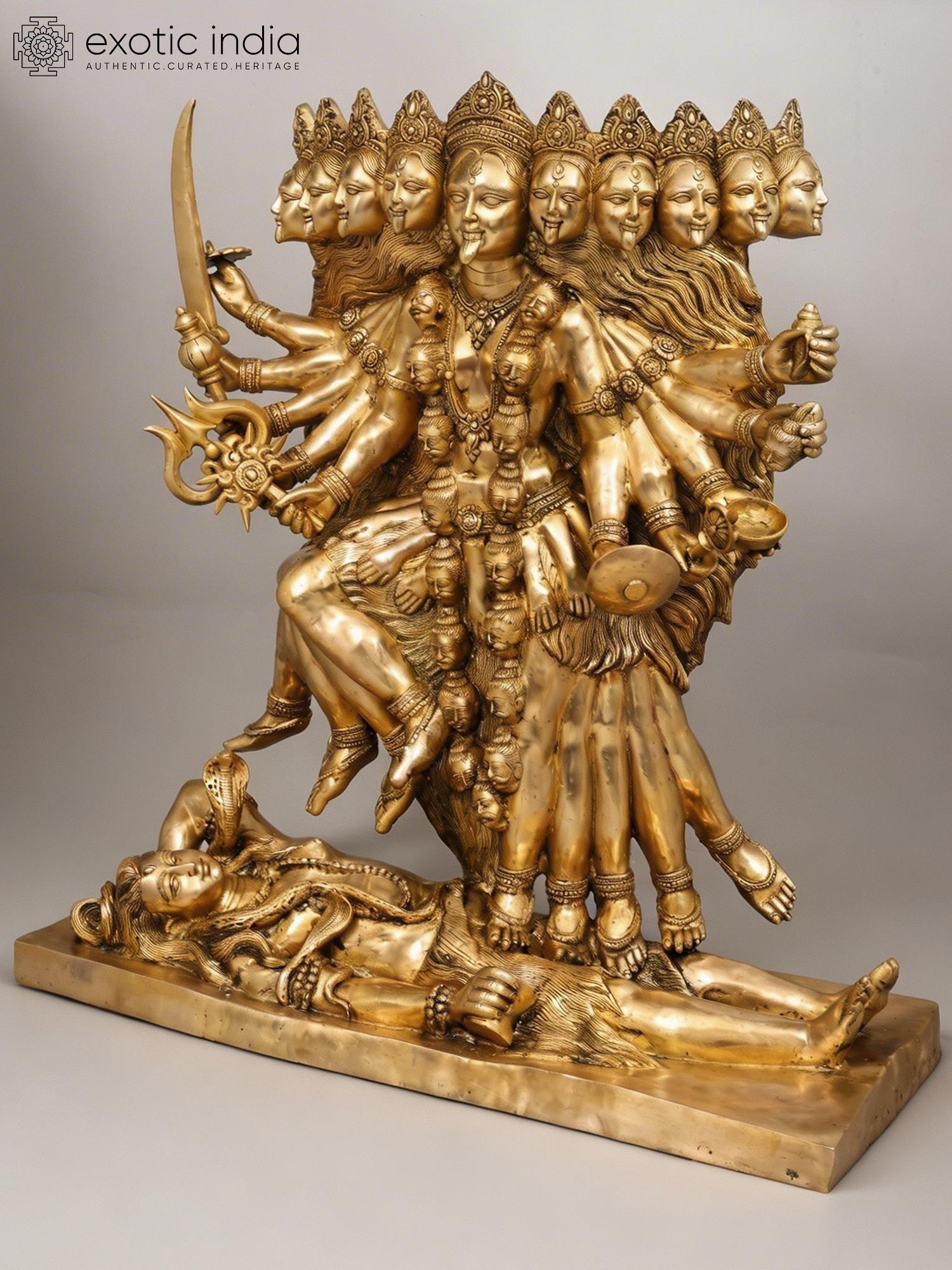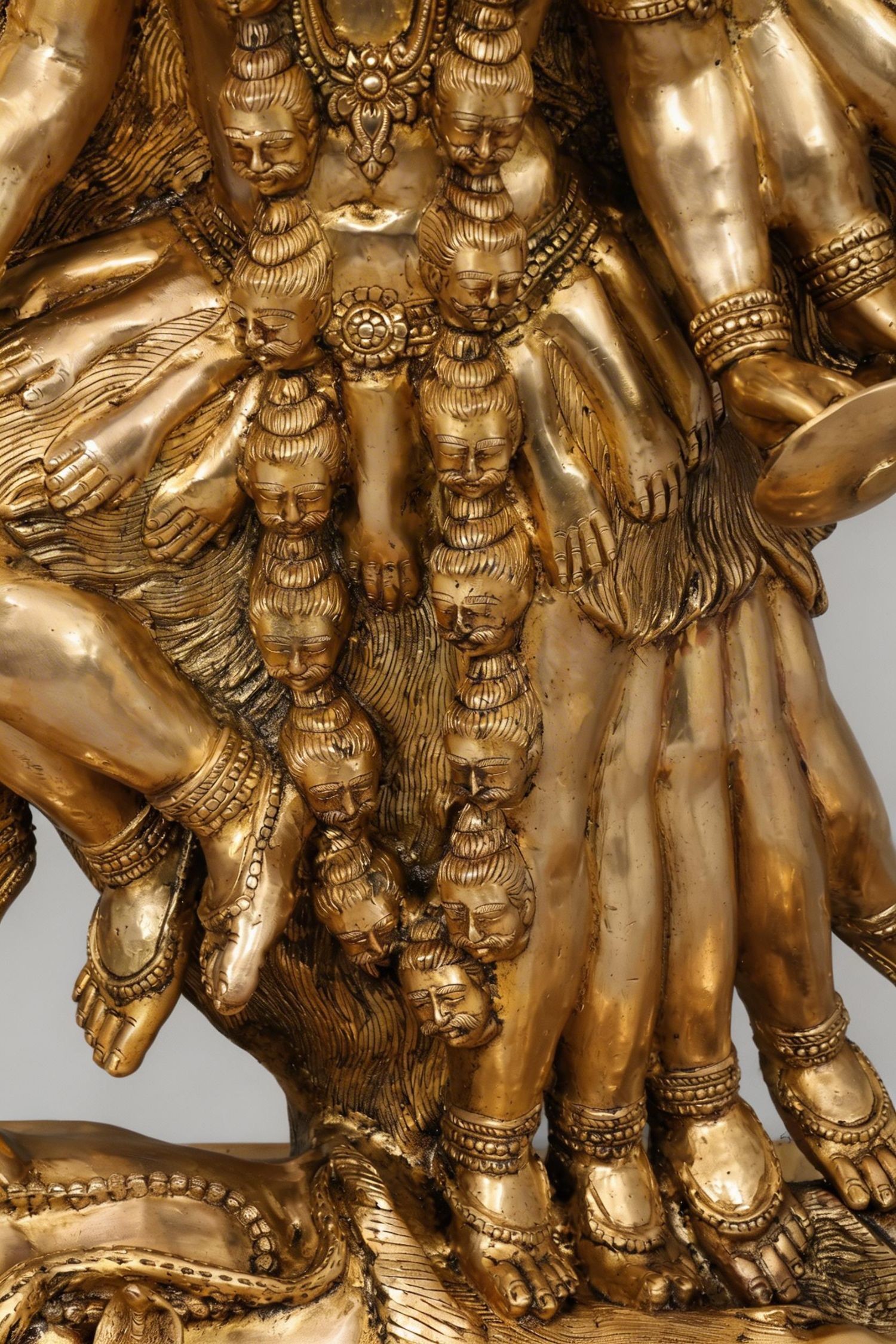 This imposing brass sculpture depicts Goddess Mahakali in her fierce, multi-headed, and multi-armed form.