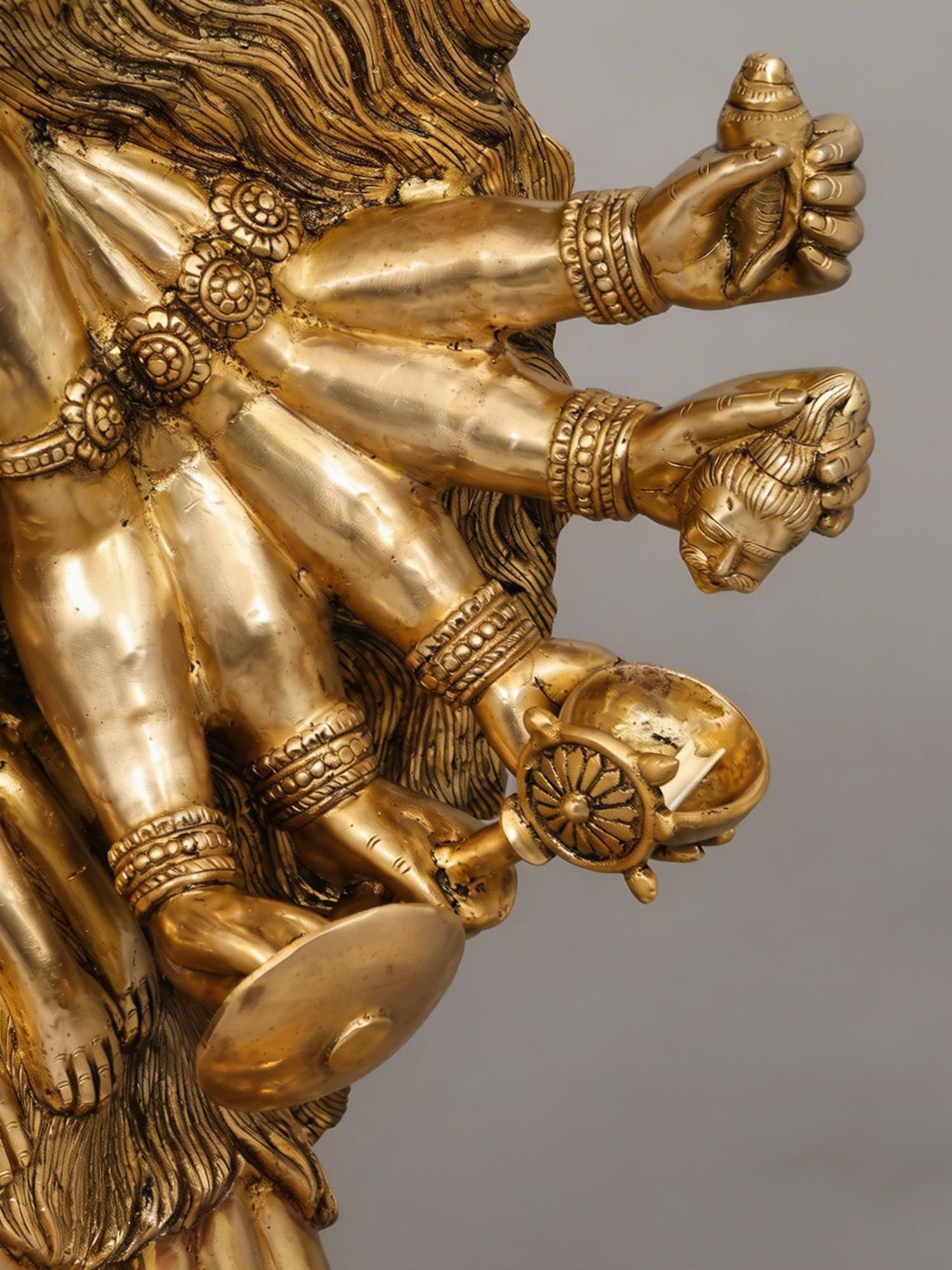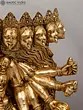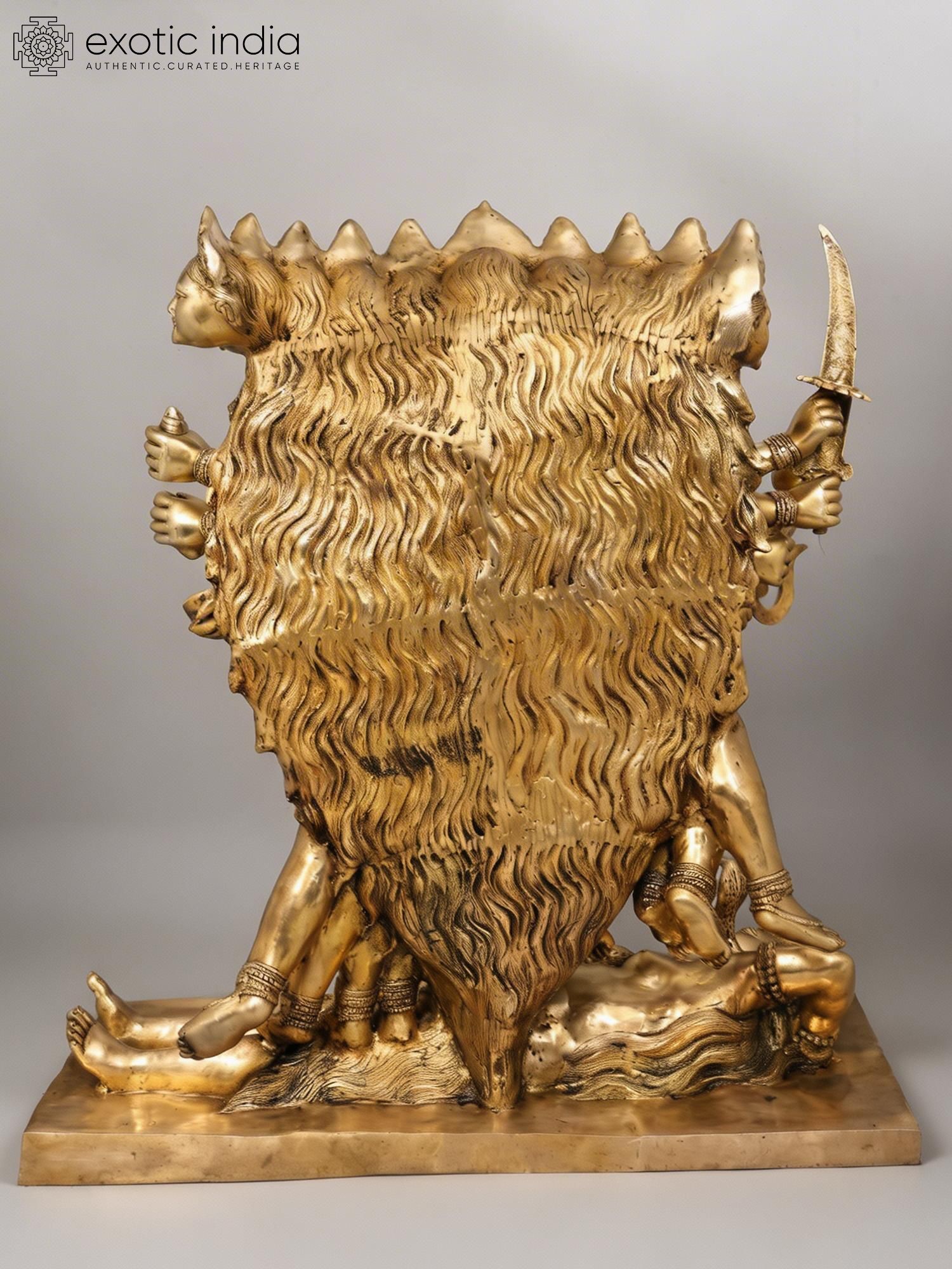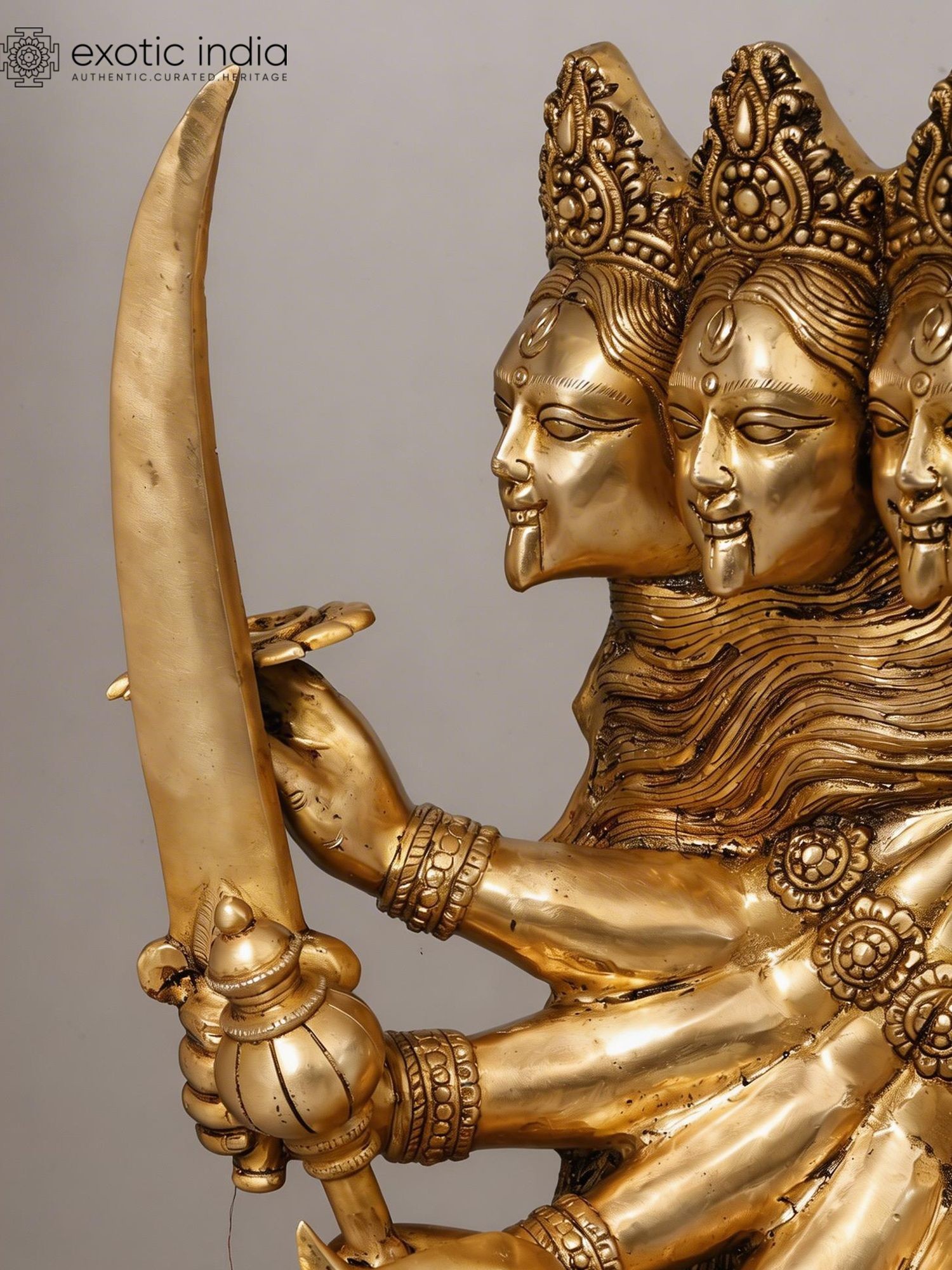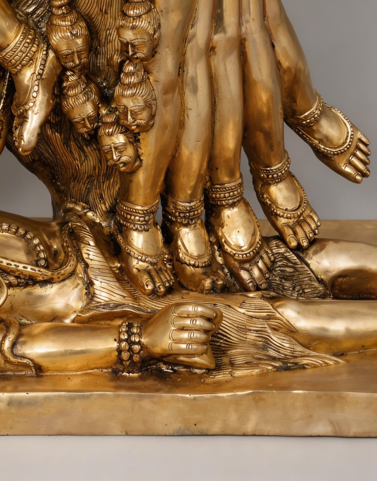This imposing brass sculpture depicts Goddess Mahakali in her fierce, multi-headed, and multi-armed form.