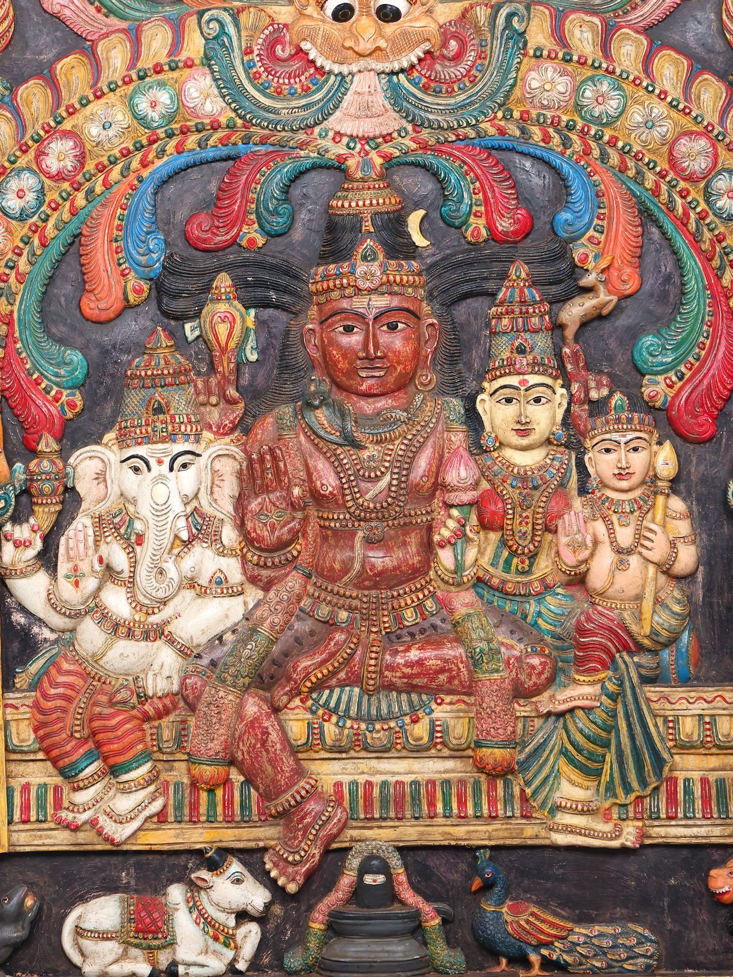 Features a detailed wood carving of Lord Shiva, Goddess Parvati, Lord Ganesha, and Lord Kartikeya seated together.