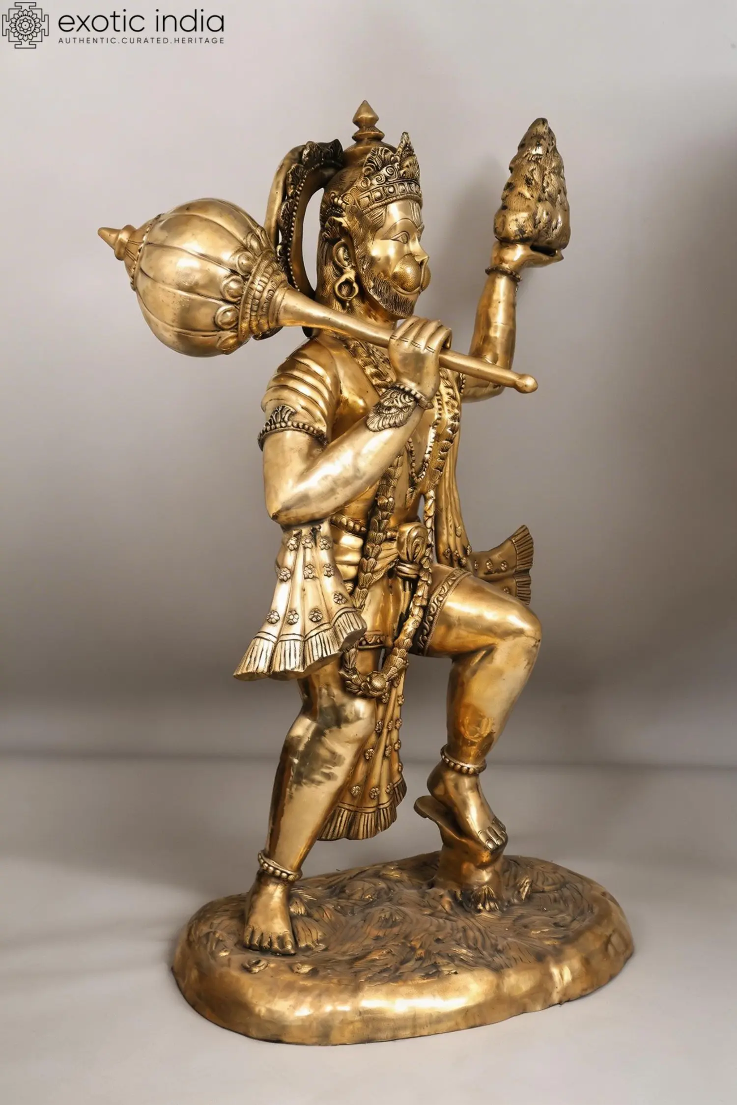 Standing at an impressive height, this piece commands a significant presence, drawing the eye with its dynamic posture and powerful symbolism. The divine figure is depicted mid-stride, one hand bearing the sacred Sanjivani mountain, while the other grasps a formidable mace, ready for any challenge. The exquisite detailing extends to the flowing garments, ornate necklaces, and the textured base, all rendered in lustrous brass that gleams with an inner light.
