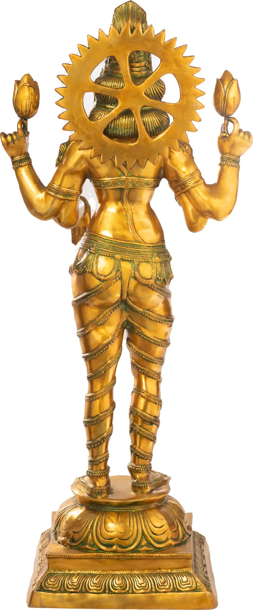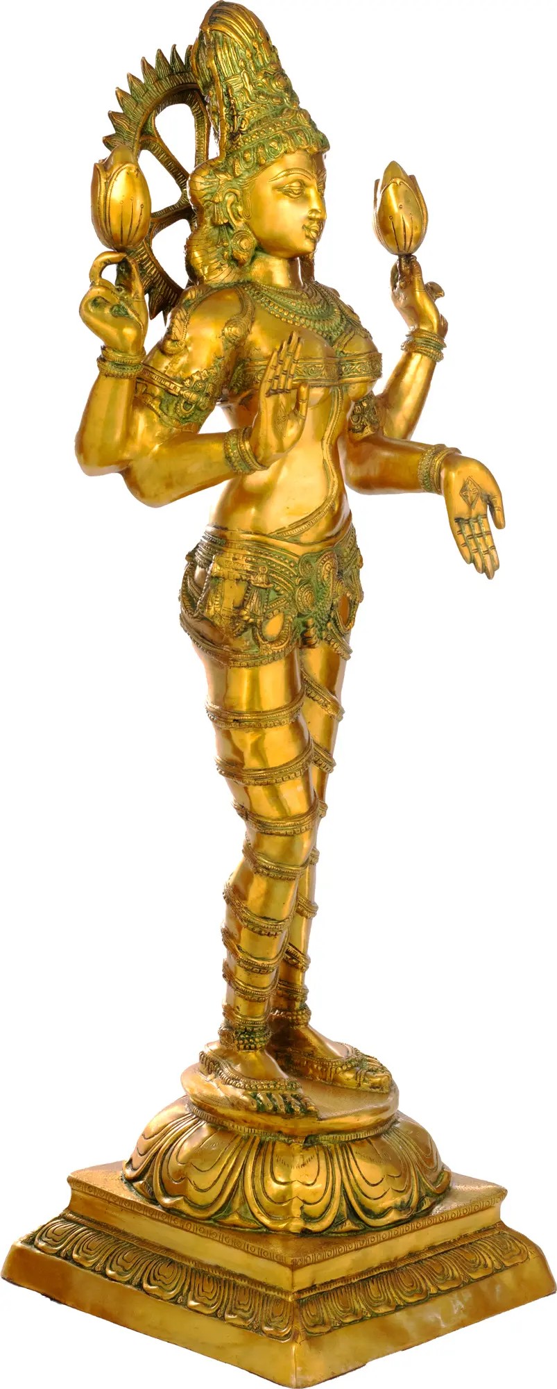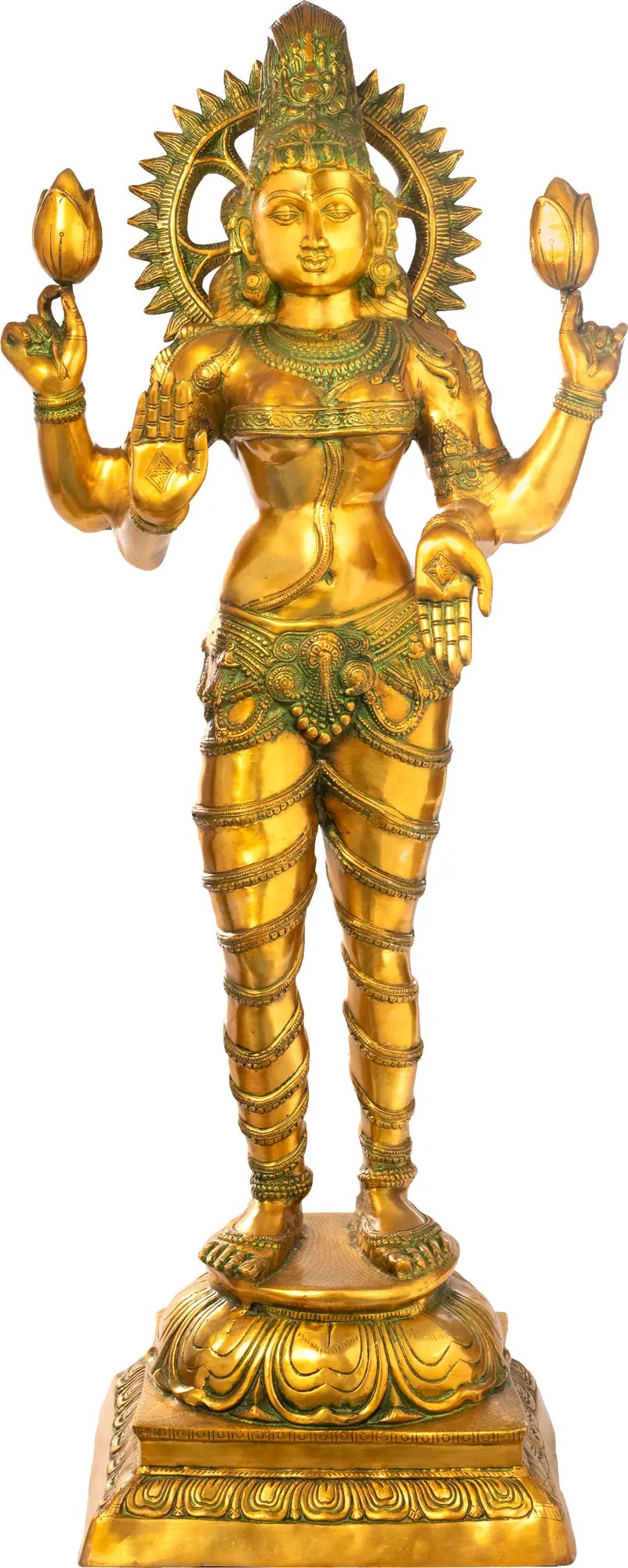 The most striking feature of the iconography of Lakshmi is her persistent association with the lotus. The meaning of the lotus, in relation to Goddess Lakshmi, refers to her purity and spiritual power. Rooted in the mud but blossoming above the water, completely uncontaminated by the mud, the lotus represents spiritual perfection and authority. Two divine characteristics of this supremely popular goddess.