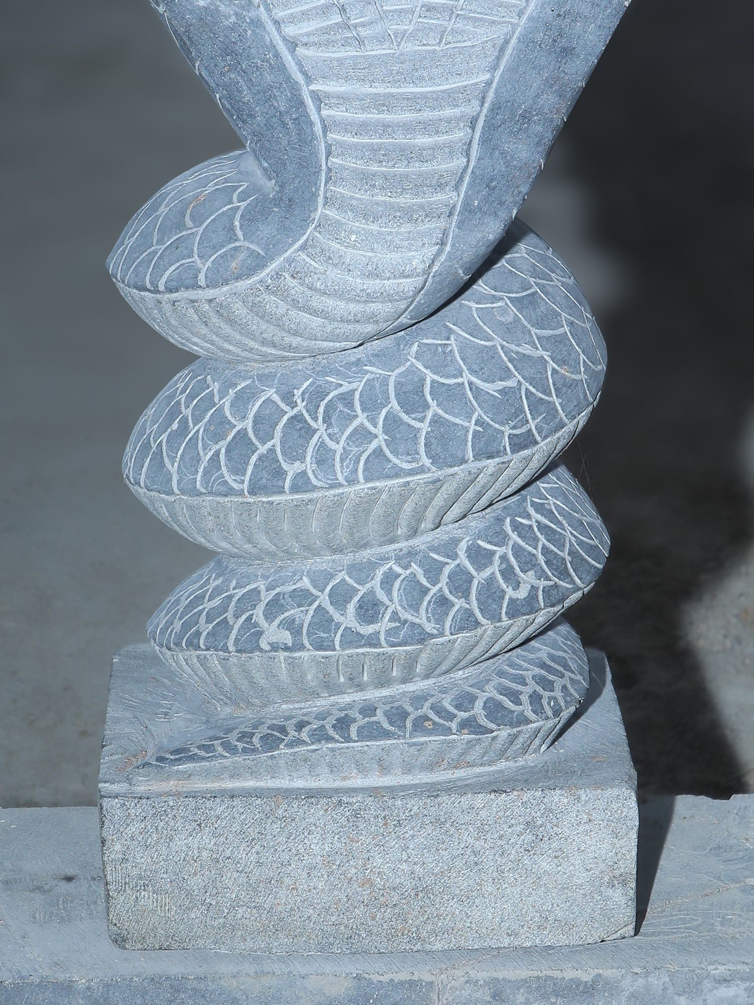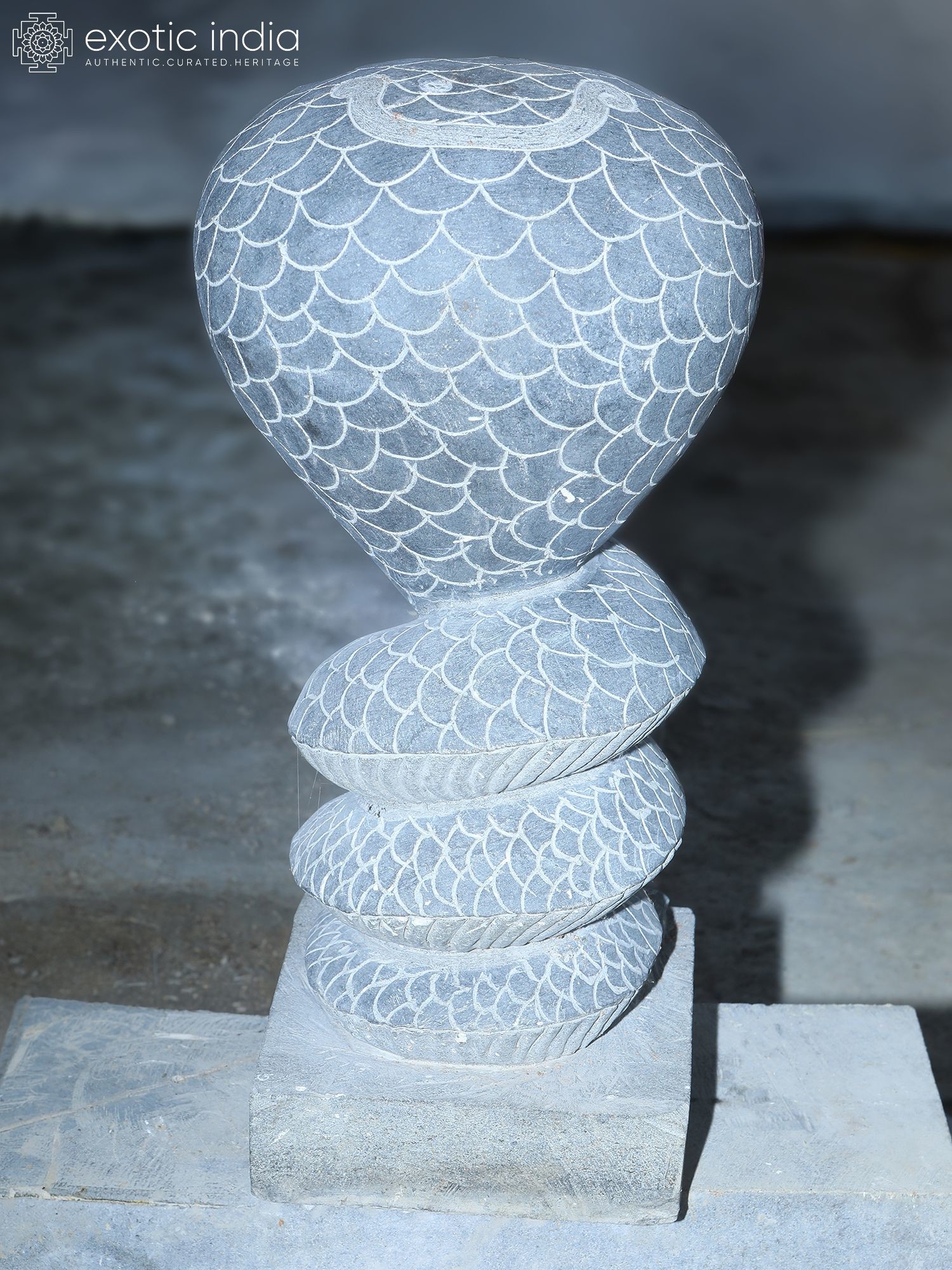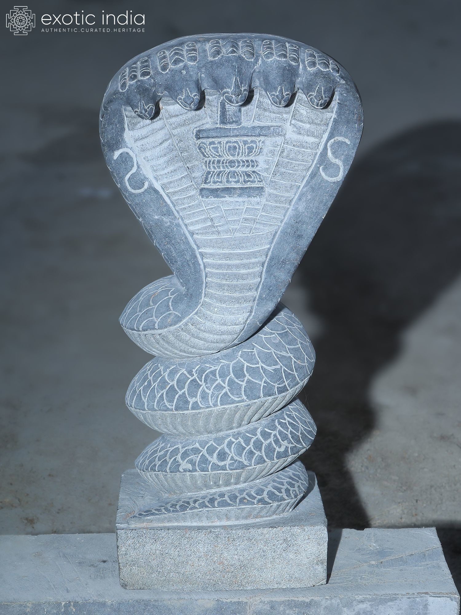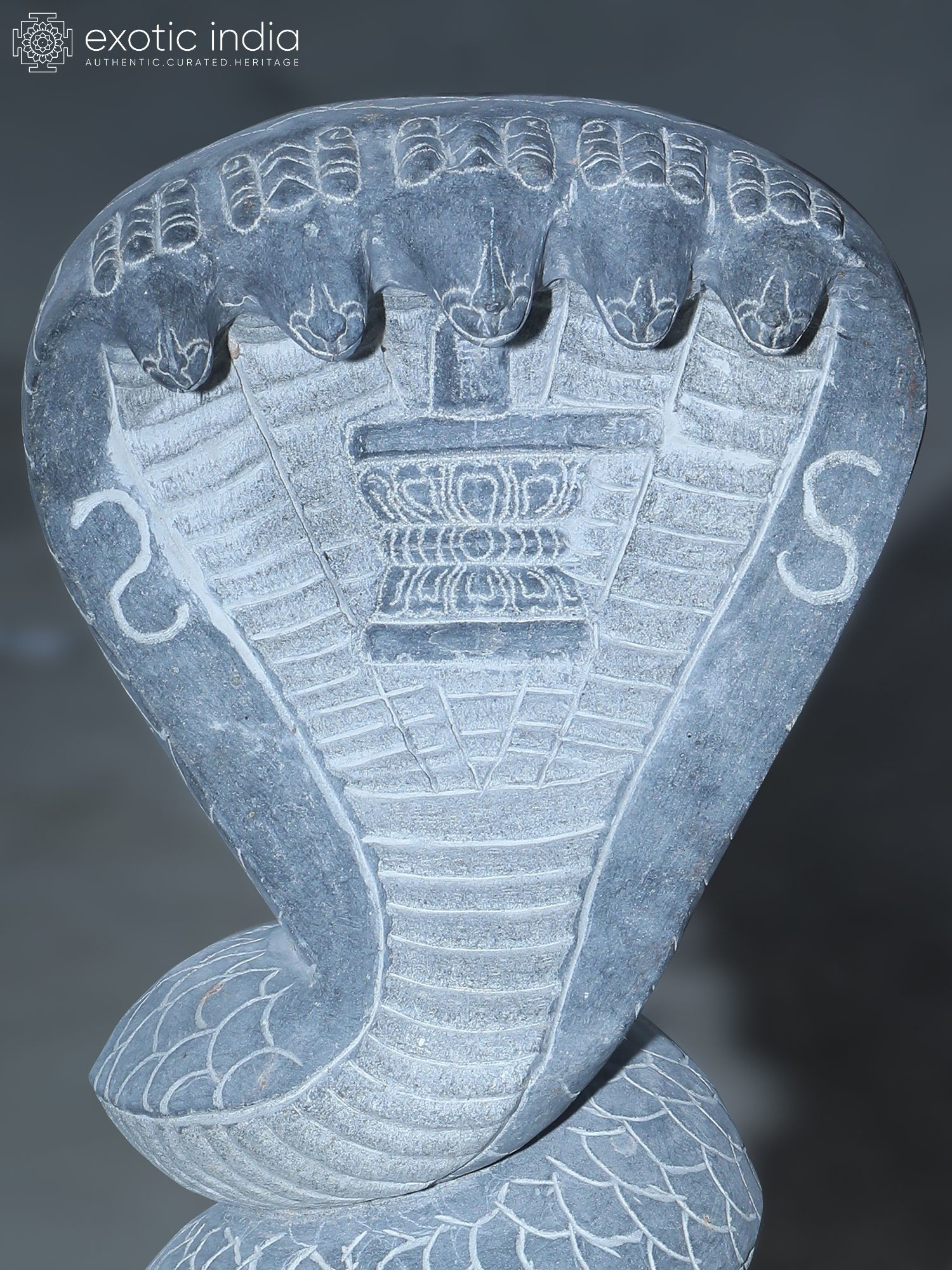 Intricately carved details showcase the scales, hood, and serene faces of the Sheshnag.