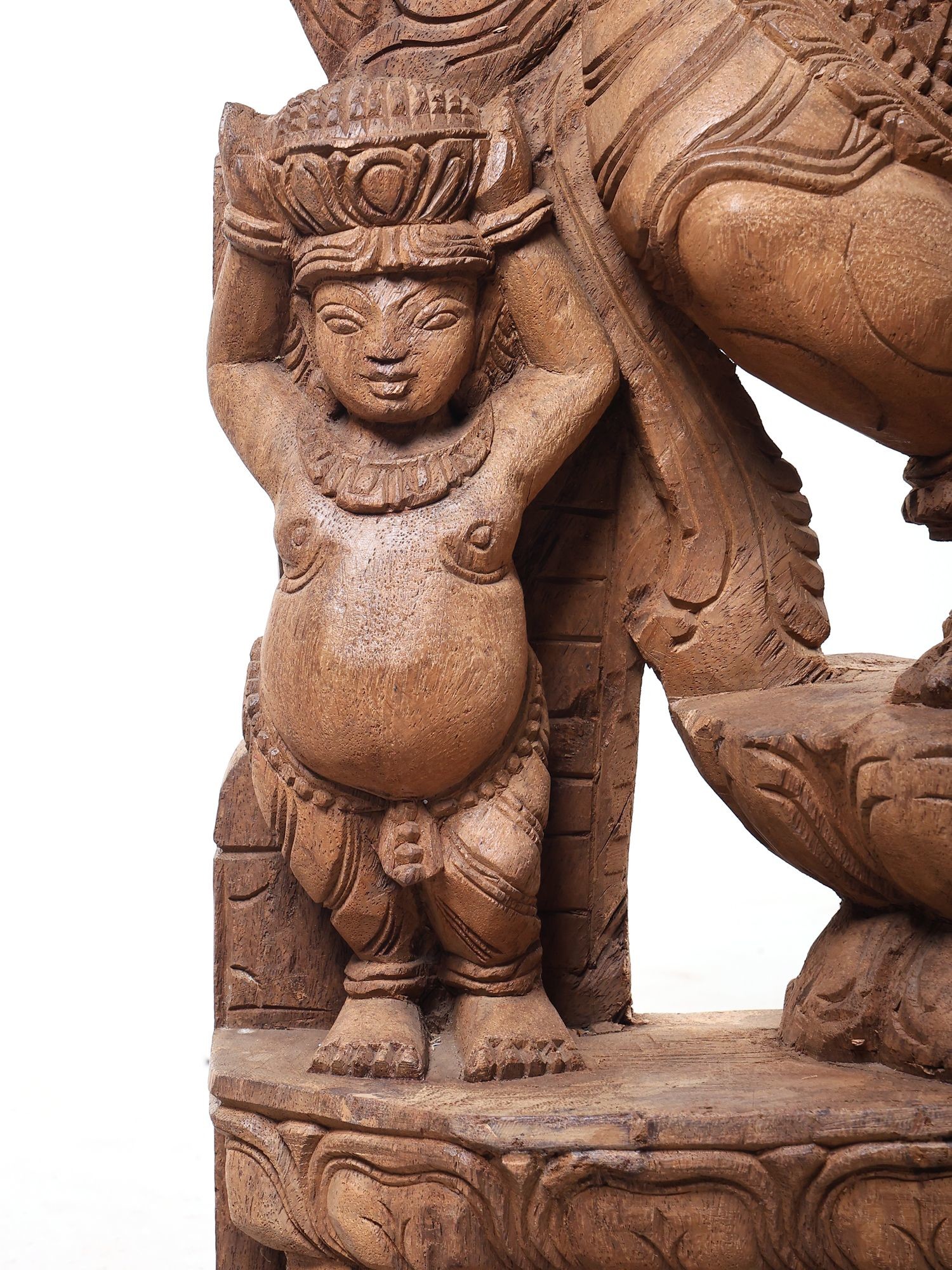 Intricately carved from wood, showcasing detailed craftsmanship and traditional iconography.