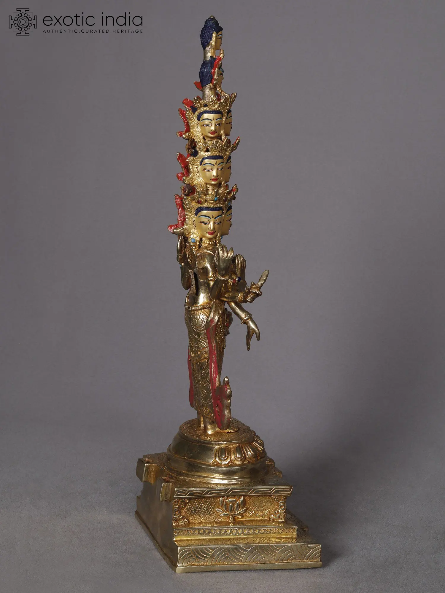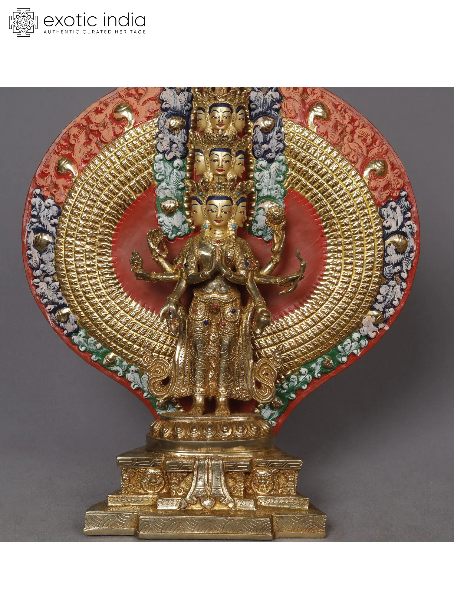 A brilliant representation of the compassion of Avalokiteshvara, this eleven-headed form of the Bodhisattva is one of the most popular and potent statues from Nepal. In the center of the composition is Avalokiteshvara with eight hands, standing with great poise with his eleven heads stacked on each other. Surrounding the icon are Avalokiteshvara’s thousand arms, signifying his cosmic presence around the devotee.  The Bodhisattva stands on a lotus platform which is placed on a royal stage with the Chepu motif on each side, symbolizing the might of Avalokiteshvara in the world of Himalayan Buddhism.