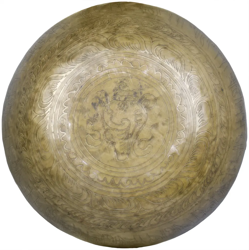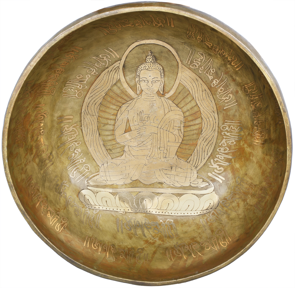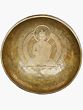 Tibetan singing bowl have been used for centuries for healing and meditation purposes. The pure sonic waves that ring from this bowl create a type of energy that promotes healing from stress disorders, depression, pain and produces a state of deep meditation, creative thinking and relaxation. This large bowl has inscribed sacred Buddha preaching on its outer surface and a clear Buddha figure can be seen sitting inside the bowl on the base in a dharmachakra Mudra on a lotus pedestal with a double aureole forming the backdrop, enhancing its divine purpose.