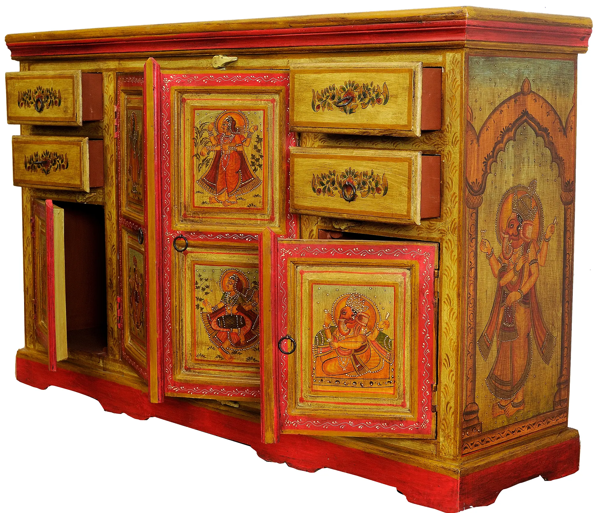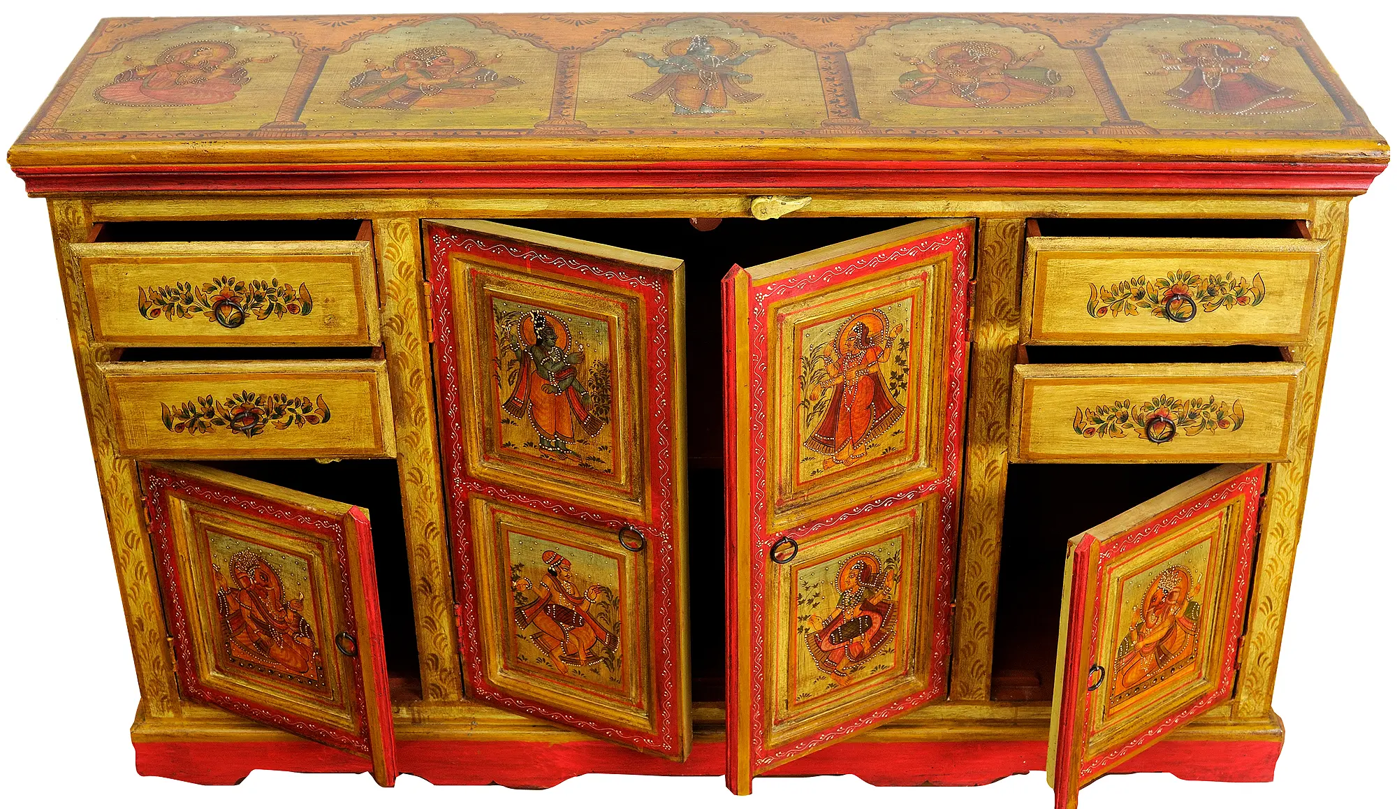 Handcrafted from solid wood, this substantial piece speaks of enduring quality and traditional craftsmanship. The artistry employed in the painting is a direct lineage from centuries-old Indian folk art traditions, where vibrant colors and intricate details are used to narrate stories and imbue objects with spiritual significance. The traditional style of painting, often found on temple walls, palanquins, and even everyday utensils, is brought to life here on a grand scale. This cupboard isn't just a repository for your belongings; it's a guardian of traditions, a conversation starter, and a daily reminder of the rich tapestry of Indian culture and spirituality. The ample storage offered by its drawers and cupboard space makes it a practical addition to any room, while its divine embellishments ensure it will be a cherished centerpiece for years to come.