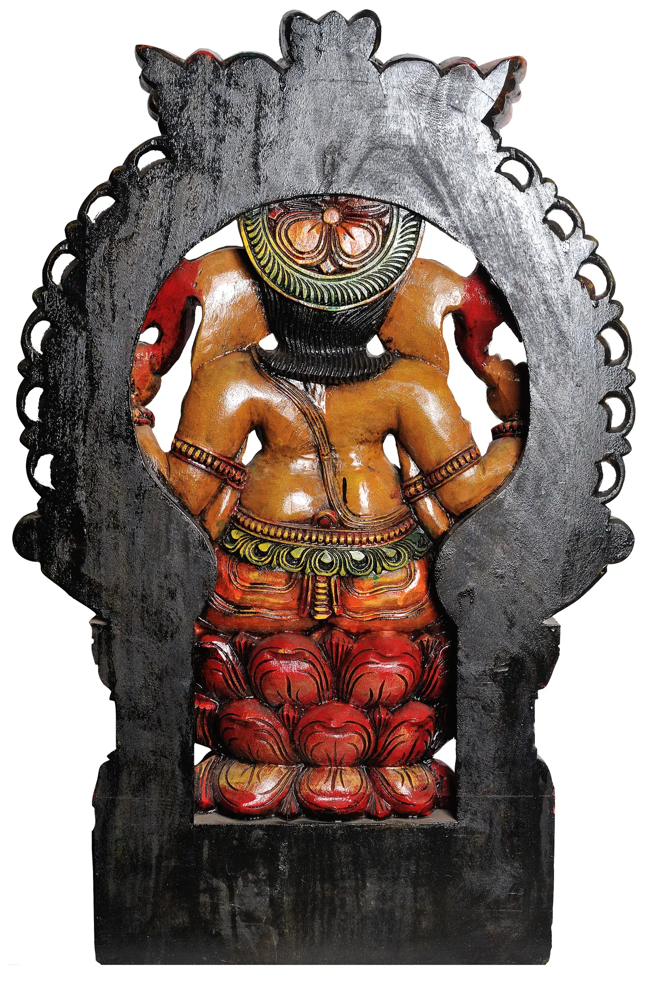 Hailing from the esteemed tradition of South Indian temple wood carvings, this artwork showcases the unique aesthetic and spiritual depth of the region. Such carvings have adorned temples and homes for centuries, serving as conduits for divine blessings and artistic expression. The meticulous attention to detail, the flowing lines, and the vibrant, time-honored color palettes are hallmarks of this exceptional style. Each curve and contour has been carefully sculpted, reflecting the artist's deep understanding of Ganesha's iconography and their dedication to their craft. The generous size of this carving ensures its prominence, making it an ideal focal point for a home altar, a meditation room, or as a distinguished piece of cultural art. Its presence is sure to inspire contemplation, peace, and a sense of divine connection.