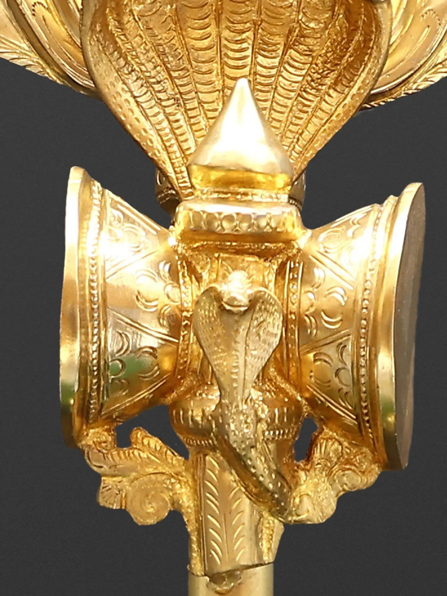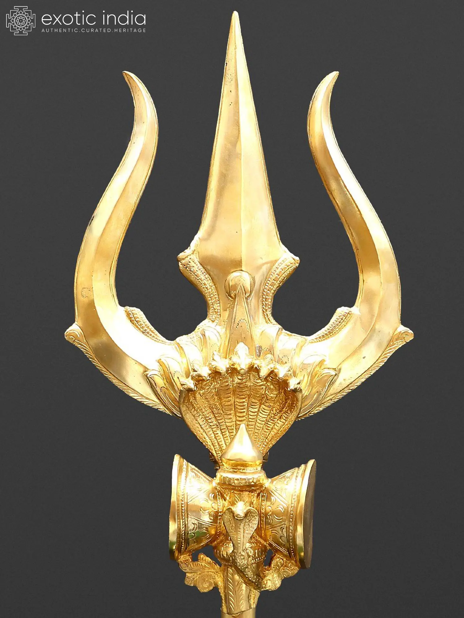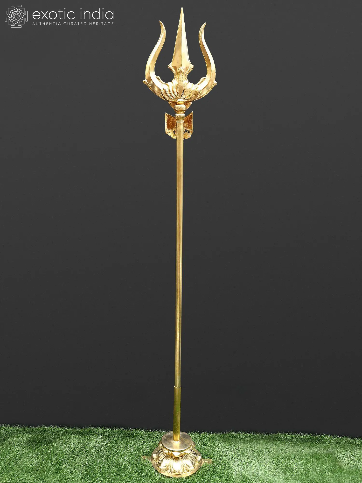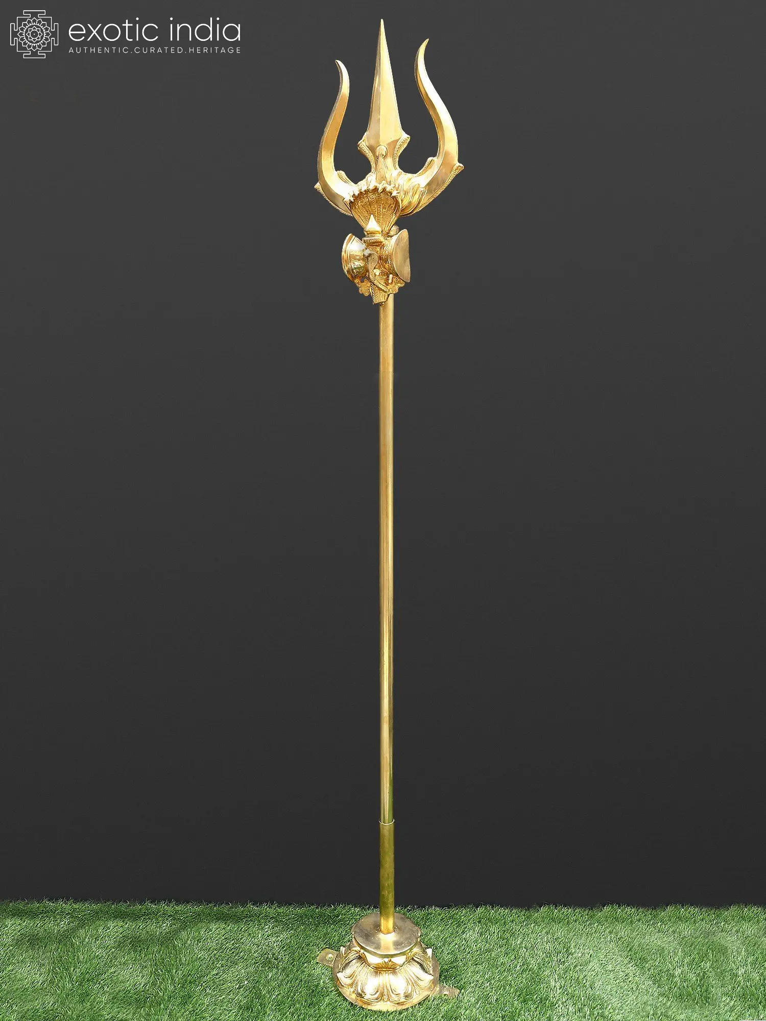 This particular rendition of the Trishul is fashioned from high-quality brass, a metal revered for its durability, aesthetic appeal, and auspicious associations in Indian culture. The inherent warmth and radiance of brass are amplified by the masterful craftsmanship evident in every curve and contour of this piece. The central shaft is elegantly smooth, leading to the intricately designed head of the trident, which culminates in sharp, pointed prongs. Below the prongs, a beautifully detailed embellishment, reminiscent of sacred motifs, adds to the overall grandeur. The entire structure is supported by a sturdy and ornate brass stand, designed to showcase the trident’s imposing presence. The sheer size of this piece makes it a statement of devotion and an arresting focal point, suitable for adorning significant spaces within homes, temples, or spiritual centers.