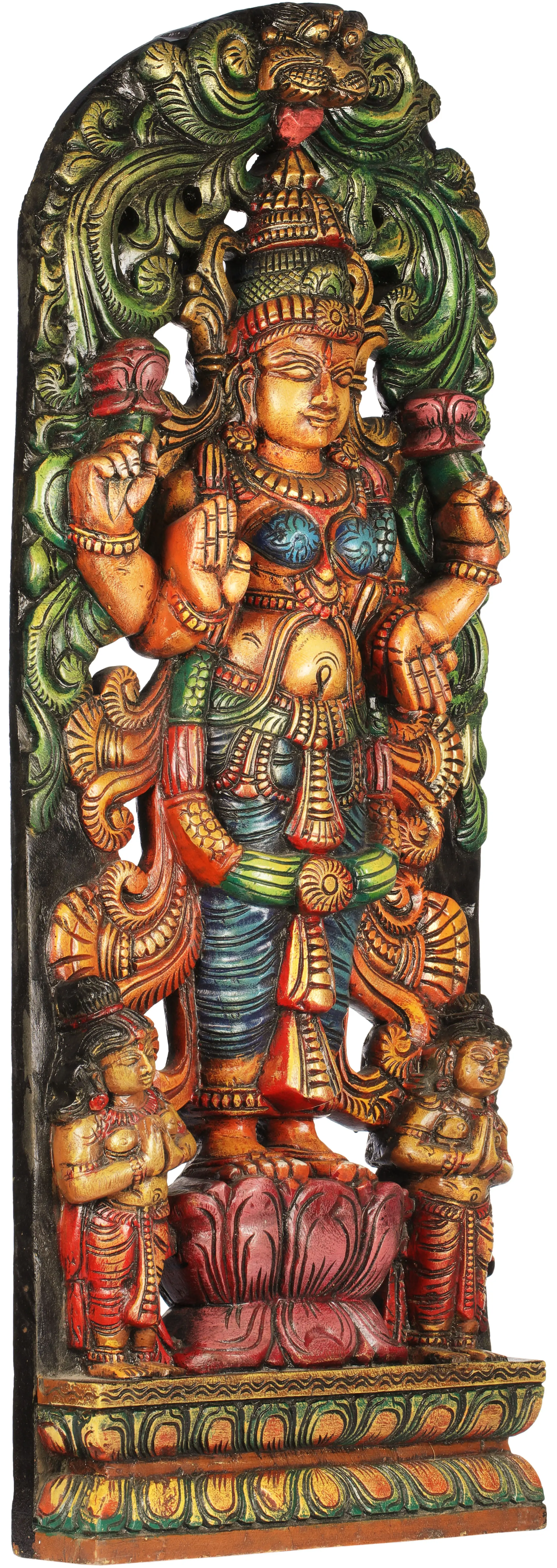 Invite the benevolent presence of Goddess Lakshmi, the divine embodiment of wealth, prosperity, and auspiciousness, into your home with this magnificent South Indian temple wood carving. This piece is more than just a decoration; it is a testament to centuries of artistic tradition and deep spiritual devotion. Handcrafted by skilled artisans, the intricate details and vibrant colors of this carving bring to life the serene and powerful form of the Goddess. Lakshmi, also known as Shri, is a central deity in Hinduism, revered as the consort of Lord Vishnu. Her blessings are sought for abundance in all aspects of life, from material wealth to spiritual richness. Legends tell of her birth from the churning of the cosmic ocean (Samudra Manthan), emerging as the most beautiful of all beings, holding lotus flowers and coins, symbolizing purity and the flow of wealth. She is often depicted seated or standing on a lotus, a symbol of her detachment from the material world and her spiritual purity. In this striking rendition, she stands tall, exuding an aura of grace and power, ready to bestow her blessings. The carving depicts Lakshmi with multiple arms, each often signifying different aspects of her divine attributes. Her serene countenance and the traditional adornments speak of her divine nature and her role as the bestower of fortune. Flanking her are smaller figures, possibly devotees or attendants, in postures of prayer and reverence, further emphasizing the devotional aspect of this artwork. The meticulous carving of the flowing garments, the delicate jewelry, and the symbolic lotus base showcases the mastery of the South Indian temple art tradition.