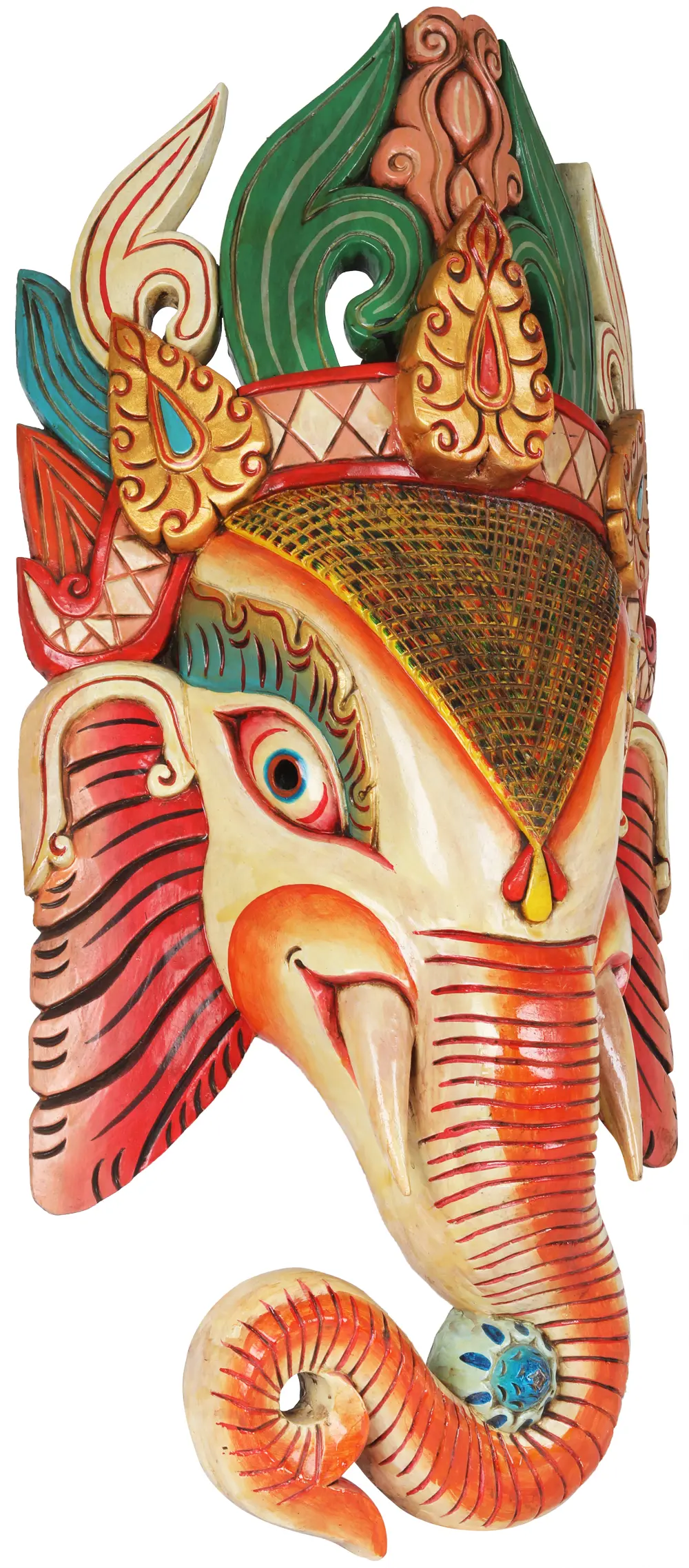 This magnificent wooden mask captures the essence of Lord Ganesha, the beloved elephant-headed deity revered in Hinduism. Meticulously carved by skilled artisans in Nepal, this piece is not merely a decorative item but a powerful representation of wisdom, intellect, and the removal of all obstacles. The mask’s commanding presence and vibrant, hand-painted details evoke a sense of spiritual aura, making it an ideal centerpiece for any sacred space, meditation room, or as a striking statement piece in your home. The intricate craftsmanship showcases the rich artistic heritage of Nepal, where such traditional carving techniques have been passed down through generations. Each curve of Ganesha's trunk, the expressive eyes, and the elaborate headdress are rendered with deep respect and artistic precision, reflecting the sacred nature of the deity. The vibrant hues of orange, red, green, and gold are characteristic of Nepalese artistry, imbuing the mask with life and spiritual energy.