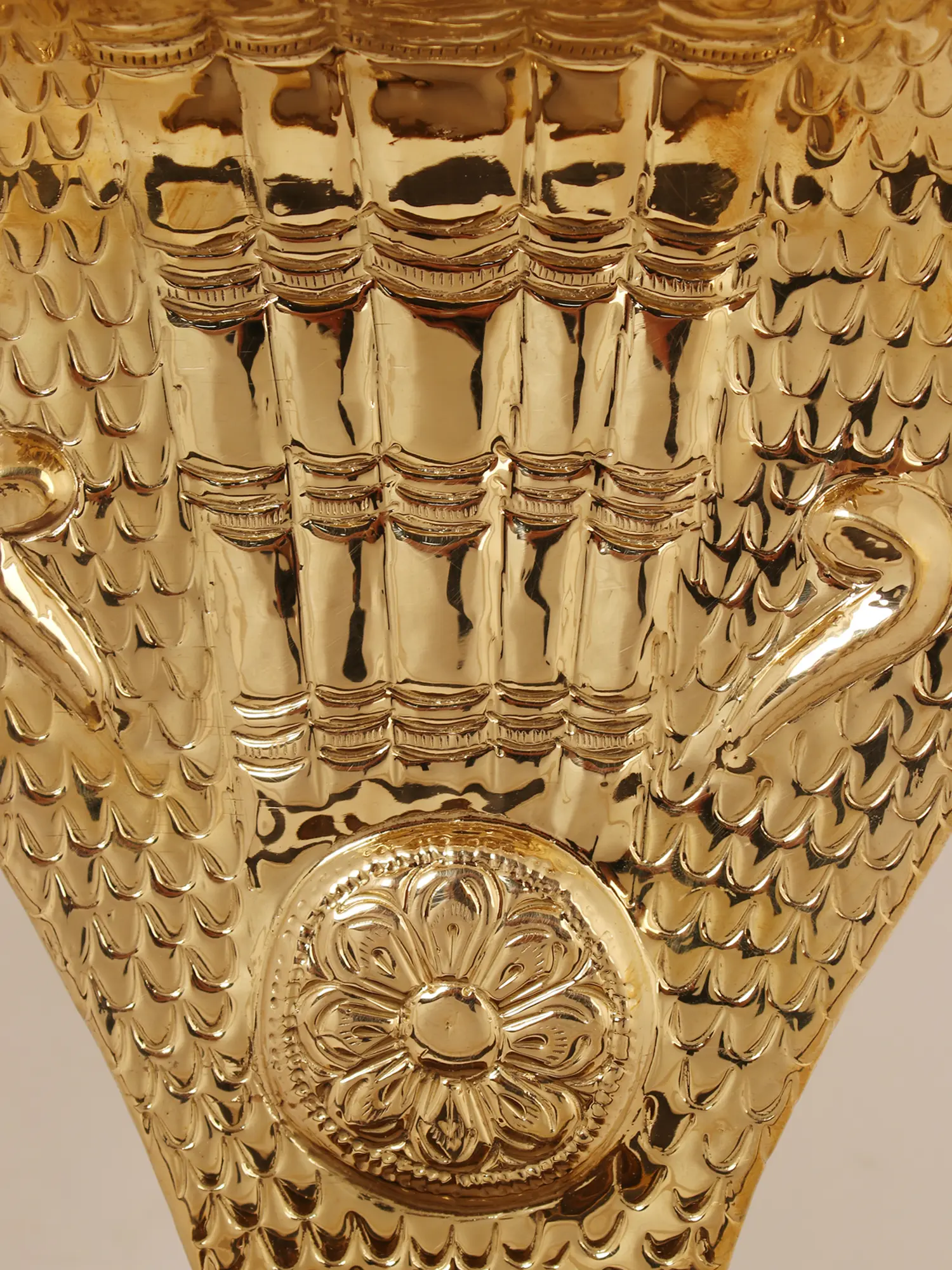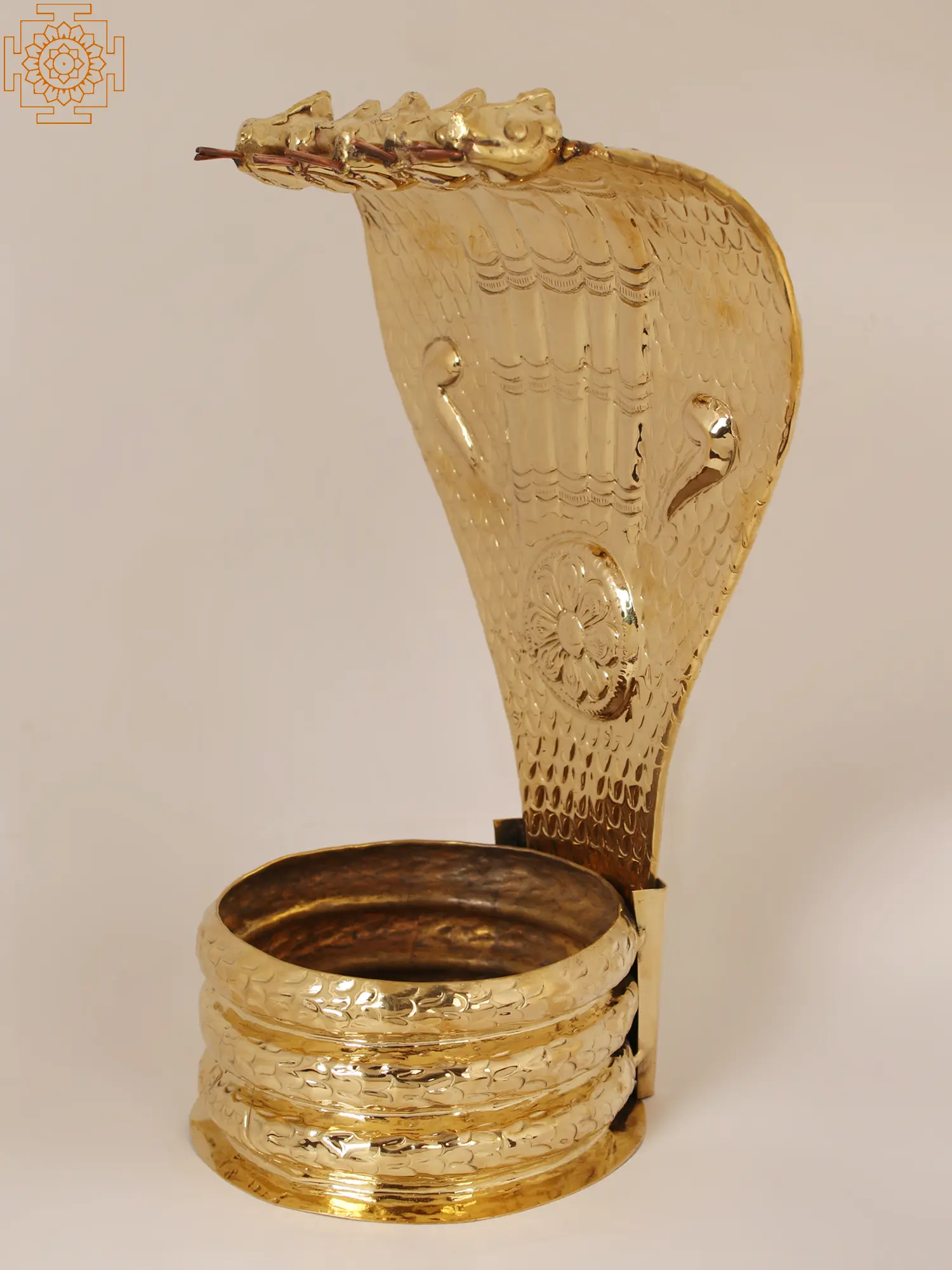 The perfect addition to the divine Shiva Lingam in your space of worship, this brass Linga sheath has been delineated in the form of Naga as a parasol for Mahadeva. The coils of the serpent provide a space for the Linga stone to be placed, while the entire piece has been exquisitely embellished, to give your Puja ghar a sacred and aesthetic touch.
