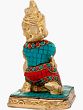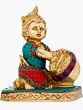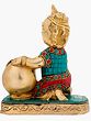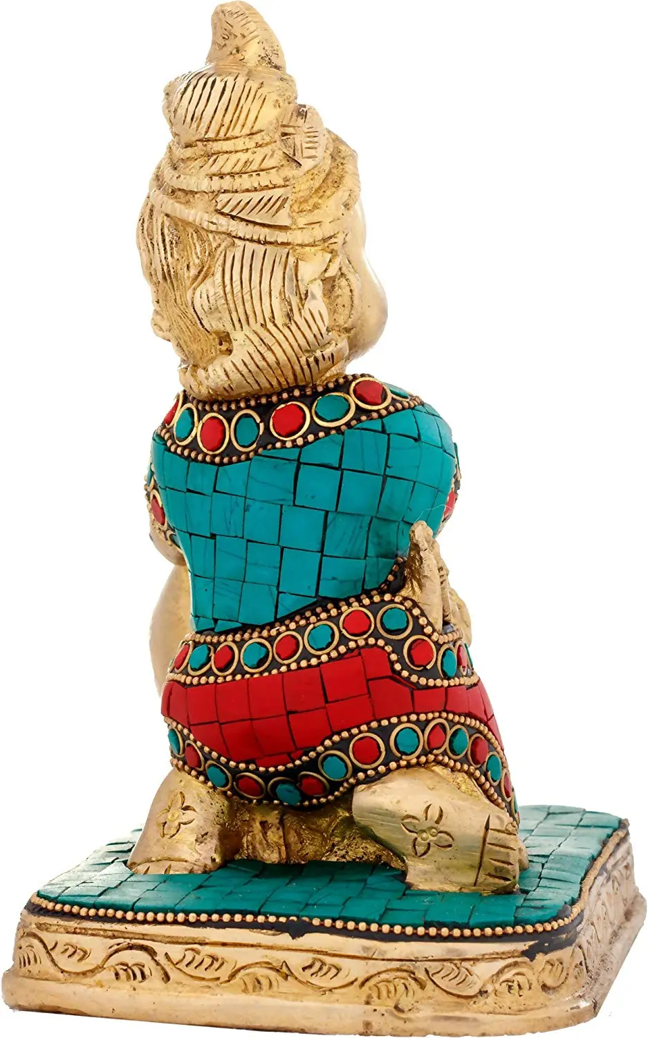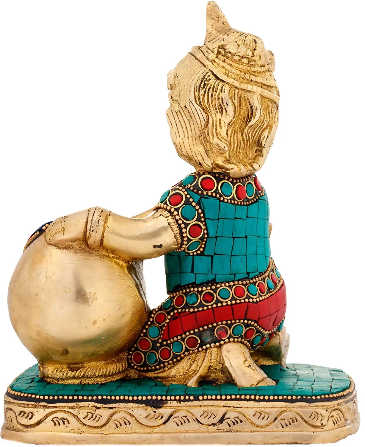 This exquisite brass statue captures a beloved moment from the life of Lord Krishna, known affectionately as "Makhan Chor" or "Butter Thief." Depicting the divine child in the act of enjoying stolen butter, this piece radiates joy and playful innocence. Krishna's mischievous spirit is palpable as he sits with a wide, contented smile, his eyes sparkling with childlike delight. His rosy cheeks and slightly parted lips suggest a world of secrets and sweet delights, just as they did in the mythical village of Gokul. The rich, golden hue of the brass lends an aura of divinity and timelessness to the sculpture. The intricate details of his attire, adorned with vibrant inlays of turquoise and coral, further enhance its aesthetic appeal. These colorful embellishments are not merely decorative; they represent the precious gems and natural beauty that surround the divine play of Lord Krishna. The contrast between the polished brass and the inset stones creates a captivating visual texture, making this statue a true work of art.