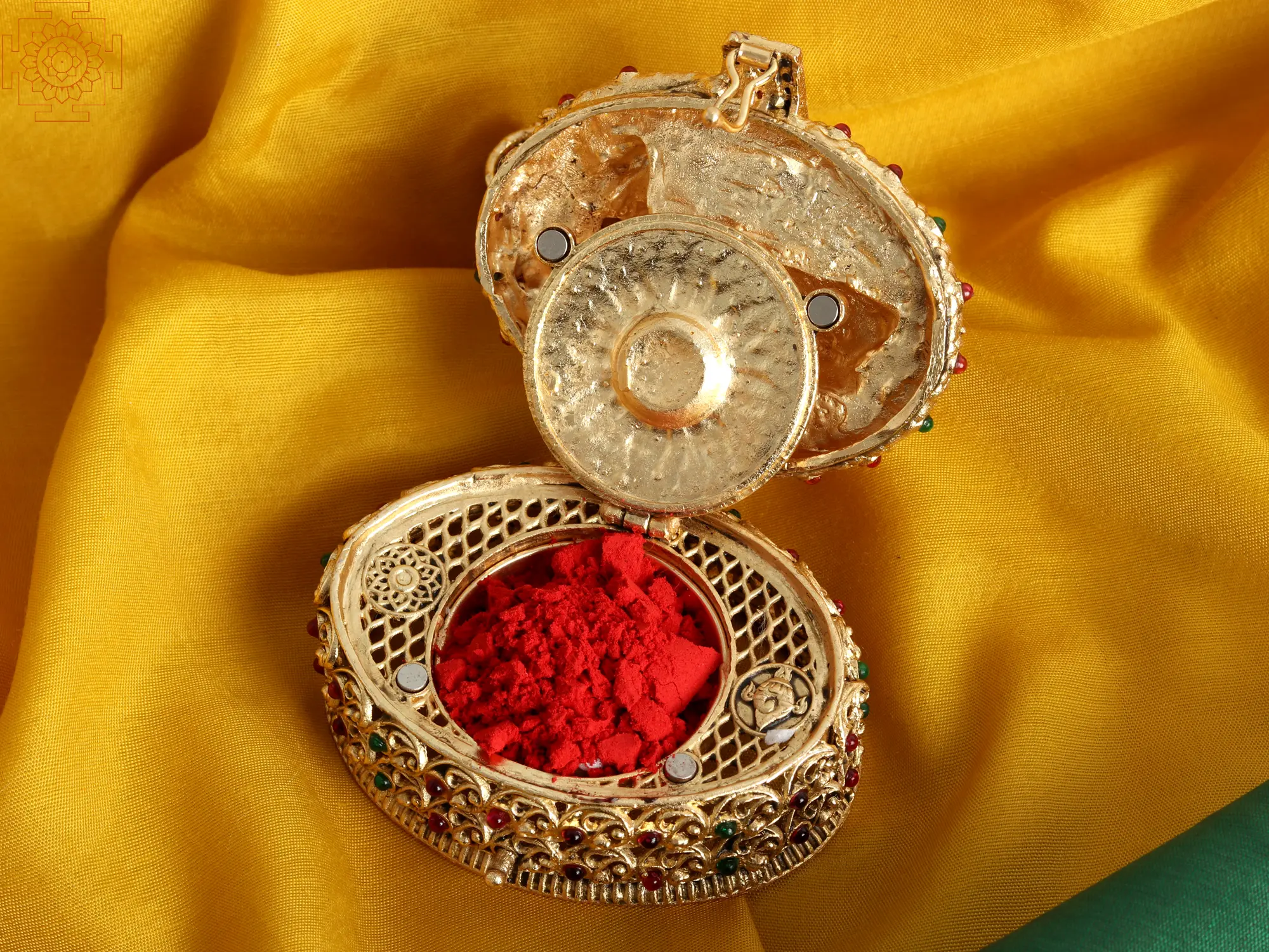 This Sindoor Box embodies the grandeur of Lord Vishnu's Shesha-Shayi form, the Vishwa Dharam or bearer of the Universe in his hands. This box combines aesthetic brilliance and spiritual meaning with elaborate brass work and red and green semi-precious stones. This fantastic combination of usefulness and spirituality allows the Sindoor or vermillion to be enhanced with Vishnu's holy meaning. The second layer under the lid is also blessed with symbols of Shankha and Chakra. Offering the deities tilak with vermillion has long been a part of Hindu rites, and this Sindoor box adds to the enchantment. It is a lovely centerpiece that evokes awe and reverence for the holy presence.