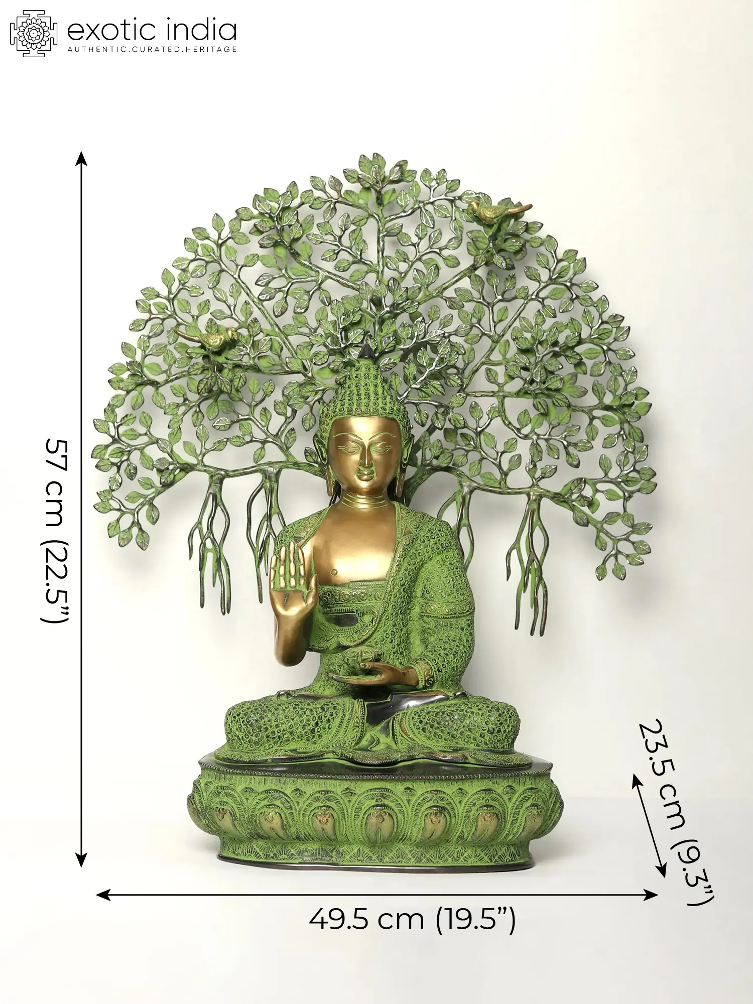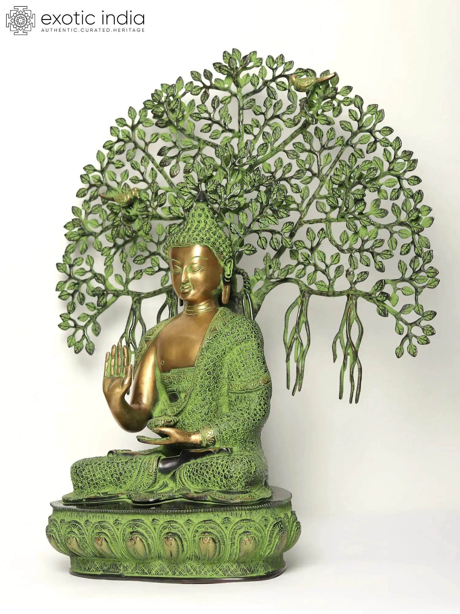 This exquisite brass statue captures the pivotal moment of Lord Buddha's spiritual awakening, a scene steeped in profound symbolism and revered across Buddhist traditions. Depicted in a serene meditation posture, the Buddha is seated upon an ornate lotus base, symbolizing purity and spiritual ascent. The intricate detailing of his robes, rendered in a vibrant green patina, speaks to the enduring connection between nature and the path to enlightenment. Above him, a majestic Bodhi tree unfurls, its branches intricately crafted to form a sacred canopy. The leaves, also finished in a verdant hue, suggest the lushness of nature that witnessed this transformative event. Delicate birds are nestled within the foliage, adding a touch of life and harmony to the scene, perhaps alluding to the celestial beings who are said to have witnessed the Buddha's enlightenment. ––––––––––