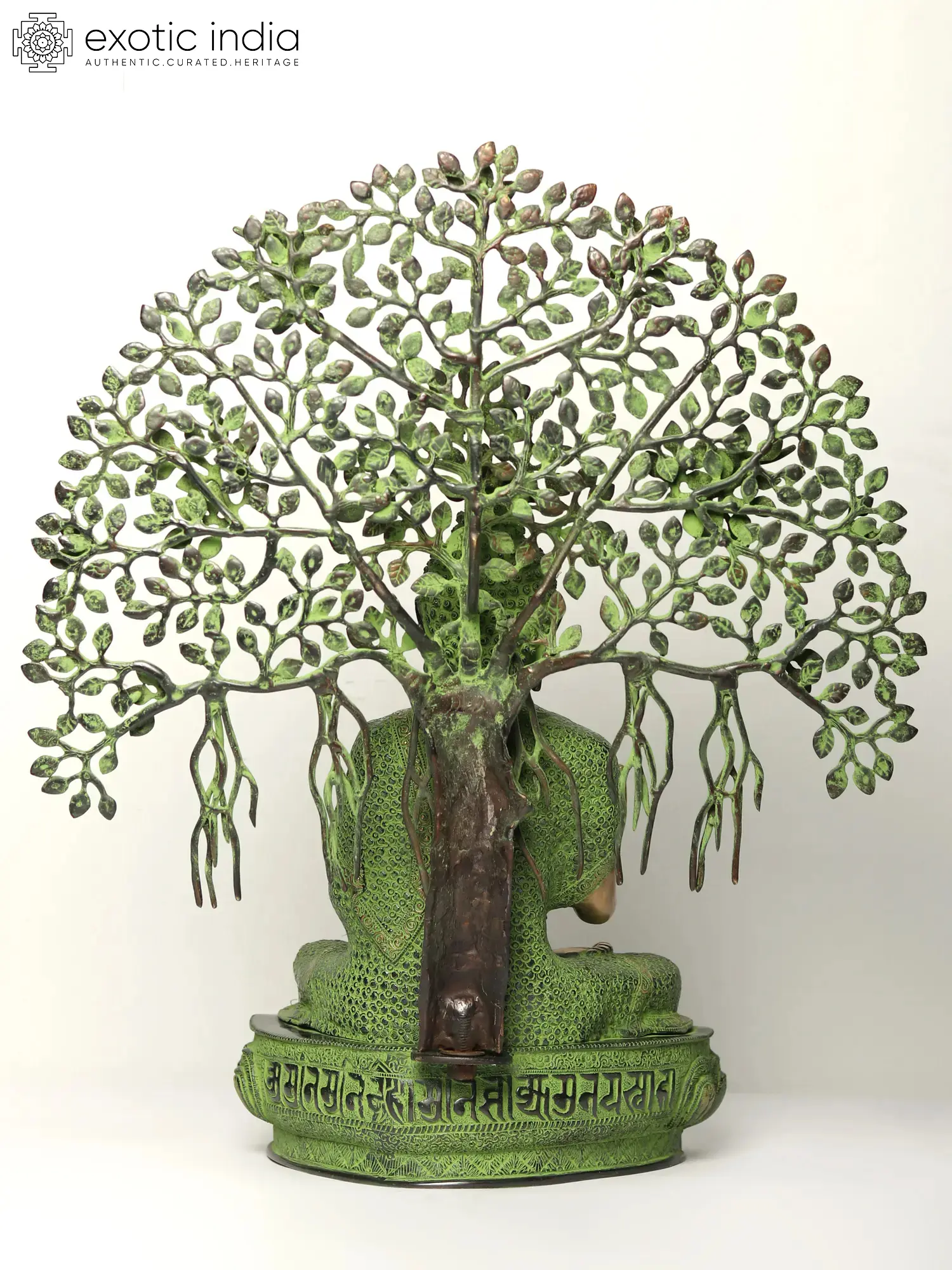 Crafted from solid brass, this statue embodies both the enduring nature of the material and the timeless spiritual message it conveys. The skilled artisans have meticulously sculpted each element, from the serene expression of the Buddha to the delicate veins of the Bodhi leaves. The green patina, applied with masterful technique, evokes the lush vitality of the sacred tree and imbues the artwork with a sense of age and venerability. The detailed carving on the lotus base further enhances the statue's aesthetic appeal, creating a focal point of intricate artistry. This piece is more than just a decorative object; it is a conduit for devotion, an invitation to contemplate the Buddha's teachings, and a tangible representation of the quest for inner peace and enlightenment. Displaying this statue in your home or meditation space can serve as a constant source of inspiration and a reminder of the profound spiritual truths that lie within us all.