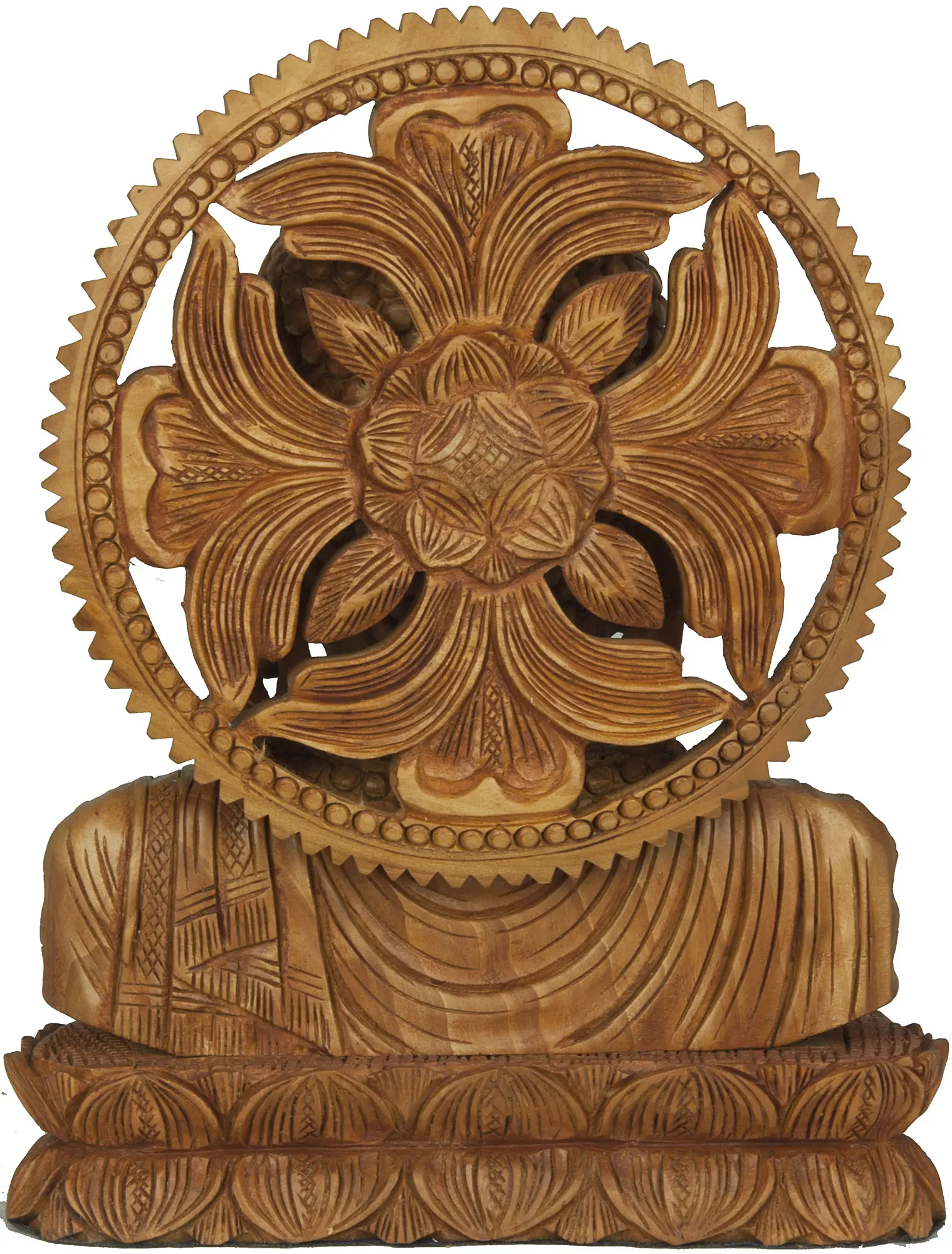 Behind Buddha's head, an intricate halo radiates outwards, symbolizing the enlightenment and wisdom emanating from him. This halo is not merely decorative; it represents the aura of divine energy and inner peace that surrounds the enlightened being. Each point of the halo is crafted with precise detail, capturing the essence of the Buddha's boundless compassion and unwavering focus.