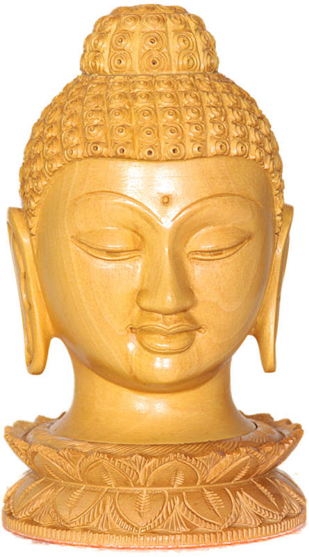 Observe the gentle curl of the hair, meticulously rendered to form the Ushnisha, symbolizing supreme wisdom. The serene expression, with closed eyes, suggests deep inner peace and detachment from worldly concerns. Resting upon a beautifully carved lotus base, a powerful symbol of purity and spiritual awakening, the dimensions of approximately 7 inches in height, 4 inches in width, and 4 inches in depth make it a substantial yet unobtrusive addition to your decor.