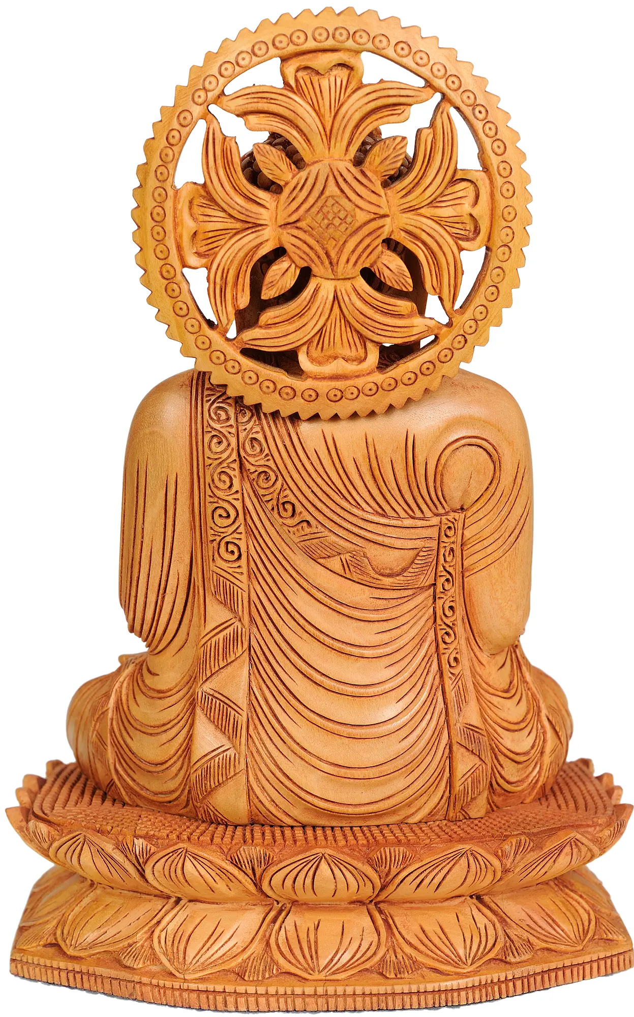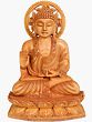 The statue is seated upon a beautifully carved lotus pedestal. The lotus, a sacred flower in many Eastern traditions, symbolizes purity, enlightenment, and rebirth. Its unfolding petals represent the journey from ignorance to wisdom, a core teaching of Buddhism. The intricately designed aureole behind Buddha's head, with its circular patterns and floral motifs, adds a celestial dimension to the sculpture, suggesting the radiant light of his enlightenment. The choice of Kadamba wood, known for its durability and beautiful texture, ensures that this piece will remain a cherished item for generations, a constant reminder of spiritual values and artistic excellence. This sculpture is more than just a decorative object; it is a conduit to peace, a symbol of courage, and a testament to the enduring legacy of the teachings of the Awakened One. It is ideally suited for meditation rooms, altars, or any area where a touch of spiritual serenity and profound beauty is desired.