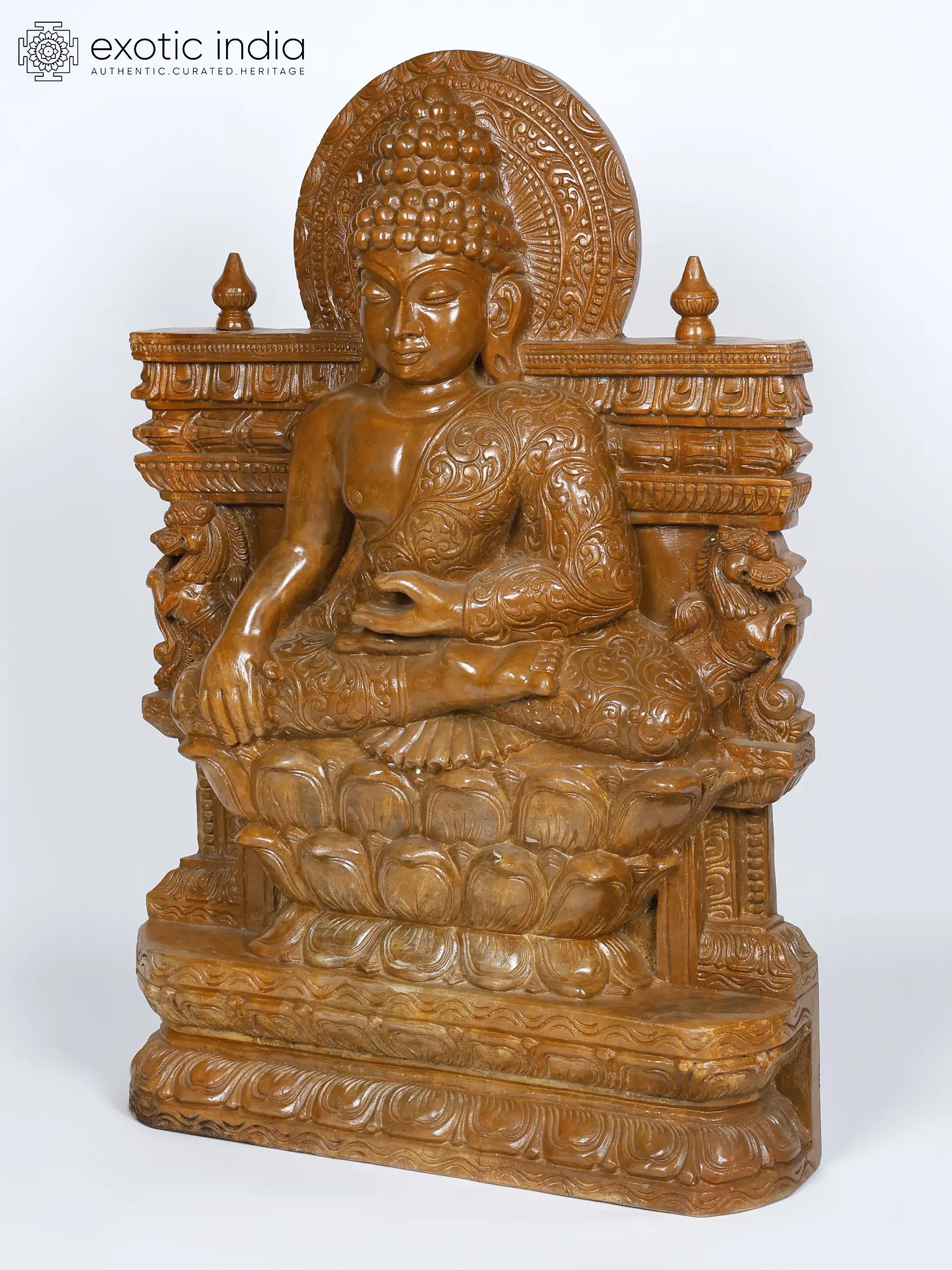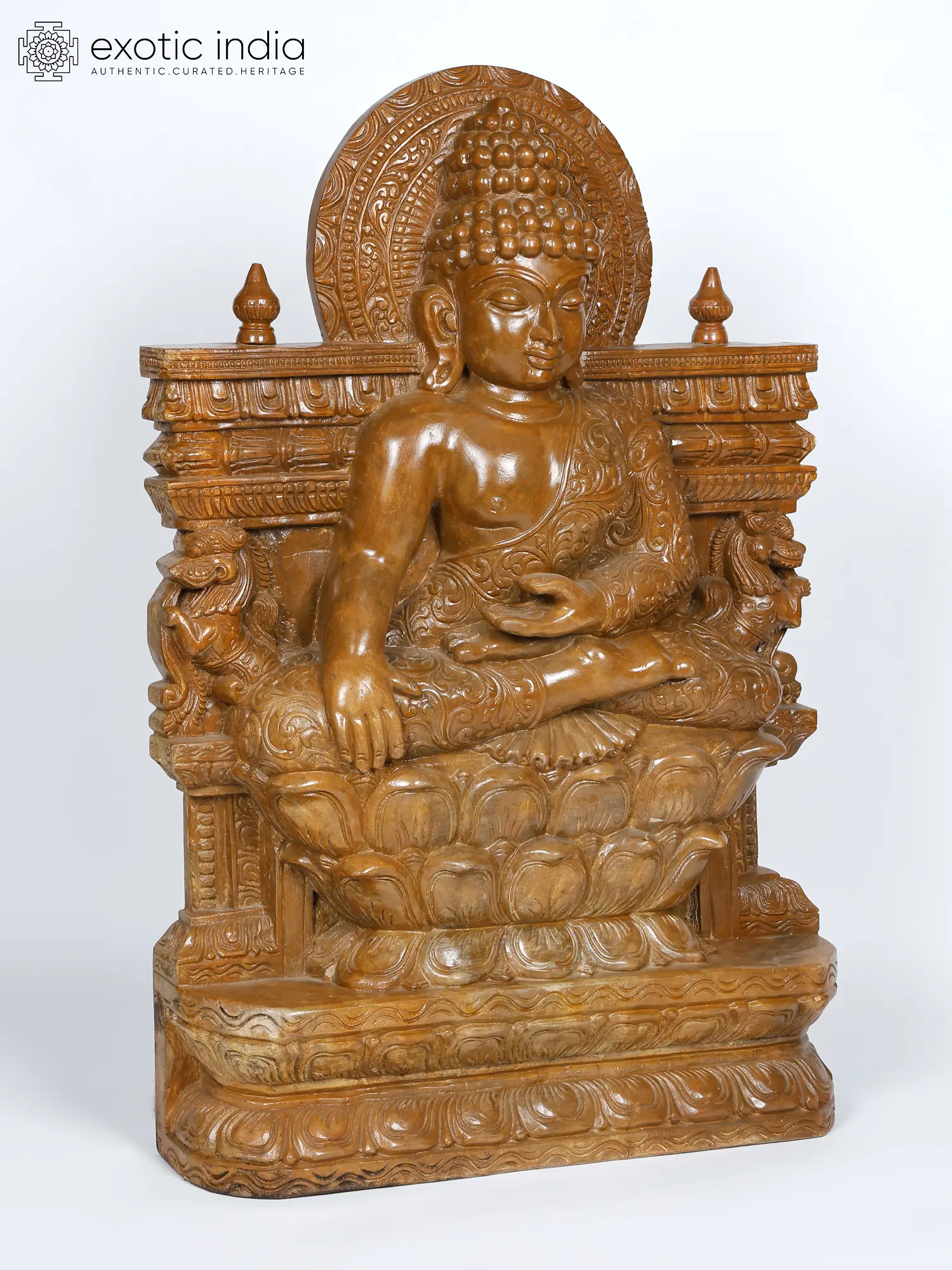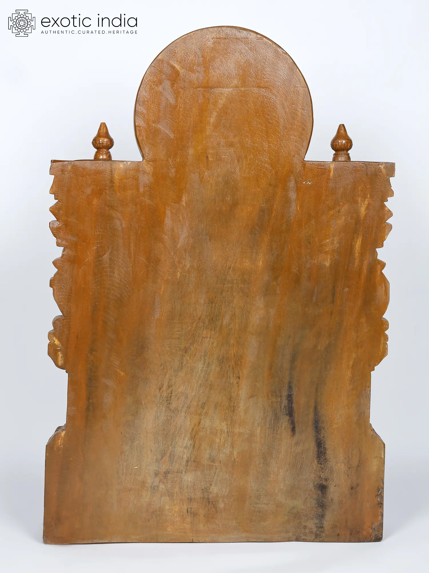 This exquisite sculpture is a testament to the rich artistic traditions of South India, where temple carvings have flourished for centuries. Skilled artisans, deeply immersed in the spiritual and philosophical tenets of Buddhism, painstakingly bring these divine forms to life. The choice of wood as a medium reflects the inherent connection between the human spirit and the natural world. Each piece of wood possesses its own unique grain and character, lending an individual quality to the final artwork. The meticulous carving captures not only the physical form but also the inner essence of the deity, transforming the wood into a sacred object of devotion. The embellishments and surrounding ornamentation are indicative of the South Indian aesthetic, showcasing meticulous attention to detail and artistic finesse. The carving serves as a portal, inviting the viewer to connect with the teachings of the Buddha and embark on their own journey of self-discovery.