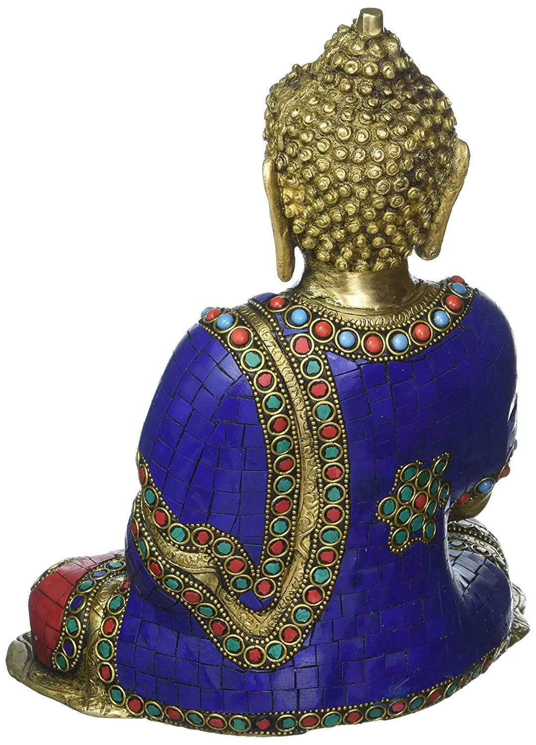This exquisite brass statue captures the profound stillness and grace of Lord Buddha in the Bhumisparsha Mudra, often referred to as the "Earth-Touching" gesture. The radiant brass, meticulously crafted, gleams with an aura of timeless wisdom. Adorned with vibrant mosaic inlays of deep blue, rich red, and serene green, this representation of the awakened one is a feast for the eyes and a balm for the soul. Each inlaid stone, reminiscent of lapis lazuli, carnelian, and jade, adds a touch of regal splendor, symbolizing the rich tapestry of spiritual understanding. ––––––––––
