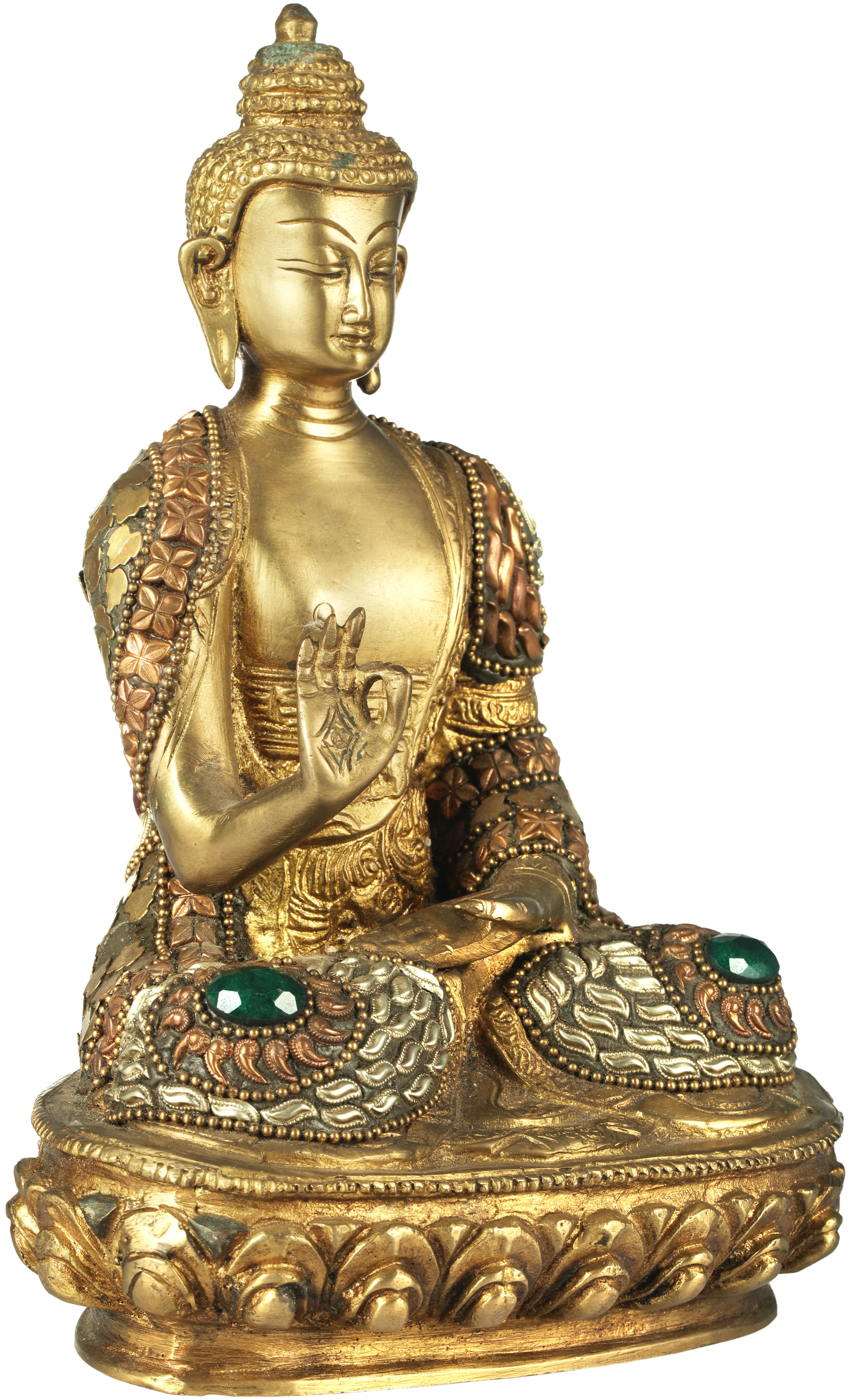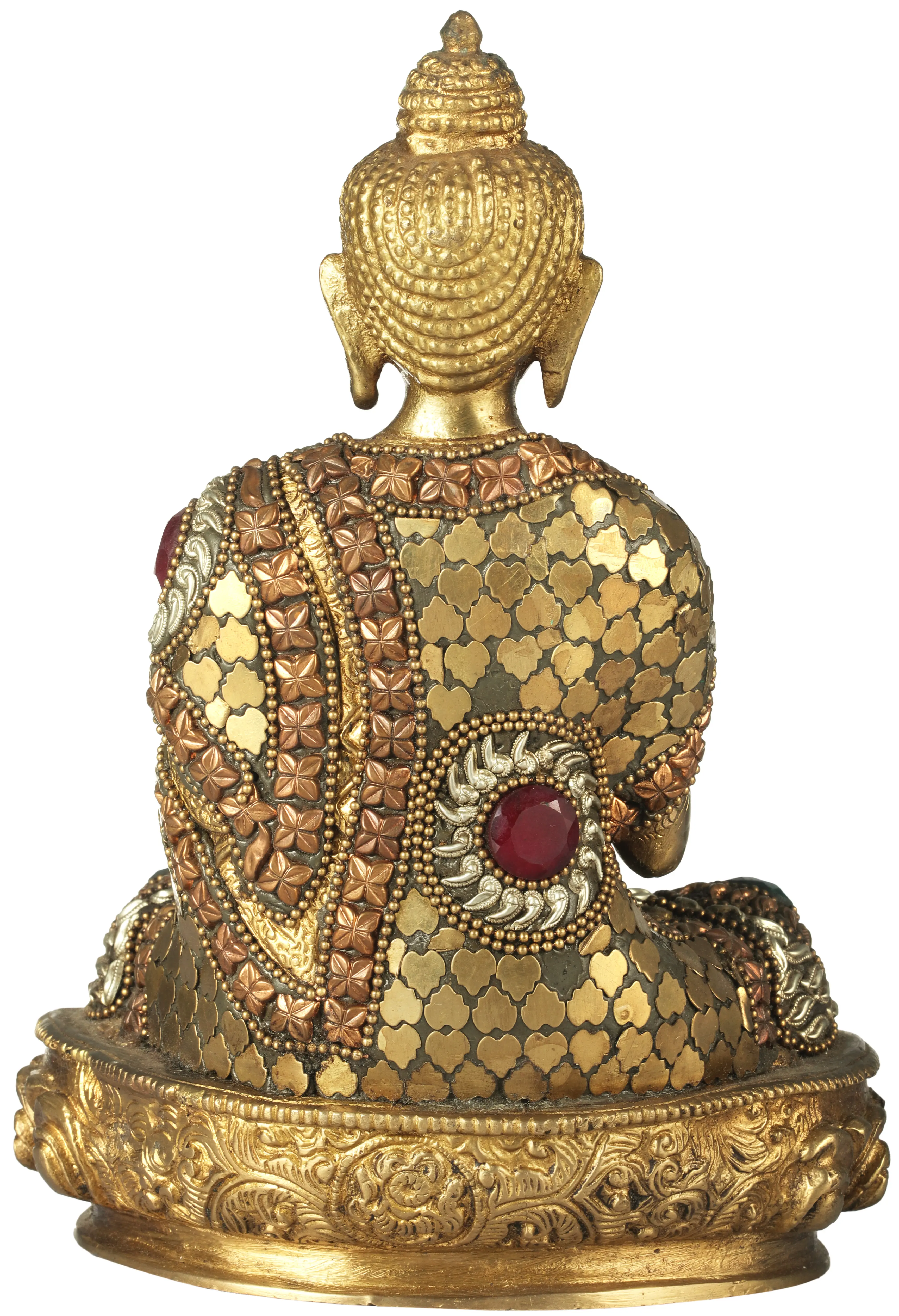 Crafted from high-quality brass, this statue is elevated by intricate inlay work, a hallmark of Tibetan artistry. The robes of the Buddha are adorned with a tapestry of small, repeating motifs, rendered in contrasting metallic tones that create a sense of depth and richness. These decorative elements are not merely ornamental; they represent the intricate layers of understanding and the vastness of the teachings he imparts. The strategically placed gemstones, a deep red on the shoulder and vibrant green on the base, add a touch of regal splendor and symbolize the preciousness of the Buddha's teachings and the transformative power of enlightenment. The base itself is ornately carved, featuring stylized lotus petals, a symbol of purity and spiritual rebirth, further enhancing the sacred aura of the piece.