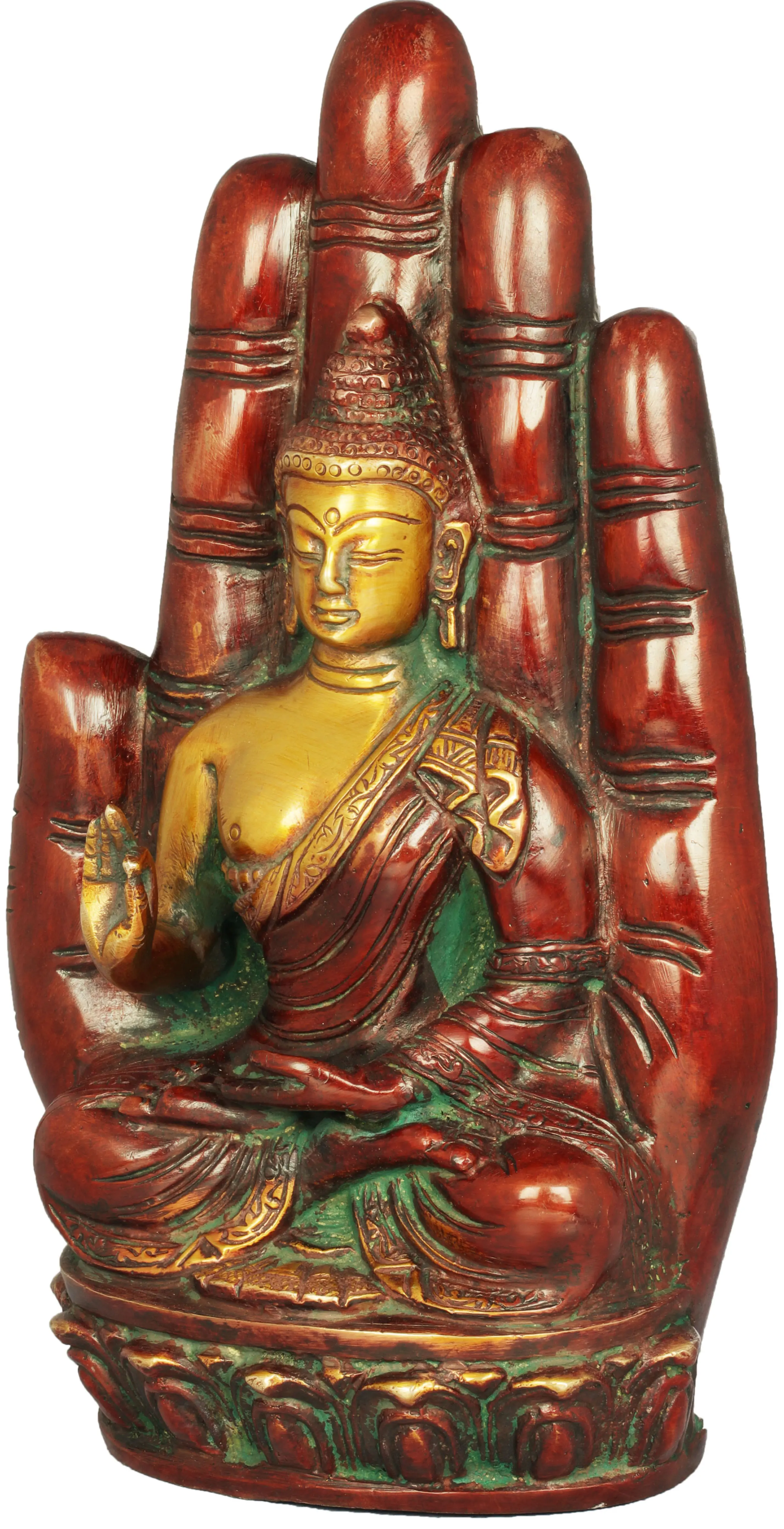 This exquisite brass statue depicts the serene form of Lord Buddha, seated in a contemplative posture upon a vibrant lotus blossom. The artistry extends beyond the central figure, cradling the Buddha within the protective embrace of a stylized hand. This hand, rendered in a deep, rich brass with striking green accents, symbolizes the divine guidance and encompassing compassion offered by the Buddha, a gesture often seen in Buddhist iconography representing the transmission of wisdom. The intricate details, from the Buddha's serene expression and urna on his forehead to the delicate folds of his monastic robe, speak to the skilled hands of Indian artisans who have brought this sacred imagery to life.