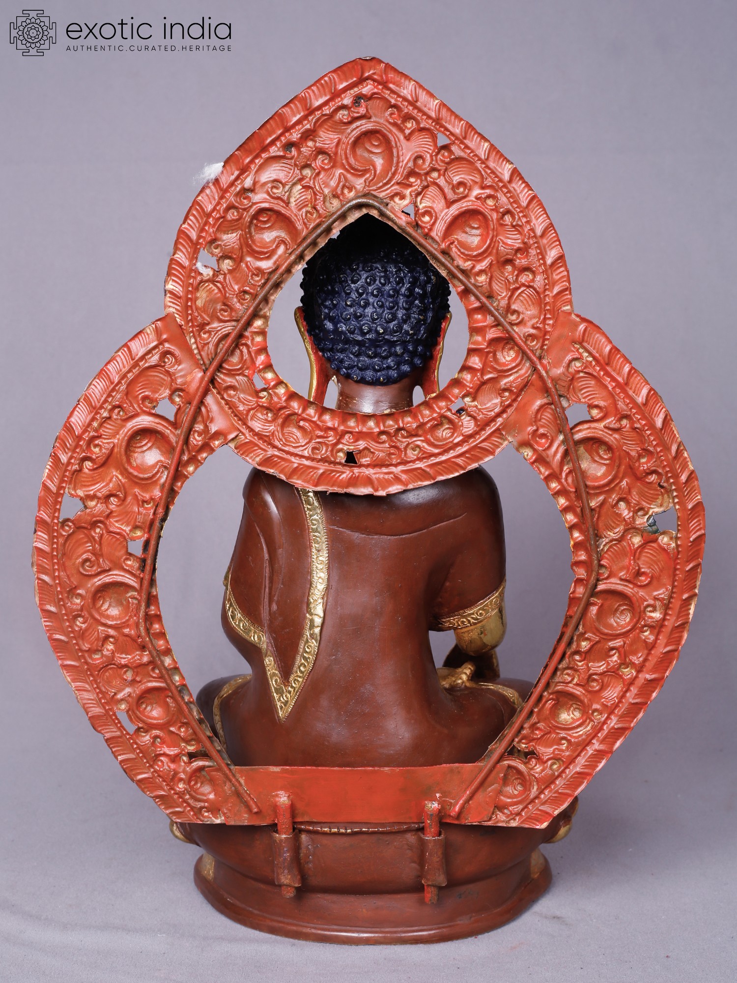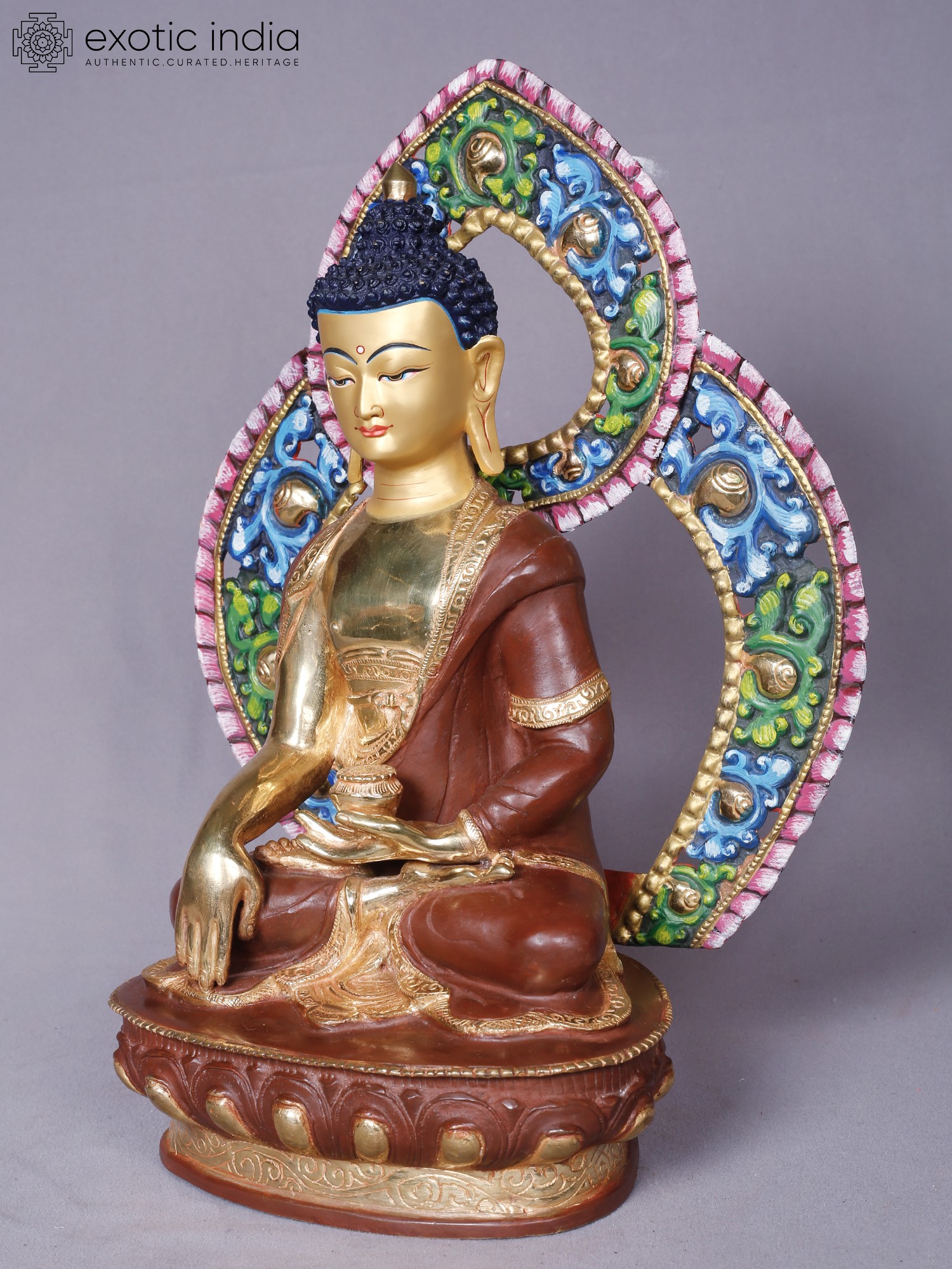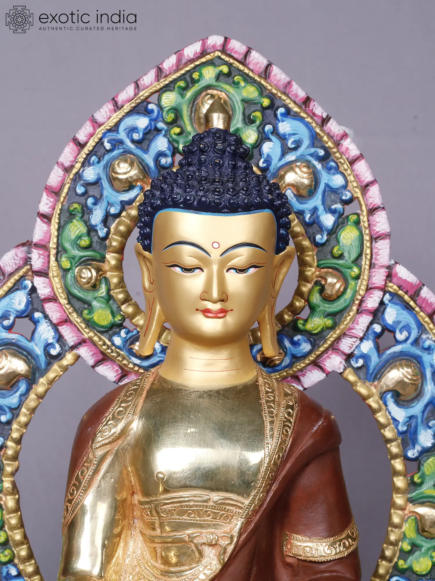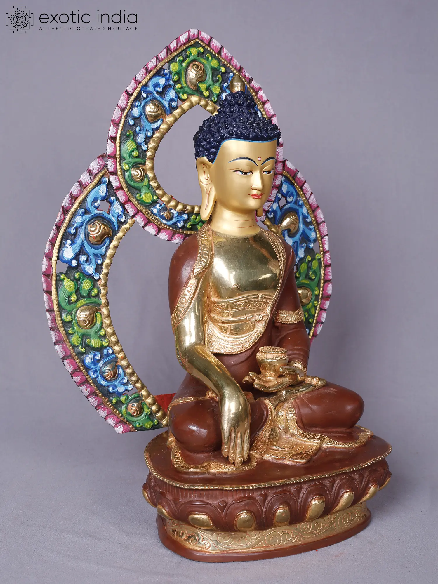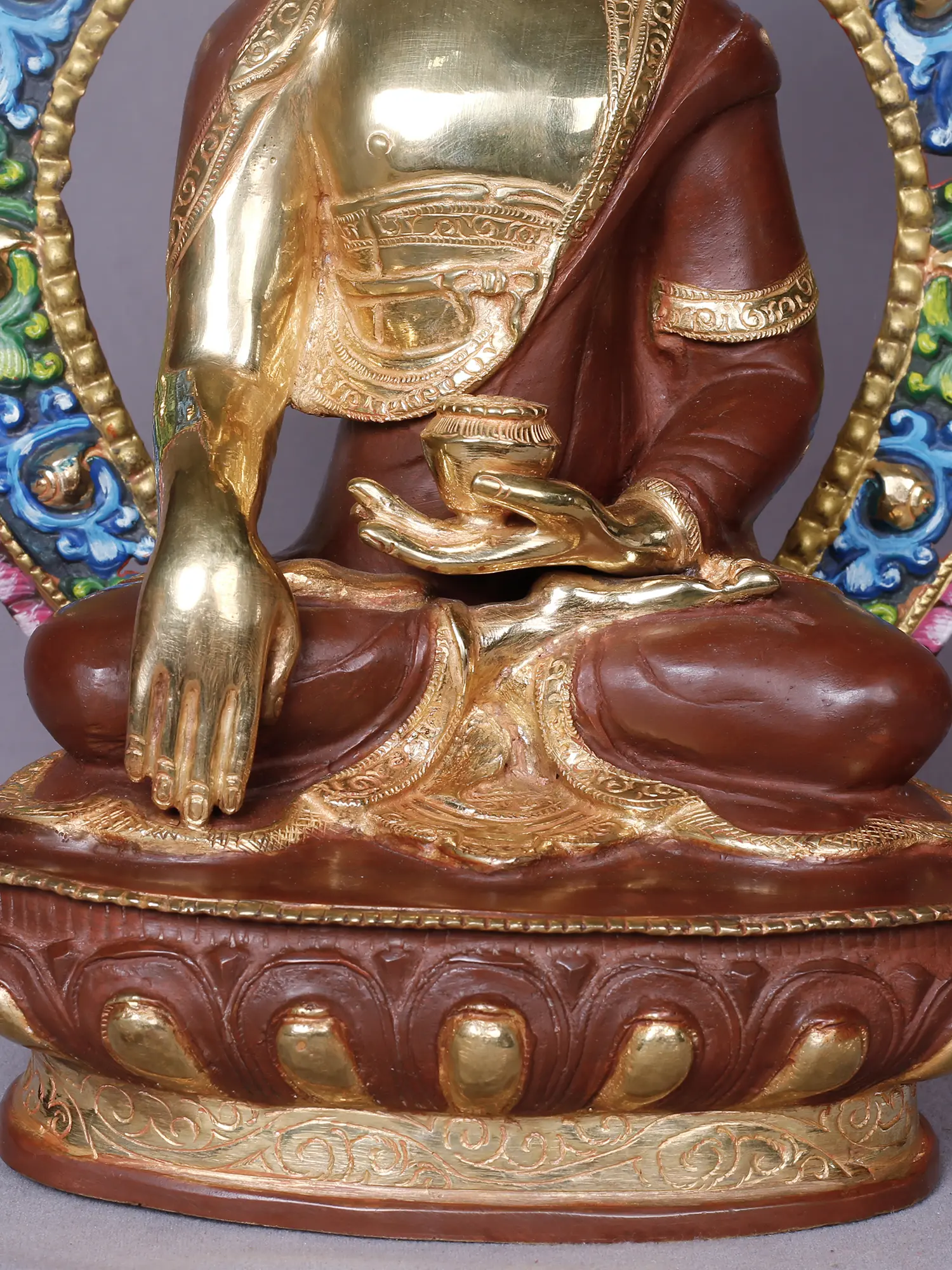 Observe the captivating aura that surrounds the enlightened one, rendered in a symphony of vibrant colors and intricate patterns. The golden sheen of the face and hands, contrasted with the rich, earthy tones of the robes, creates a visually stunning composition. The detailed carving of the lotus base and the elaborately ornamented aureole further enhance its majestic appeal, standing at a commanding 14 inches tall.