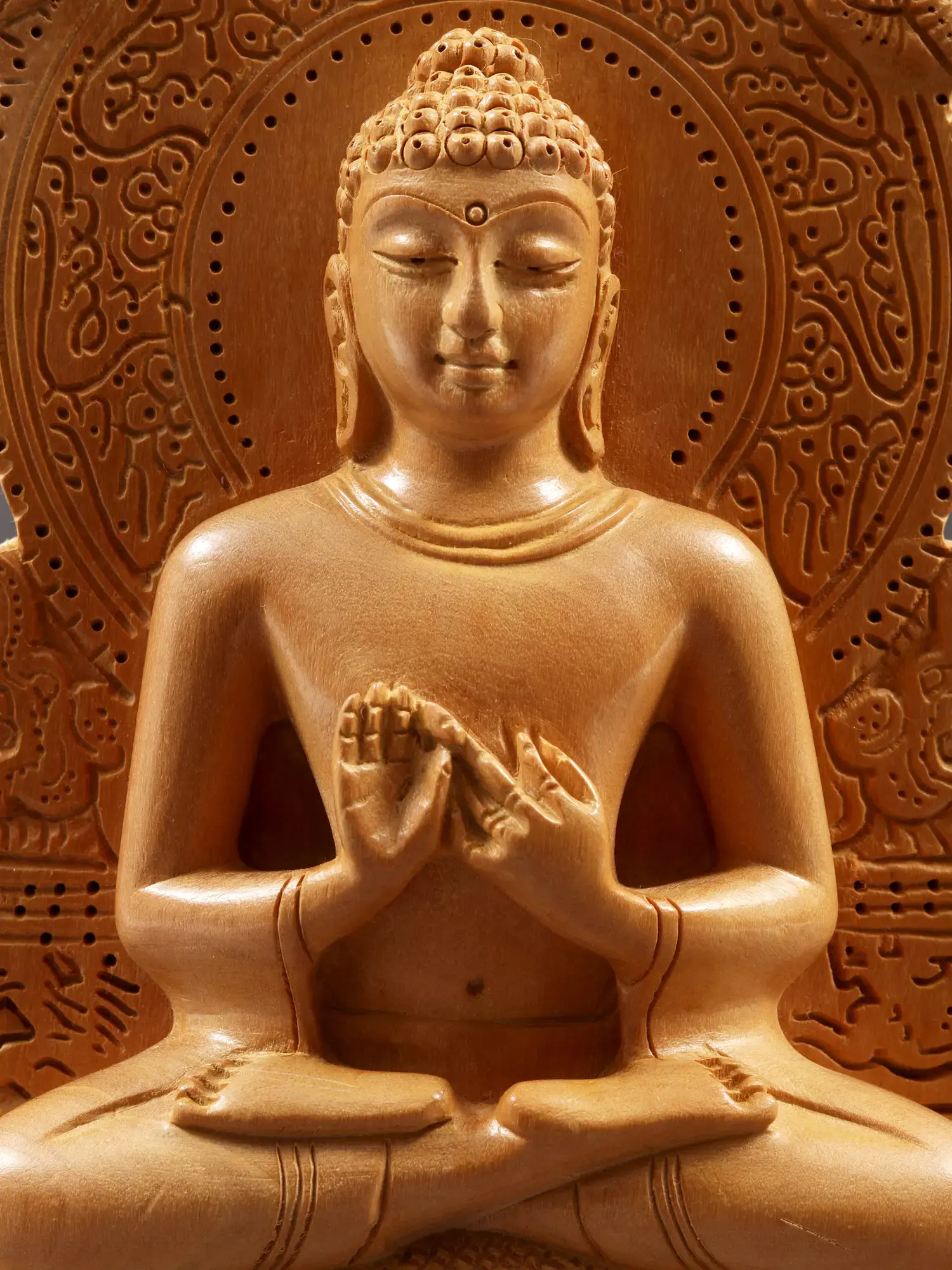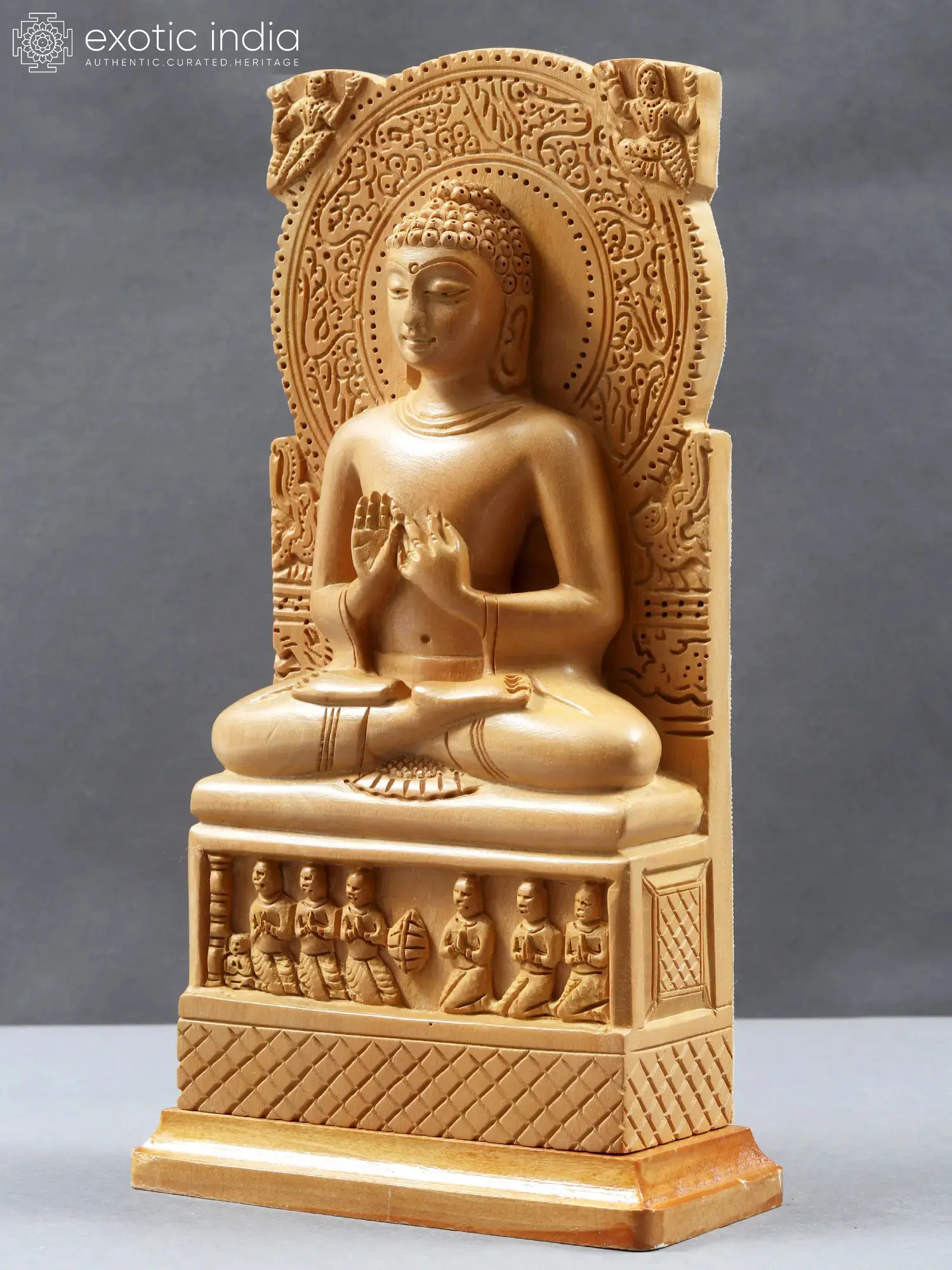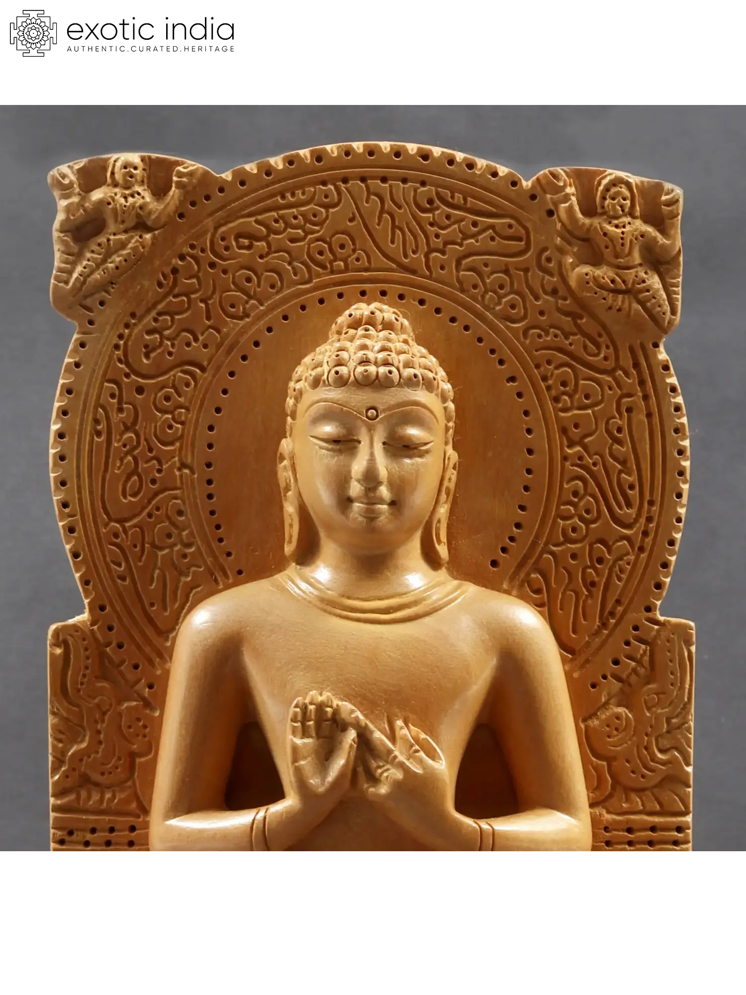 In the tranquil enclave of Sarnath, beneath the dappled shade of ancient trees, the Lord Buddha, in all His profound serenity, graces the world with an enchanting wooden statue. Crafted from the revered “Kaima Wood” by the skilled hands of the “Vishwakarma family of Varanasi”, this masterpiece exudes a divine aura. Here, “Lord Buddha” sits in the “Dharmachakra Mudra”, the “Wheel of Dharma” poised to turn and illuminate the path to enlightenment. His eyes, eternally compassionate, whisper tales of ancient wisdom to all who gaze upon this work of art. This marvellous statue is a tribute to the sacred legacy of Buddhism, an everlasting emblem of peace.