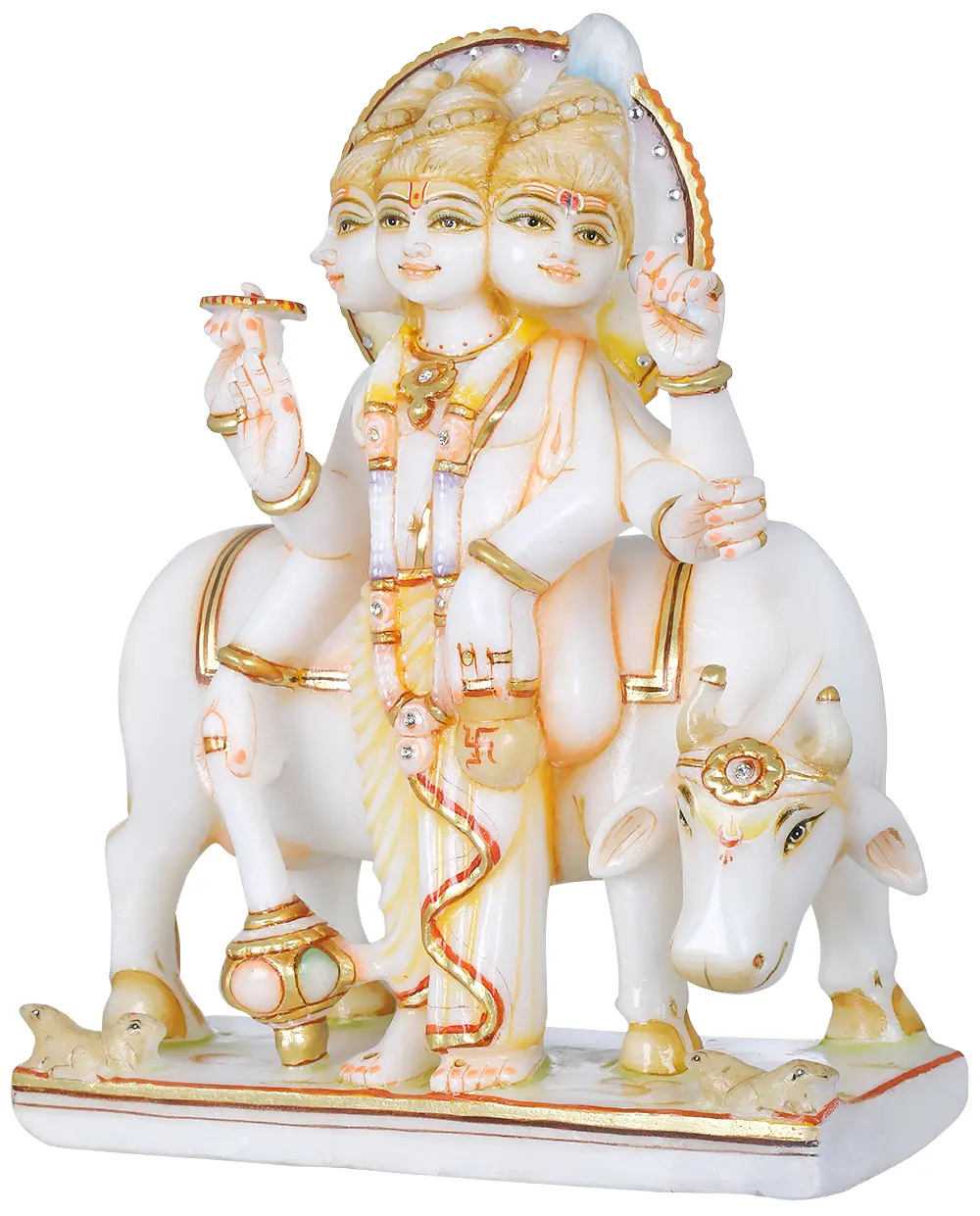 The four dogs on either side of the pedestal represent the four vedas or the four yugas and the holy cow behind him is symbolic of Mother Earth and abundance. Look carefully at the three faces, left is of Lord Shiva, centre one is Vishnu and the right is Brahma, as can be identified by the glorifying tilak on their forehead and Shiva’s third eye. The very essence of this sculpture generates vibes of positive spirituality and the shiny texture portrays his magnified beauty.