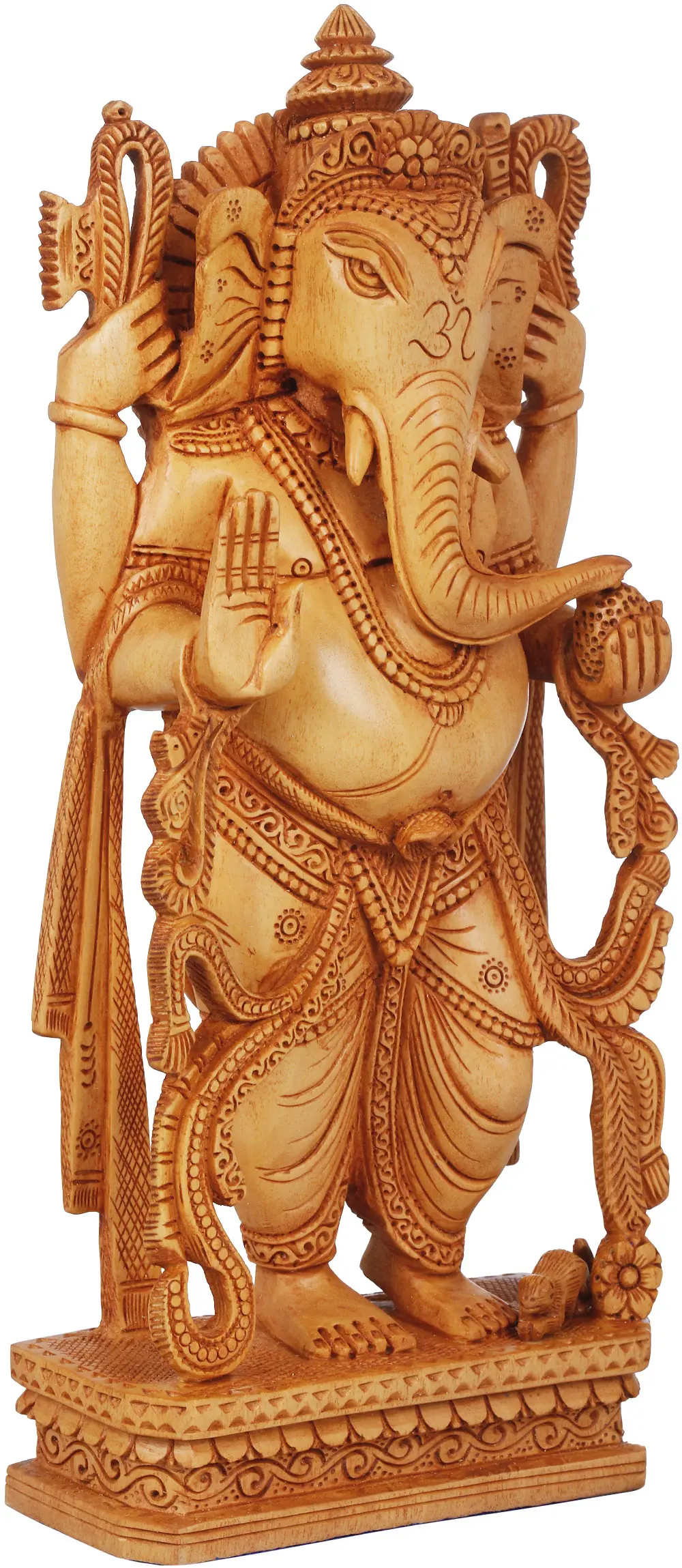 This is a very graceful, light weighted, standing wooden statue of Lord Ganapati. He is the most popular of the Hindu deities worshipped by all sections of the Hindus. He is revered as the remover of obstacles and no undertaking, whether sacred or secular, can get started without honouring worshipping him. He is honored as the god of beginnings. He is easily identifiable because of his elephant like head given by Mother Parvati and Lord Shiva.