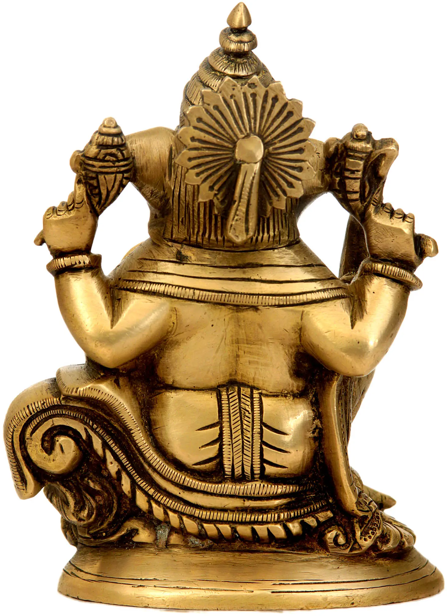 In the tapestry of Hindu mythology, few deities are as beloved and widely revered as Ganesha, the elephant-headed god. He is known by many names – Ganapati, Vinayaka, Vignaharta – each reflecting a facet of his power and benevolence. He stands as the embodiment of wisdom, prosperity, and good fortune, and is invoked at the beginning of new ventures and ceremonies to remove obstacles and ensure success. This beautiful brass sculpture captures the essence of his divine presence, inviting positive energy and auspiciousness into your space. Crafted with meticulous detail, this statue portrays Ganesha seated in a relaxed posture, radiating an aura of serenity and power. His large belly, a symbol of abundance and acceptance, is adorned with a delicate necklace. The intricate carvings on his trunk, tusks, and headdress highlight the artisan's dedication to bringing this sacred figure to life. Notice the thoughtful design of his four arms, each holding symbolic items that represent different aspects of his divinity. One hand offers blessings to his devotees, while another holds a sweet delicacy, a reminder of the sweetness of life and spiritual fulfillment.