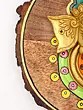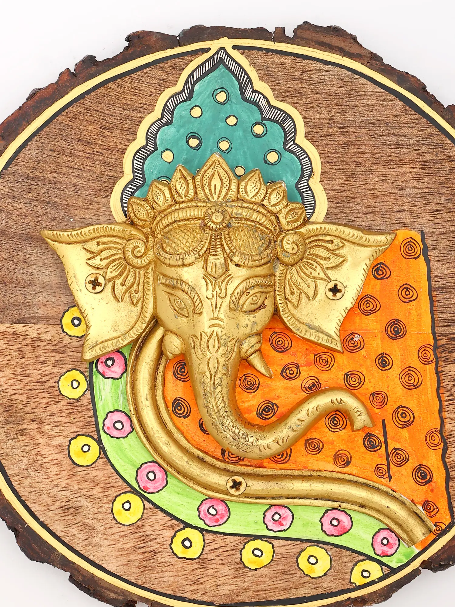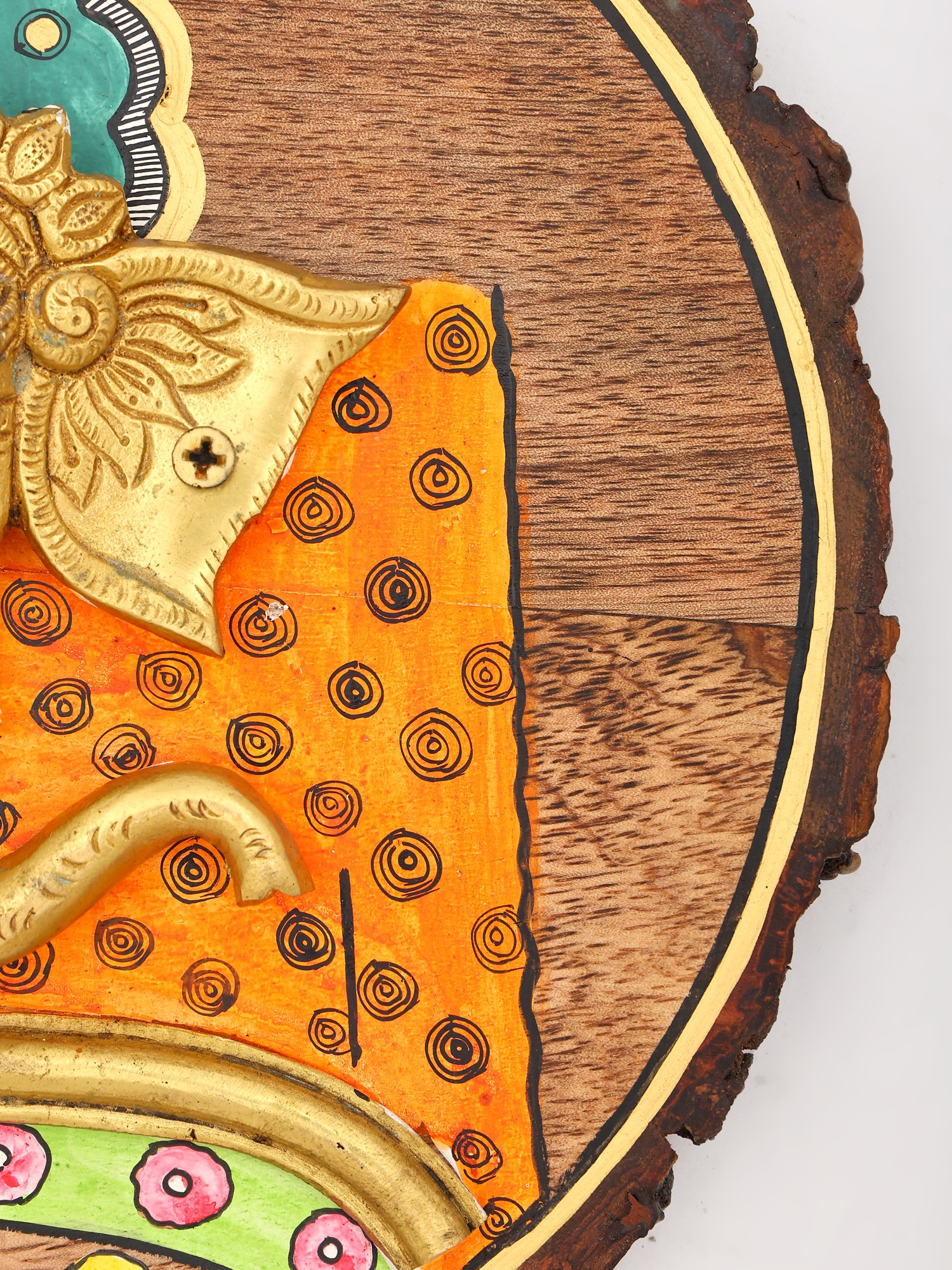 Observe the intricate detailing that brings this sacred image to life. The brass form is a testament to skilled metalwork, while the surrounding hand-painted elements offer a burst of color and lively pattern. A decorative headdress crowns the figure, rendered in shades of turquoise and black with delicate dotwork, creating an ethereal aura. The vibrant orange fabric, adorned with swirling motifs, is complemented by a green border featuring cheerful floral accents in pink and yellow. This thoughtful composition, within its roughly nine-inch circular frame, balances the metallic sheen with painted vibrancy, creating a visually harmonious piece.