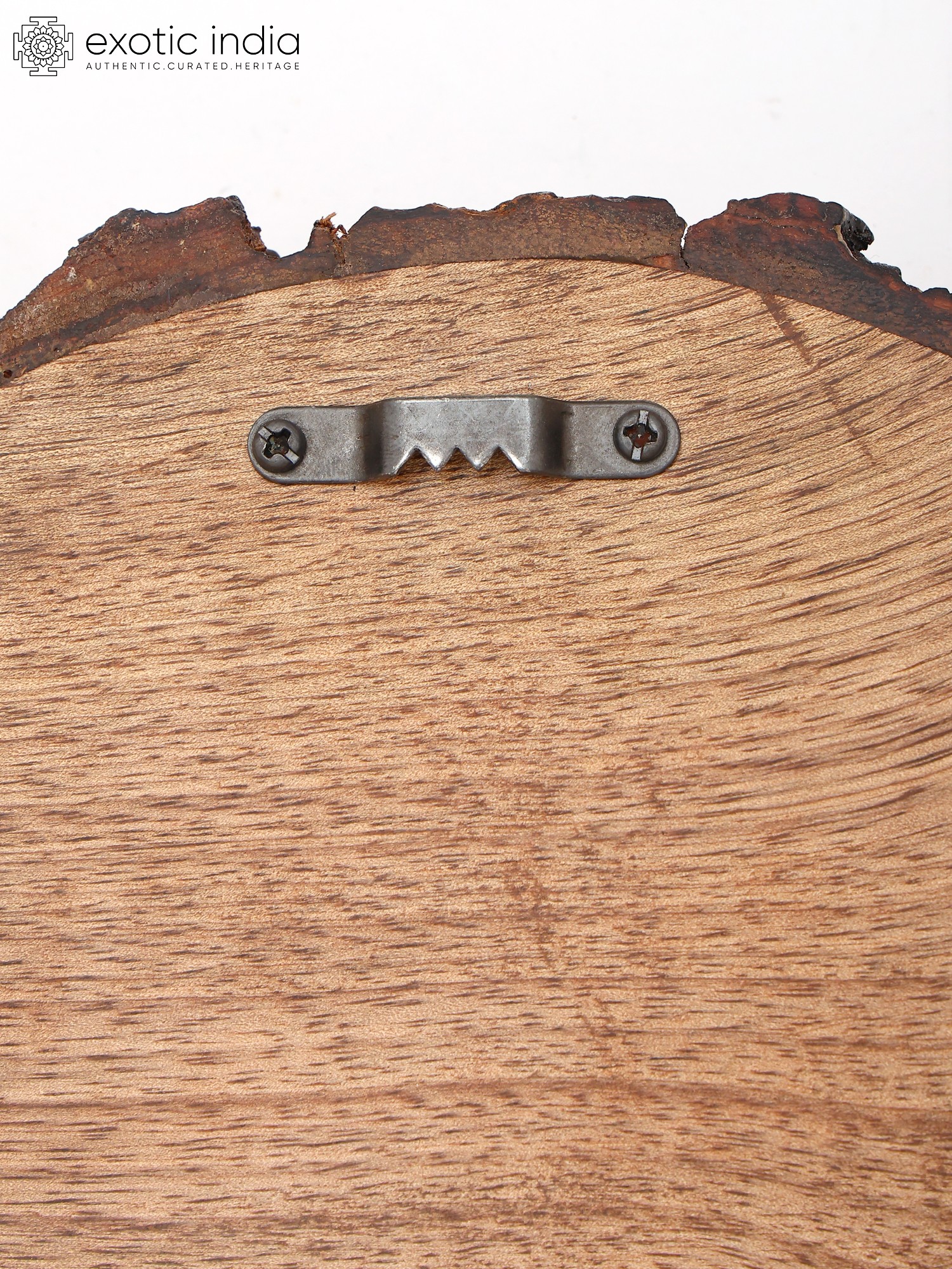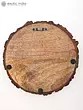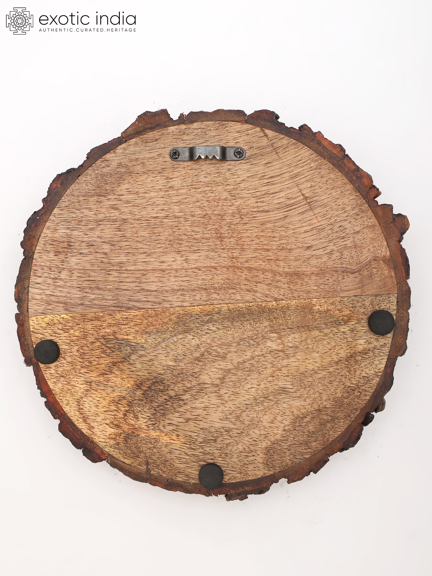 Set on a hand-painted wood round with a natural bark edge.